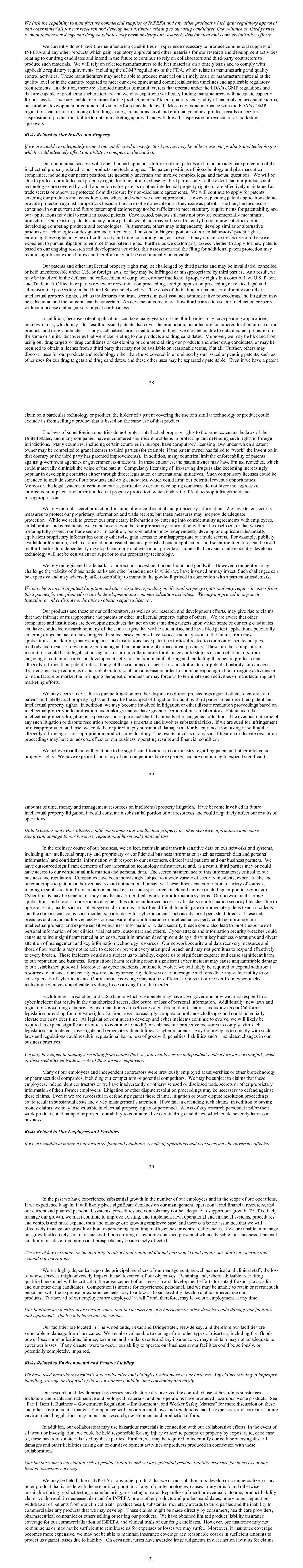 We lack the capability to manufacture commercial supplies of INPEFA and any other products which gain regulatory approval and other materials for our research and development activities relating to our drug candidates. Our reliance on third parties to manufacture our drugs and drug candidates may harm or delay our research, development and commercialization efforts. We currently do not have the manufacturing capabilities or experience necessary to produce commercial supplies of INPEFA and any other products which gain regulatory approval and other materials for our research and development activities relating to our drug candidates and intend in the future to continue to rely on collaborators and third-party contractors to produce such materials. We will rely on selected manufacturers to deliver materials on a timely basis and to comply with applicable regulatory requirements, including the cGMP regulations of the FDA, which relate to manufacturing and quality control activities. These manufacturers may not be able to produce material on a timely basis or manufacture material at the quality level or in the quantity required to meet our development and commercialization timelines and applicable regulatory requirements. In addition, there are a limited number of manufacturers that operate under the FDA’s cGMP regulations and that are capable of producing such materials, and we may experience difficulty finding manufacturers with adequate capacity for our needs. If we are unable to contract for the production of sufficient quantity and quality of materials on acceptable terms, our product development or commercialization efforts may be delayed. Moreover, noncompliance with the FDA’s cGMP regulations can result in, among other things, fines, injunctions, civil and criminal penalties, product recalls or seizures, suspension of production, failure to obtain marketing approval and withdrawal, suspension or revocation of marketing approvals. Risks Related to Our Intellectual Property If we are unable to adequately protect our intellectual property, third parties may be able to use our products and technologies, which could adversely affect our ability to compete in the market. Our commercial success will depend in part upon our ability to obtain patents and maintain adequate protection of the intellectual property related to our products and technologies. The patent positions of biotechnology and pharmaceutical companies, including our patent position, are generally uncertain and involve complex legal and factual questions. We will be able to protect our intellectual property rights from unauthorized use by third parties only to the extent that our products and technologies are covered by valid and enforceable patents or other intellectual property rights, or are effectively maintained as trade secrets or otherwise protected from disclosure by non-disclosure agreements. We will continue to apply for patents covering our products and technologies as, where and when we deem appropriate. However, pending patent applications do not provide protection against competitors because they are not enforceable until they issue as patents. Further, the disclosures contained in our current and future patent applications may not be sufficient to meet statutory requirements for patentability and our applications may fail to result in issued patents. Once issued, patents still may not provide commercially meaningful protection. Our existing patents and any future patents we obtain may not be sufficiently broad to prevent others from developing competing products and technologies. Furthermore, others may independently develop similar or alternative products or technologies or design around our patents. If anyone infringes upon our or our collaborators’ patent rights, enforcing these rights may be difficult, costly and time-consuming and, as a result, it may not be cost-effective or otherwise expedient to pursue litigation to enforce those patent rights. Further, as we customarily assess whether to apply for new patents based on our ongoing research and development activities, this assessment and the filing for additional patent protection may require significant expenditures and therefore may not be commercially practicable. Our patents and other intellectual property rights may be challenged by third parties and may be invalidated, cancelled or held unenforceable under U.S. or foreign laws, or they may be infringed or misappropriated by third parties. As a result, we may be involved in the defense and enforcement of our patent or other intellectual property rights in a court of law, U.S. Patent and Trademark Office inter partes review or reexamination proceeding, foreign opposition proceeding or related legal and administrative proceeding in the United States and elsewhere. The costs of defending our patents or enforcing our other intellectual property rights, such as trademarks and trade secrets, in post-issuance administrative proceedings and litigation may be substantial and the outcome can be uncertain. An adverse outcome may allow third parties to use our intellectual property without a license and negatively impact our business. In addition, because patent applications can take many years to issue, third parties may have pending applications, unknown to us, which may later result in issued patents that cover the production, manufacture, commercialization or use of our products and drug candidates. If any such patents are issued to other entities, we may be unable to obtain patent protection for the same or similar discoveries that we make relating to our products and drug candidates. Moreover, we may be blocked from using our drug targets or drug candidates or developing or commercializing our products and other drug candidates, or may be required to obtain a license from a third party that may not be available on reasonable terms, if at all. Further, others may discover uses for our products and tec