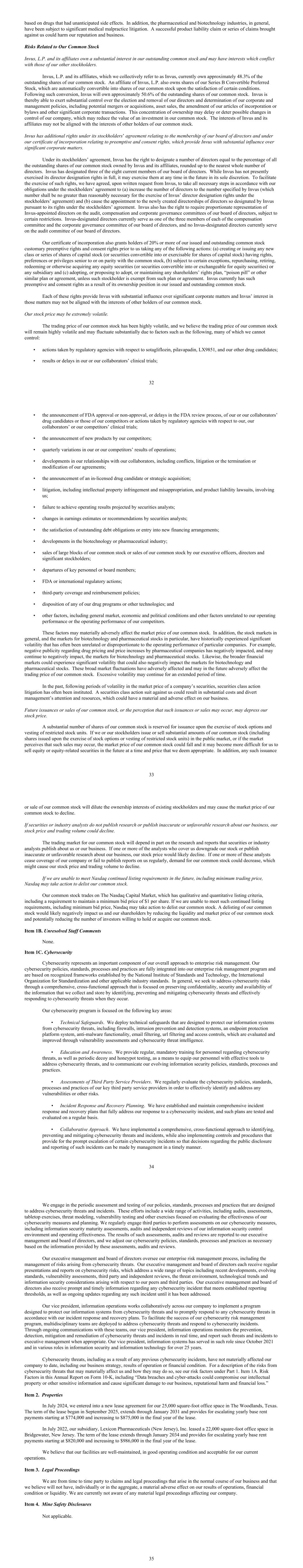 based on drugs that had unanticipated side effects. In addition, the pharmaceutical and biotechnology industries, in general, have been subject to significant medical malpractice litigation. A successful product liability claim or series of claims brought against us could harm our reputation and business. Risks Related to Our Common Stock Invus, L.P. and its affiliates own a substantial interest in our outstanding common stock and may have interests which conflict with those of our other stockholders. Invus, L.P. and its affiliates, which we collectively refer to as Invus, currently own approximately 48.3% of the outstanding shares of our common stock. An affiliate of Invus, L.P. also owns shares of our Series B Convertible Preferred Stock, which are automatically convertible into shares of our common stock upon the satisfaction of certain conditions. Following such conversion, Invus will own approximately 50.6% of the outstanding shares of our common stock. Invus is thereby able to exert substantial control over the election and removal of our directors and determination of our corporate and management policies, including potential mergers or acquisitions, asset sales, the amendment of our articles of incorporation or bylaws and other significant corporate transactions. This concentration of ownership may delay or deter possible changes in control of our company, which may reduce the value of an investment in our common stock. The interests of Invus and its affiliates may not be aligned with the interests of other holders of our common stock. Invus has additional rights under its stockholders’ agreement relating to the membership of our board of directors and under our certificate of incorporation relating to preemptive and consent rights, which provide Invus with substantial influence over significant corporate matters. Under its stockholders’ agreement, Invus has the right to designate a number of directors equal to the percentage of all the outstanding shares of our common stock owned by Invus and its affiliates, rounded up to the nearest whole number of directors. Invus has designated three of the eight current members of our board of directors. While Invus has not presently exercised its director designation rights in full, it may exercise them at any time in the future in its sole discretion. To facilitate the exercise of such rights, we have agreed, upon written request from Invus, to take all necessary steps in accordance with our obligations under the stockholders’ agreement to (a) increase the number of directors to the number specified by Invus (which number shall be no greater than reasonably necessary for the exercise of Invus’ director designation rights under the stockholders’ agreement) and (b) cause the appointment to the newly created directorships of directors so designated by Invus pursuant to its rights under the stockholders’ agreement. Invus also has the right to require proportionate representation of Invus-appointed directors on the audit, compensation and corporate governance committees of our board of directors, subject to certain restrictions. Invus-designated directors currently serve as one of the three members of each of the compensation committee and the corporate governance committee of our board of directors, and no Invus-designated directors currently serve on the audit committee of our board of directors. Our certificate of incorporation also grants holders of 20% or more of our issued and outstanding common stock customary preemptive rights and consent rights prior to us taking any of the following actions: (a) creating or issuing any new class or series of shares of capital stock (or securities convertible into or exercisable for shares of capital stock) having rights, preferences or privileges senior to or on parity with the common stock, (b) subject to certain exceptions, repurchasing, retiring, redeeming or otherwise acquiring any equity securities (or securities convertible into or exchangeable for equity securities) or any subsidiary and (c) adopting, or proposing to adopt, or maintaining any shareholders’ rights plan, “poison pill” or other similar plan or agreement, unless such stockholder is exempt from such plan or agreement. Invus currently has such preemptive and consent rights as a result of its ownership position in our issued and outstanding common stock. Each of these rights provide Invus with substantial influence over significant corporate matters and Invus’ interest in those matters may not be aligned with the interests of other holders of our common stock. Our stock price may be extremely volatile. The trading price of our common stock has been highly volatile, and we believe the trading price of our common stock will remain highly volatile and may fluctuate substantially due to factors such as the following, many of which we cannot control: • actions taken by regulatory agencies with respect to sotagliflozin, pilavapadin, LX9851, and our other drug candidates; • results or delays in our or our collaborators’ clinical trials; 32 • the announcement of FDA approval or non-approval, or delays in the FDA review process, of our or our collaborators’ drug candidates or those of our competitors or actions taken by regulatory agencies with respect to our, our collaborators’ or our competitors’ clinical trials; • the announcement of new products by our competitors; • quarterly variations in our or our competitors’ results of operations; • developments in our relationships with our collaborators, including conflicts, litigation or the termination or modification of our agreements; • the announcement of an in-licensed drug candidate or strategic acquisition; • litigation, including intellectual property infringement and misappropriation, and product liability lawsuits, involving us; • failure to achieve operating results projected by securities analysts; • changes in earnings estimates or rec
