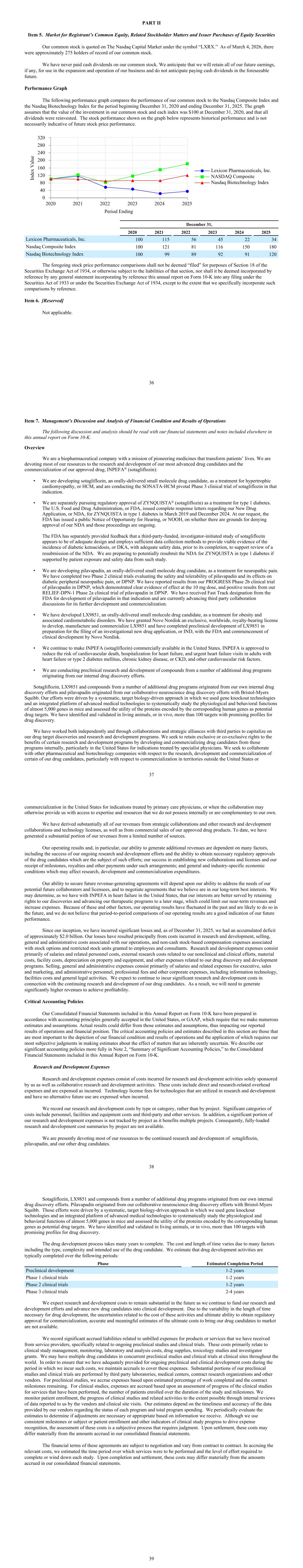 PART II Item 5. Market for Registrant’s Common Equity, Related Stockholder Matters and Issuer Purchases of Equity Securities Our common stock is quoted on The Nasdaq Capital Market under the symbol “LXRX.” As of March 4, 2026, there were approximately 275 holders of record of our common stock. We have never paid cash dividends on our common stock. We anticipate that we will retain all of our future earnings, if any, for use in the expansion and operation of our business and do not anticipate paying cash dividends in the foreseeable future. Performance Graph The following performance graph compares the performance of our common stock to the Nasdaq Composite Index and the Nasdaq Biotechnology Index for the period beginning December 31, 2020 and ending December 31, 2025. The graph assumes that the value of the investment in our common stock and each index was $100 at December 31, 2020, and that all dividends were reinvested. The stock performance shown on the graph below represents historical performance and is not necessarily indicative of future stock price performance. Period Ending In de x V al ue Lexicon Pharmaceuticals, Inc. NASDAQ Composite Nasdaq Biotechnology Index 2020 2021 2022 2023 2024 2025 0 40 80 120 160 200 240 280 320 December 31, 2020 2021 2022 2023 2024 2025 Lexicon Pharmaceuticals, Inc. 100 115 56 45 22 34 Nasdaq Composite Index 100 121 81 116 150 180 Nasdaq Biotechnology Index 100 99 89 92 91 120 The foregoing stock price performance comparisons shall not be deemed “filed” for purposes of Section 18 of the Securities Exchange Act of 1934, or otherwise subject to the liabilities of that section, nor shall it be deemed incorporated by reference by any general statement incorporating by reference this annual report on Form 10-K into any filing under the Securities Act of 1933 or under the Securities Exchange Act of 1934, except to the extent that we specifically incorporate such comparisons by reference. Item 6. [Reserved] Not applicable. 36 Item 7. Management’s Discussion and Analysis of Financial Condition and Results of Operations The following discussion and analysis should be read with our financial statements and notes included elsewhere in this annual report on Form 10-K. Overview We are a biopharmaceutical company with a mission of pioneering medicines that transform patients’ lives. We are devoting most of our resources to the research and development of our most advanced drug candidates and the commercialization of our approved drug, INPEFA® (sotagliflozin): • We are developing sotagliflozin, an orally-delivered small molecule drug candidate, as a treatment for hypertrophic cardiomyopathy, or HCM, and are conducting the SONATA-HCM pivotal Phase 3 clinical trial of sotagliflozin in that indication. • We are separately pursuing regulatory approval of ZYNQUISTA® (sotagliflozin) as a treatment for type 1 diabetes. The U.S. Food and Drug Administration, or FDA, issued complete response letters regarding our New Drug Application, or NDA, for ZYNQUISTA in type 1 diabetes in March 2019 and December 2024. At our request, the FDA has issued a public Notice of Opportunity for Hearing, or NOOH, on whether there are grounds for denying approval of our NDA and those proceedings are ongoing. The FDA has separately provided feedback that a third-party-funded, investigator-initiated study of sotagliflozin appears to be of adequate design and employs sufficient data collection methods to provide viable evidence of the incidence of diabetic ketoacidosis, or DKA, with adequate safety data, prior to its completion, to support review of a resubmission of the NDA. We are preparing to potentially resubmit the NDA for ZYNQUISTA in type 1 diabetes if supported by patient exposure and safety data from such study. • We are developing pilavapadin, an orally-delivered small molecule drug candidate, as a treatment for neuropathic pain. We have completed two Phase 2 clinical trials evaluating the safety and tolerability of pilavapadin and its effects on diabetic peripheral neuropathic pain, or DPNP. We have reported results from our PROGRESS Phase 2b clinical trial of pilavapadin in DPNP, which demonstrated clear evidence of effect at the 10 mg dose, and positive results from our RELIEF-DPN-1 Phase 2a clinical trial of pilavapadin in DPNP. We have received Fast Track designation from the FDA for development of pilavapadin in that indication and are currently advancing third party collaboration discussions for its further development and commercialization. • We have developed LX9851, an orally-delivered small molecule drug candidate, as a treatment for obesity and associated cardiometabolic disorders. We have granted Novo Nordisk an exclusive, worldwide, royalty-bearing license to develop, manufacture and commercialize LX9851 and have completed preclinical development of LX9851 in preparation for the filing of an investigational new drug application, or IND, with the FDA and commencement of clinical development by Novo Nordisk. • We continue to make INPEFA (sotagliflozin) commercially available in the United States. INPEFA is approved to reduce the risk of cardiovascular death, hospitalization for heart failure, and urgent heart failure visits in adults with heart failure or type 2 diabetes mellitus, chronic kidney disease, or CKD, and other cardiovascular risk factors. • We are conducting preclinical research and development of compounds from a number of additional drug programs originating from our internal drug discovery efforts. Sotagliflozin, LX9851 and compounds from a number of additional drug programs originated from our own internal drug discovery efforts and pilavapadin originated from our collaborative neuroscience drug discovery efforts with Bristol-Myers Squibb. Our efforts were driven by a systematic, target biology-driven approach in which we used gene knockout technologies and an integrated platform of advanced medical technologies to systematically st