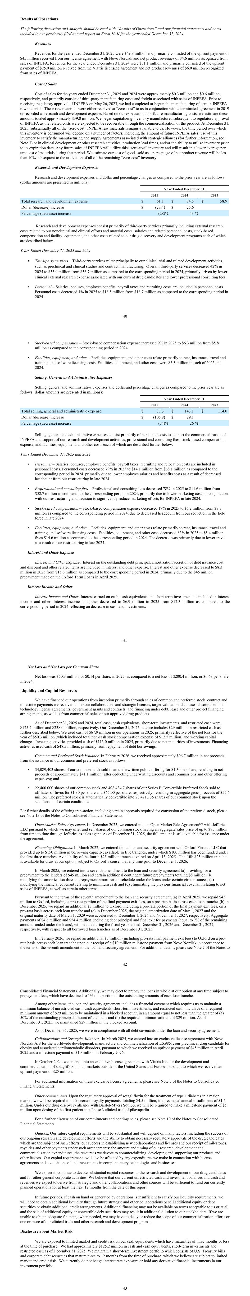 Results of Operations The following discussion and analysis should be read with “Results of Operations” and our financial statements and notes included in our previously filed annual report on Form 10-K for the year ended December 31, 2024. Revenues Revenues for the year ended December 31, 2025 were $49.8 million and primarily consisted of the upfront payment of $45 million received from our license agreement with Novo Nordisk and net product revenues of $4.6 million recognized from sales of INPEFA. Revenues for the year ended December 31, 2024 were $31.1 million and primarily consisted of the upfront payment of $25.0 million received from the Viatris licensing agreement and net product revenues of $6.0 million recognized from sales of INPEFA. Cost of Sales Cost of sales for the years ended December 31, 2025 and 2024 were approximately $0.3 million and $0.6 million, respectively, and primarily consist of third-party manufacturing costs and freight associated with sales of INPEFA. Prior to receiving regulatory approval of INPEFA on May 26, 2023, we had completed or begun the manufacturing of certain INPEFA raw materials. These raw materials were either received at “zero-cost” to us in conjunction with a terminated agreement in 2019 or recorded as research and development expense. Based on our expectations for future manufacturing costs, we estimate these amounts totaled approximately $39.0 million. We began capitalizing inventory manufactured subsequent to regulatory approval of INPEFA as the related costs were expected to be recoverable through the commercialization of the product. At December 31, 2025, substantially all of the “zero-cost” INPEFA raw materials remains available to us. However, the time period over which this inventory is consumed will depend on a number of factors, including the amount of future INPEFA sales, use of this inventory to satisfy the manufacturing and supply agreements associated with strategic alliances (for further information, see Note 7) or in clinical development or other research activities, production lead times, and/or the ability to utilize inventory prior to its expiration date. Any future sales of INPEFA will utilize this “zero-cost” inventory and will result in a lower average per unit cost of materials during that period. We estimate our cost of goods sold as a percentage of net product revenue will be less than 10% subsequent to the utilization of all of the remaining “zero-cost” inventory. Research and Development Expenses Research and development expenses and dollar and percentage changes as compared to the prior year are as follows (dollar amounts are presented in millions): Year Ended December 31, 2025 2024 2023 Total research and development expense $ 61.1 $ 84.5 $ 58.9 Dollar (decrease) increase $ (23.4) $ 25.6 Percentage (decrease) increase (28) % 43 % Research and development expenses consist primarily of third-party services primarily including external research costs related to our nonclinical and clinical efforts and material costs, salaries and related personnel costs, stock-based compensation and facility, equipment, and other costs related to our drug discovery and development programs each of which are described below. Years Ended December 31, 2025 and 2024 • Third-party services – Third-party services relate principally to our clinical trial and related development activities, such as preclinical and clinical studies and contract manufacturing. Overall, third-party services decreased 42% in 2025 to $33.0 million from $56.7 million as compared to the corresponding period in 2024, primarily driven by lower clinical external research expense associated with our current drug candidates and lower professional consulting fees. • Personnel – Salaries, bonuses, employee benefits, payroll taxes and recruiting costs are included in personnel costs. Personnel costs decreased 1% in 2025 to $16.5 million from $16.7 million as compared to the corresponding period in 2024. 40 • Stock-based compensation – Stock-based compensation expense increased 9% in 2025 to $6.3 million from $5.8 million as compared to the corresponding period in 2024. • Facilities, equipment, and other – Facilities, equipment, and other costs relate primarily to rent, insurance, travel and training, and software licensing costs. Facilities, equipment, and other costs were $5.3 million in each of 2025 and 2024. Selling, General and Administrative Expenses Selling, general and administrative expenses and dollar and percentage changes as compared to the prior year are as follows (dollar amounts are presented in millions): Year Ended December 31, 2025 2024 2023 Total selling, general and administrative expense $ 37.3 $ 143.1 $ 114.0 Dollar (decrease) increase $ (105.8) $ 29.1 Percentage (decrease) increase (74) % 26 % Selling, general and administrative expenses consist primarily of personnel costs to support the commercialization of INPEFA and support of our research and development activities, professional and consulting fees, stock-based compensation expense, and facilities, equipment, and other costs each of which are described further below. Years Ended December 31, 2025 and 2024 • Personnel – Salaries, bonuses, employee benefits, payroll taxes, recruiting and relocation costs are included in personnel costs. Personnel costs decreased 79% in 2025 to $14.1 million from $68.1 million as compared to the corresponding period in 2024, primarily due to lower employee salaries and benefits costs as a result of decreased headcount from our restructuring in late 2024. • Professional and consulting fees – Professional and consulting fees decreased 78% in 2025 to $11.6 million from $52.7 million as compared to the corresponding period in 2024, primarily due to lower marketing costs in conjunction with our restructuring and decision to significantly reduce marketing efforts for INPEFA in late 2024. • Stock-based compensation – Stock-base