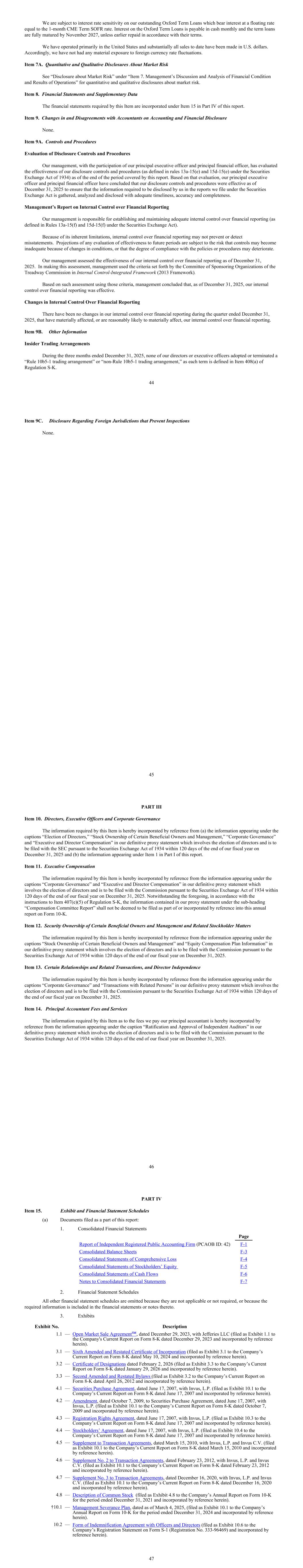 We are subject to interest rate sensitivity on our outstanding Oxford Term Loans which bear interest at a floating rate equal to the 1-month CME Term SOFR rate. Interest on the Oxford Term Loans is payable in cash monthly and the term loans are fully matured by November 2027, unless earlier repaid in accordance with their terms. We have operated primarily in the United States and substantially all sales to date have been made in U.S. dollars. Accordingly, we have not had any material exposure to foreign currency rate fluctuations. Item 7A. Quantitative and Qualitative Disclosures About Market Risk See “Disclosure about Market Risk” under “Item 7. Management’s Discussion and Analysis of Financial Condition and Results of Operations” for quantitative and qualitative disclosures about market risk. Item 8. Financial Statements and Supplementary Data The financial statements required by this Item are incorporated under Item 15 in Part IV of this report. Item 9. Changes in and Disagreements with Accountants on Accounting and Financial Disclosure None. Item 9A. Controls and Procedures Evaluation of Disclosure Controls and Procedures Our management, with the participation of our principal executive officer and principal financial officer, has evaluated the effectiveness of our disclosure controls and procedures (as defined in rules 13a-15(e) and 15d-15(e) under the Securities Exchange Act of 1934) as of the end of the period covered by this report. Based on that evaluation, our principal executive officer and principal financial officer have concluded that our disclosure controls and procedures were effective as of December 31, 2025 to ensure that the information required to be disclosed by us in the reports we file under the Securities Exchange Act is gathered, analyzed and disclosed with adequate timeliness, accuracy and completeness. Management’s Report on Internal Control over Financial Reporting Our management is responsible for establishing and maintaining adequate internal control over financial reporting (as defined in Rules 13a-15(f) and 15d-15(f) under the Securities Exchange Act). Because of its inherent limitations, internal control over financial reporting may not prevent or detect misstatements. Projections of any evaluation of effectiveness to future periods are subject to the risk that controls may become inadequate because of changes in conditions, or that the degree of compliance with the policies or procedures may deteriorate. Our management assessed the effectiveness of our internal control over financial reporting as of December 31, 2025. In making this assessment, management used the criteria set forth by the Committee of Sponsoring Organizations of the Treadway Commission in Internal Control-Integrated Framework (2013 Framework). Based on such assessment using those criteria, management concluded that, as of December 31, 2025, our internal control over financial reporting was effective. Changes in Internal Control Over Financial Reporting There have been no changes in our internal control over financial reporting during the quarter ended December 31, 2025, that have materially affected, or are reasonably likely to materially affect, our internal control over financial reporting. Item 9B. Other Information Insider Trading Arrangements During the three months ended December 31, 2025, none of our directors or executive officers adopted or terminated a “Rule 10b5-1 trading arrangement” or “non-Rule 10b5-1 trading arrangement,” as each term is defined in Item 408(a) of Regulation S-K. 44 Item 9C. Disclosure Regarding Foreign Jurisdictions that Prevent Inspections None. 45 PART III Item 10. Directors, Executive Officers and Corporate Governance The information required by this Item is hereby incorporated by reference from (a) the information appearing under the captions “Election of Directors,” “Stock Ownership of Certain Beneficial Owners and Management,” “Corporate Governance” and “Executive and Director Compensation” in our definitive proxy statement which involves the election of directors and is to be filed with the SEC pursuant to the Securities Exchange Act of 1934 within 120 days of the end of our fiscal year on December 31, 2025 and (b) the information appearing under Item 1 in Part I of this report. Item 11. Executive Compensation The information required by this Item is hereby incorporated by reference from the information appearing under the captions “Corporate Governance” and “Executive and Director Compensation” in our definitive proxy statement which involves the election of directors and is to be filed with the Commission pursuant to the Securities Exchange Act of 1934 within 120 days of the end of our fiscal year on December 31, 2025. Notwithstanding the foregoing, in accordance with the instructions to Item 407(e)(5) of Regulation S-K, the information contained in our proxy statement under the sub-heading “Compensation Committee Report” shall not be deemed to be filed as part of or incorporated by reference into this annual report on Form 10-K. Item 12. Security Ownership of Certain Beneficial Owners and Management and Related Stockholder Matters The information required by this Item is hereby incorporated by reference from the information appearing under the captions “Stock Ownership of Certain Beneficial Owners and Management” and “Equity Compensation Plan Information” in our definitive proxy statement which involves the election of directors and is to be filed with the Commission pursuant to the Securities Exchange Act of 1934 within 120 days of the end of our fiscal year on December 31, 2025. Item 13. Certain Relationships and Related Transactions, and Director Independence The information required by this Item is hereby incorporated by reference from the information appearing under the captions “Corporate Governance” and “Transactions with Related Persons” in our definitive proxy statement whi