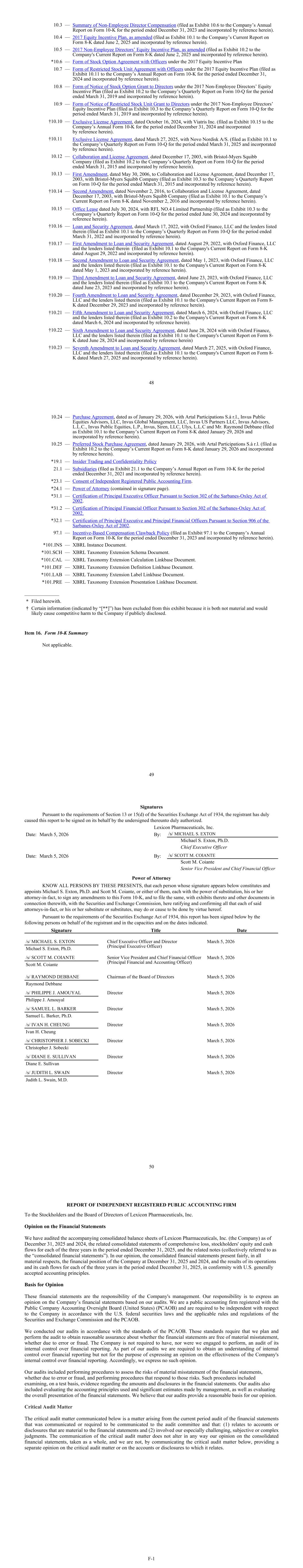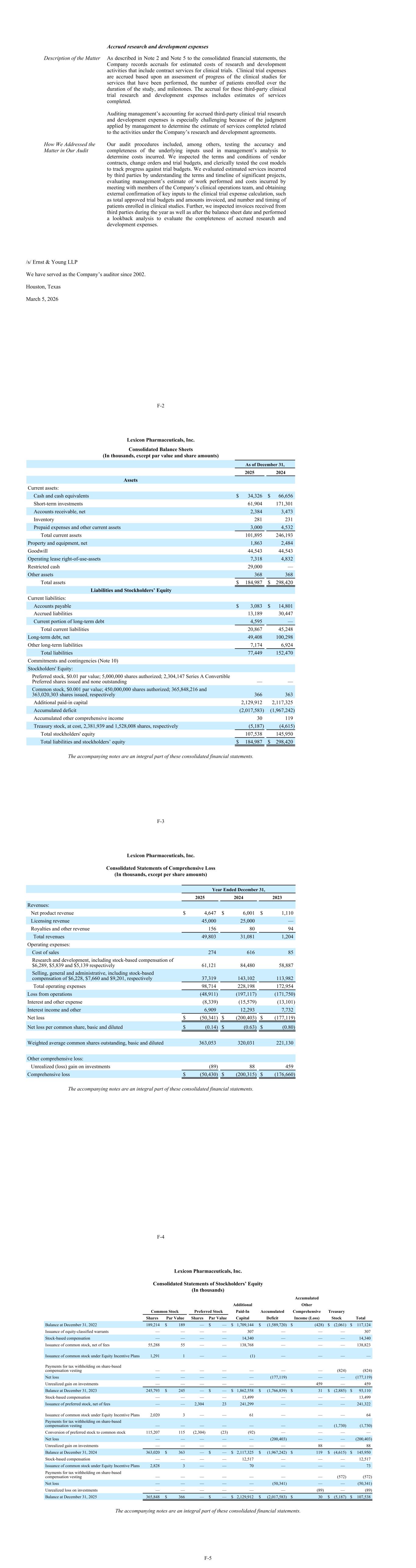 Accrued research and development expenses Description of the Matter As described in Note 2 and Note 5 to the consolidated financial statements, the Company records accruals for estimated costs of research and development activities that include contract services for clinical trials. Clinical trial expenses are accrued based upon an assessment of progress of the clinical studies for services that have been performed, the number of patients enrolled over the duration of the study, and milestones. The accrual for these third-party clinical trial research and development expenses includes estimates of services completed. Auditing management’s accounting for accrued third-party clinical trial research and development expenses is especially challenging because of the judgment applied by management to determine the estimate of services completed related to the activities under the Company’s research and development agreements. How We Addressed the Matter in Our Audit Our audit procedures included, among others, testing the accuracy and completeness of the underlying inputs used in management’s analysis to determine costs incurred. We inspected the terms and conditions of vendor contracts, change orders and trial budgets, and clerically tested the cost models to track progress against trial budgets. We evaluated estimated services incurred by third parties by understanding the terms and timeline of significant projects, evaluating management’s estimate of work performed and costs incurred by meeting with members of the Company’s clinical operations team, and obtaining external confirmation of key inputs to the clinical trial expense calculation, such as total approved trial budgets and amounts invoiced, and number and timing of patients enrolled in clinical studies. Further, we inspected invoices received from third parties during the year as well as after the balance sheet date and performed a lookback analysis to evaluate the completeness of accrued research and development expenses. /s/ Ernst & Young LLP We have served as the Company’s auditor since 2002. Houston, Texas March 5, 2026 F-2 Lexicon Pharmaceuticals, Inc. Consolidated Balance Sheets (In thousands, except par value and share amounts) As of December 31, 2025 2024 Assets Current assets: Cash and cash equivalents $ 34,326 $ 66,656 Short-term investments 61,904 171,301 Accounts receivable, net 2,384 3,473 Inventory 281 231 Prepaid expenses and other current assets 3,000 4,532 Total current assets 101,895 246,193 Property and equipment, net 1,863 2,484 Goodwill 44,543 44,543 Operating lease right-of-use-assets 7,318 4,832 Restricted cash 29,000 — Other assets 368 368 Total assets $ 184,987 $ 298,420 Liabilities and Stockholders’ Equity Current liabilities: Accounts payable $ 3,083 $ 14,801 Accrued liabilities 13,189 30,447 Current portion of long-term debt 4,595 — Total current liabilities 20,867 45,248 Long-term debt, net 49,408 100,298 Other long-term liabilities 7,174 6,924 Total liabilities 77,449 152,470 Commitments and contingencies (Note 10) Stockholders' Equity: Preferred stock, $0.01 par value; 5,000,000 shares authorized; 2,304,147 Series A Convertible Preferred shares issued and none outstanding — — Common stock, $0.001 par value; 450,000,000 shares authorized; 365,848,216 and 363,020,303 shares issued, respectively 366 363 Additional paid-in capital 2,129,912 2,117,325 Accumulated deficit (2,017,583) (1,967,242) Accumulated other comprehensive income 30 119 Treasury stock, at cost, 2,381,939 and 1,528,008 shares, respectively (5,187) (4,615) Total stockholders' equity 107,538 145,950 Total liabilities and stockholders’ equity $ 184,987 $ 298,420 The accompanying notes are an integral part of these consolidated financial statements. F-3 Lexicon Pharmaceuticals, Inc. Consolidated Statements of Comprehensive Loss (In thousands, except per share amounts) Year Ended December 31, 2025 2024 2023 Revenues: Net product revenue $ 4,647 $ 6,001 $ 1,110 Licensing revenue 45,000 25,000 — Royalties and other revenue 156 80 94 Total revenues 49,803 31,081 1,204 Operating expenses: Cost of sales 274 616 85 Research and development, including stock-based compensation of $6,289, $5,839 and $5,139 respectively 61,121 84,480 58,887 Selling, general and administrative, including stock-based compensation of $6,228, $7,660 and $9,201, respectively 37,319 143,102 113,982 Total operating expenses 98,714 228,198 172,954 Loss from operations (48,911) (197,117) (171,750) Interest and other expense (8,339) (15,579) (13,101) Interest income and other 6,909 12,293 7,732 Net loss $ (50,341) $ (200,403) $ (177,119) Net loss per common share, basic and diluted $ (0.14) $ (0.63) $ (0.80) Weighted average common shares outstanding, basic and diluted 363,053 320,031 221,130 Other comprehensive loss: Unrealized (loss) gain on investments (89) 88 459 Comprehensive loss $ (50,430) $ (200,315) $ (176,660) The accompanying notes are an integral part of these consolidated financial statements. F-4 Lexicon Pharmaceuticals, Inc. Consolidated Statements of Stockholders’ Equity (In thousands) Accumulated Additional Other Common Stock Preferred Stock Paid-In Accumulated Comprehensive Treasury Shares Par Value Shares Par Value Capital Deficit Income (Loss) Stock Total Balance at December 31, 2022 189,214 $ 189 — $ — $ 1,709,144 $ (1,589,720) $ (428) $ (2,061) $ 117,124 Issuance of equity-classified warrants — — — — 307 — — — 307 Stock-based compensation — — — — 14,340 — — — 14,340 Issuance of common stock, net of fees 55,288 55 — — 138,768 — — — 138,823 Issuance of common stock under Equity Incentive Plans 1,291 1 — — (1) — — — — Payments for tax withholding on share-based compensation vesting — — — — — — — (824) (824) Net loss — — — — — (177,119) — — (177,119) Unrealized gain on investments — — — — — — 459 — 459 Balance at December 31, 2023 245,793 $