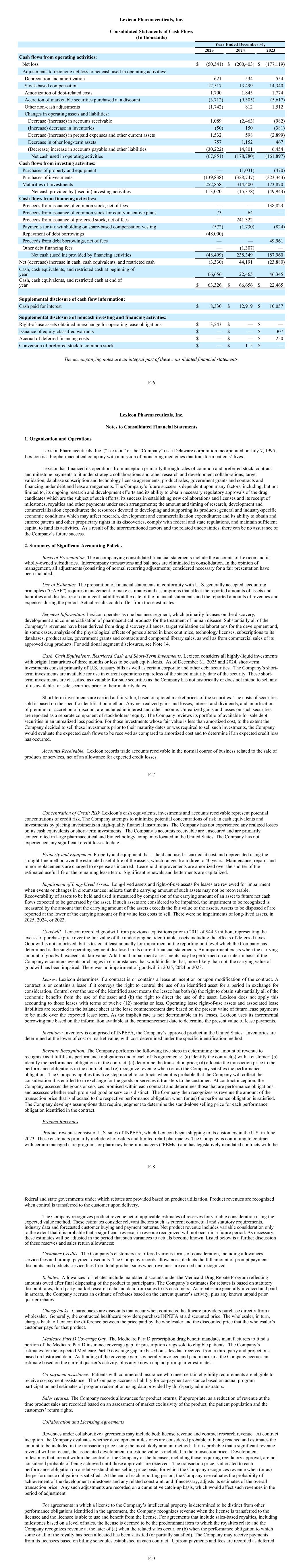 Lexicon Pharmaceuticals, Inc. Consolidated Statements of Cash Flows (In thousands) Year Ended December 31, 2025 2024 2023 Cash flows from operating activities: Net loss $ (50,341) $ (200,403) $ (177,119) Adjustments to reconcile net loss to net cash used in operating activities: Depreciation and amortization 621 534 554 Stock-based compensation 12,517 13,499 14,340 Amortization of debt-related costs 1,700 1,845 1,774 Accretion of marketable securities purchased at a discount (3,712) (9,305) (5,617) Other non-cash adjustments (1,742) 812 1,512 Changes in operating assets and liabilities: Decrease (increase) in accounts receivable 1,089 (2,463) (982) (Increase) decrease in inventories (50) 150 (381) Decrease (increase) in prepaid expenses and other current assets 1,532 598 (2,899) Decrease in other long-term assets 757 1,152 467 (Decrease) increase in accounts payable and other liabilities (30,222) 14,801 6,454 Net cash used in operating activities (67,851) (178,780) (161,897) Cash flows from investing activities: Purchases of property and equipment — (1,031) (470) Purchases of investments (139,838) (328,747) (223,343) Maturities of investments 252,858 314,400 173,870 Net cash provided by (used in) investing activities 113,020 (15,378) (49,943) Cash flows from financing activities: Proceeds from issuance of common stock, net of fees — — 138,823 Proceeds from issuance of common stock for equity incentive plans 73 64 — Proceeds from issuance of preferred stock, net of fees — 241,322 — Payments for tax withholding on share-based compensation vesting (572) (1,730) (824) Repayment of debt borrowings (48,000) — — Proceeds from debt borrowings, net of fees — — 49,961 Other debt financing fees — (1,307) — Net cash (used in) provided by financing activities (48,499) 238,349 187,960 Net (decrease) increase in cash, cash equivalents, and restricted cash (3,330) 44,191 (23,880) Cash, cash equivalents, and restricted cash at beginning of year 66,656 22,465 46,345 Cash, cash equivalents, and restricted cash at end of year $ 63,326 $ 66,656 $ 22,465 Supplemental disclosure of cash flow information: Cash paid for interest $ 8,330 $ 12,919 $ 10,057 Supplemental disclosure of noncash investing and financing activities: Right-of-use assets obtained in exchange for operating lease obligations $ 3,243 $ — $ — Issuance of equity-classified warrants $ — $ — $ 307 Accrual of deferred financing costs $ — $ — $ 250 Conversion of preferred stock to common stock $ — $ 115 $ — The accompanying notes are an integral part of these consolidated financial statements. F-6 Lexicon Pharmaceuticals, Inc. Notes to Consolidated Financial Statements 1. Organization and Operations Lexicon Pharmaceuticals, Inc. (“Lexicon” or the “Company”) is a Delaware corporation incorporated on July 7, 1995. Lexicon is a biopharmaceutical company with a mission of pioneering medicines that transform patients’ lives. Lexicon has financed its operations from inception primarily through sales of common and preferred stock, contract and milestone payments to it under strategic collaborations and other research and development collaborations, target validation, database subscription and technology license agreements, product sales, government grants and contracts and financing under debt and lease arrangements. The Company’s future success is dependent upon many factors, including, but not limited to, its ongoing research and development efforts and its ability to obtain necessary regulatory approvals of the drug candidates which are the subject of such efforts; its success in establishing new collaborations and licenses and its receipt of milestones, royalties and other payments under such arrangements; the amount and timing of research, development and commercialization expenditures; the resources devoted to developing and supporting its products; general and industry-specific economic conditions which may affect research, development and commercialization expenditures; and its ability to obtain and enforce patents and other proprietary rights in its discoveries, comply with federal and state regulations, and maintain sufficient capital to fund its activities. As a result of the aforementioned factors and the related uncertainties, there can be no assurance of the Company’s future success. 2. Summary of Significant Accounting Policies Basis of Presentation. The accompanying consolidated financial statements include the accounts of Lexicon and its wholly-owned subsidiaries. Intercompany transactions and balances are eliminated in consolidation. In the opinion of management, all adjustments (consisting of normal recurring adjustments) considered necessary for a fair presentation have been included. Use of Estimates. The preparation of financial statements in conformity with U. S. generally accepted accounting principles (“GAAP”) requires management to make estimates and assumptions that affect the reported amounts of assets and liabilities and disclosure of contingent liabilities at the date of the financial statements and the reported amounts of revenues and expenses during the period. Actual results could differ from those estimates. Segment Information. Lexicon operates as one business segment, which primarily focuses on the discovery, development and commercialization of pharmaceutical products for the treatment of human disease. Substantially all of the Company’s revenues have been derived from drug discovery alliances, target validation collaborations for the development and, in some cases, analysis of the physiological effects of genes altered in knockout mice, technology licenses, subscriptions to its databases, product sales, government grants and contracts and compound library sales, as well as from commercial sales of its approved drug products. For additional segment disclosures, see Note 14. Cash, Cash Equivalents, Restricted Cash and Short-Term Investments. Lexicon considers a