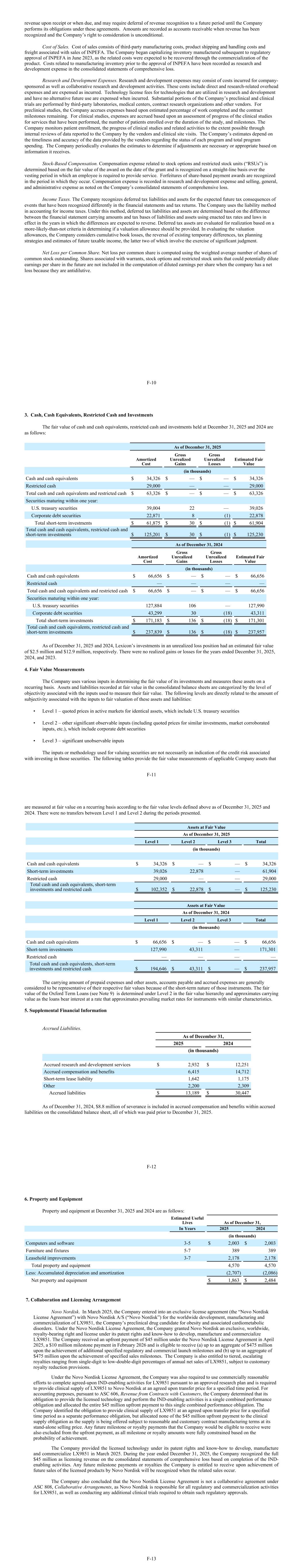 revenue upon receipt or when due, and may require deferral of revenue recognition to a future period until the Company performs its obligations under these agreements. Amounts are recorded as accounts receivable when revenue has been recognized and the Company’s right to consideration is unconditional. Cost of Sales. Cost of sales consists of third-party manufacturing costs, product shipping and handling costs and freight associated with sales of INPEFA. The Company began capitalizing inventory manufactured subsequent to regulatory approval of INPEFA in June 2023, as the related costs were expected to be recovered through the commercialization of the product. Costs related to manufacturing inventory prior to the approval of INPEFA have been recorded as research and development expense in the consolidated statements of comprehensive loss. Research and Development Expenses. Research and development expenses may consist of costs incurred for company- sponsored as well as collaborative research and development activities. These costs include direct and research-related overhead expenses and are expensed as incurred. Technology license fees for technologies that are utilized in research and development and have no alternative future use are expensed when incurred. Substantial portions of the Company’s preclinical and clinical trials are performed by third-party laboratories, medical centers, contract research organizations and other vendors. For preclinical studies, the Company accrues expenses based upon estimated percentage of work completed and the contract milestones remaining. For clinical studies, expenses are accrued based upon an assessment of progress of the clinical studies for services that have been performed, the number of patients enrolled over the duration of the study, and milestones. The Company monitors patient enrollment, the progress of clinical studies and related activities to the extent possible through internal reviews of data reported to the Company by the vendors and clinical site visits. The Company’s estimates depend on the timeliness and accuracy of the data provided by the vendors regarding the status of each program and total program spending. The Company periodically evaluates the estimates to determine if adjustments are necessary or appropriate based on information it receives. Stock-Based Compensation. Compensation expense related to stock options and restricted stock units (“RSUs”) is determined based on the fair value of the award on the date of the grant and is recognized on a straight-line basis over the vesting period in which an employee is required to provide service. Forfeitures of share-based payment awards are recognized in the period in which they occur. Compensation expense is recorded in research and development expense and selling, general, and administrative expense as noted on the Company’s consolidated statements of comprehensive loss. Income Taxes. The Company recognizes deferred tax liabilities and assets for the expected future tax consequences of events that have been recognized differently in the financial statements and tax returns. The Company uses the liability method in accounting for income taxes. Under this method, deferred tax liabilities and assets are determined based on the difference between the financial statement carrying amounts and tax bases of liabilities and assets using enacted tax rates and laws in effect in the years in which the differences are expected to reverse. Deferred tax assets are evaluated for realization based on a more-likely-than-not criteria in determining if a valuation allowance should be provided. In evaluating the valuation allowances, the Company considers cumulative book losses, the reversal of existing temporary differences, tax planning strategies and estimates of future taxable income, the latter two of which involve the exercise of significant judgment. Net Loss per Common Share. Net loss per common share is computed using the weighted average number of shares of common stock outstanding. Shares associated with warrants, stock options and restricted stock units that could potentially dilute earnings per share in the future are not included in the computation of diluted earnings per share when the company has a net loss because they are antidilutive. F-10 3. Cash, Cash Equivalents, Restricted Cash and Investments The fair value of cash and cash equivalents, restricted cash and investments held at December 31, 2025 and 2024 are as follows: As of December 31, 2025 Amortized Cost Gross Unrealized Gains Gross Unrealized Losses Estimated Fair Value (in thousands) Cash and cash equivalents $ 34,326 $ — $ — $ 34,326 Restricted cash 29,000 — — 29,000 Total cash and cash equivalents and restricted cash $ 63,326 $ — $ — $ 63,326 Securities maturing within one year: U.S. treasury securities 39,004 22 — 39,026 Corporate debt securities 22,871 8 (1) 22,878 Total short-term investments $ 61,875 $ 30 $ (1) $ 61,904 Total cash and cash equivalents, restricted cash and short-term investments $ 125,201 $ 30 $ (1) $ 125,230 As of December 31, 2024 Amortized Cost Gross Unrealized Gains Gross Unrealized Losses Estimated Fair Value (in thousands) Cash and cash equivalents $ 66,656 $ — $ — $ 66,656 Restricted cash — — — — Total cash and cash equivalents and restricted cash $ 66,656 $ — $ — $ 66,656 Securities maturing within one year: U.S. treasury securities 127,884 106 — 127,990 Corporate debt securities 43,299 30 (18) 43,311 Total short-term investments $ 171,183 $ 136 $ (18) $ 171,301 Total cash and cash equivalents, restricted cash and short-term investments $ 237,839 $ 136 $ (18) $ 237,957 As of December 31, 2025 and 2024, Lexicon’s investments in an unrealized loss position had an estimated fair value of $2.5 million and $12.9 million, respectively. There were no realized gains or losses for the years ended December 31, 2025, 2024, and 2023. 4. Fair Value Measureme