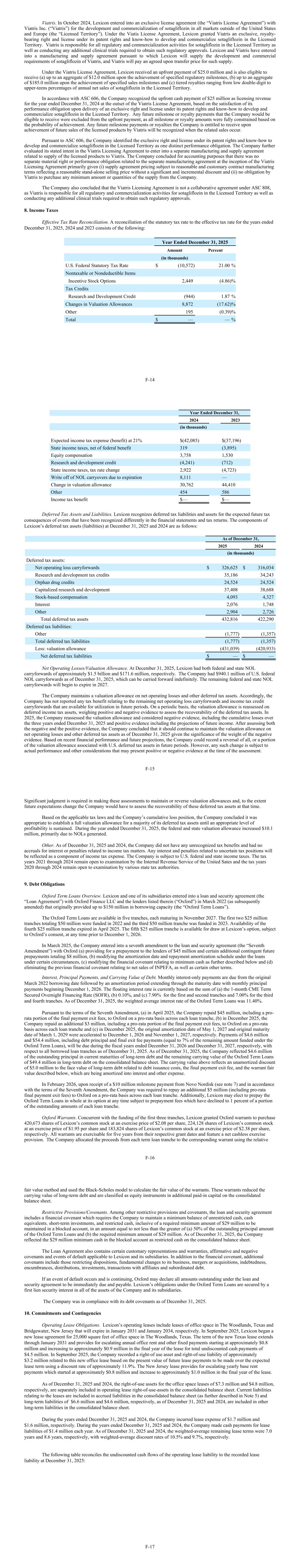 Viatris. In October 2024, Lexicon entered into an exclusive license agreement (the “Viatris License Agreement”) with Viatris Inc. (“Viatris”) for the development and commercialization of sotagliflozin in all markets outside of the United States and Europe (the “Licensed Territory”). Under the Viatis License Agreement, Lexicon granted Viatris an exclusive, royalty- bearing right and license under its patent rights and know-how to develop and commercialize sotagliflozin in the Licensed Territory. Viatris is responsible for all regulatory and commercialization activities for sotagliflozin in the Licensed Territory as well as conducting any additional clinical trials required to obtain such regulatory approvals. Lexicon and Viatris have entered into a manufacturing and supply agreement pursuant to which Lexicon will supply the development and commercial requirements of sotagliflozin of Viatris, and Viatris will pay an agreed upon transfer price for such supply. Under the Viatris License Agreement, Lexicon received an upfront payment of $25.0 million and is also eligible to receive (a) up to an aggregate of $12.0 million upon the achievement of specified regulatory milestones, (b) up to an aggregate of $185.0 million upon the achievement of specified sales milestones and (c) tiered royalties ranging from low double-digit to upper-teens percentages of annual net sales of sotagliflozin in the Licensed Territory. In accordance with ASC 606, the Company recognized the upfront cash payment of $25 million as licensing revenue for the year ended December 31, 2024 at the outset of the Viatris License Agreement, based on the satisfaction of its performance obligation upon delivery of an exclusive right and license under its patent rights and know-how to develop and commercialize sotagliflozin in the Licensed Territory. Any future milestone or royalty payments that the Company would be eligible to receive were excluded from the upfront payment, as all milestone or royalty amounts were fully constrained based on the probability of achievement. Any future milestone payments or royalties the Company is entitled to receive upon achievement of future sales of the licensed products by Viatris will be recognized when the related sales occur. Pursuant to ASC 606, the Company identified the exclusive right and license under its patent rights and know-how to develop and commercialize sotagliflozin in the Licensed Territory as one distinct performance obligation. The Company further evaluated its stated intent in the Viatris Licensing Agreement to enter into a separate manufacturing and supply agreement related to supply of the licensed products to Viatris. The Company concluded for accounting purposes that there was no separate material right or performance obligation related to the separate manufacturing agreement at the inception of the Viatris Licensing Agreement primarily given (i) supply agreement pricing subject to reasonable and customary contract manufacturing terms reflecting a reasonable stand-alone selling price without a significant and incremental discount and (ii) no obligation by Viatris to purchase any minimum amount or quantities of the supply from the Company. The Company also concluded that the Viatris Licensing Agreement is not a collaborative agreement under ASC 808, as Viatris is responsible for all regulatory and commercialization activities for sotagliflozin in the Licensed Territory as well as conducting any additional clinical trials required to obtain such regulatory approvals. 8. Income Taxes Effective Tax Rate Reconciliation. A reconciliation of the statutory tax rate to the effective tax rate for the years ended December 31, 2025, 2024 and 2023 consists of the following: Year Ended December 31, 2025 Amount Percent (in thousands) U.S. Federal Statutory Tax Rate $ (10,572) 21.00 % Nontaxable or Nondeductible Items Incentive Stock Options 2,449 (4.86) % Tax Credits Research and Development Credit (944) 1.87 % Changes in Valuation Allowances 8,872 (17.62) % Other 195 (0.39) % Total $ — — % F-14 Year Ended December 31, 2024 2023 (in thousands) Expected income tax expense (benefit) at 21% $(42,085) $(37,196) State income taxes, net of federal benefit 319 (3,895) Equity compensation 3,758 1,530 Research and development credit (4,241) (712) State income taxes, tax rate change 2,922 (4,723) Write off of NOL carryovers due to expiration 8,111 — Change in valuation allowance 30,762 44,410 Other 454 586 Income tax benefit $— $— Deferred Tax Assets and Liabilities. Lexicon recognizes deferred tax liabilities and assets for the expected future tax consequences of events that have been recognized differently in the financial statements and tax returns. The components of Lexicon’s deferred tax assets (liabilities) at December 31, 2025 and 2024 are as follows: As of December 31, 2025 2024 (in thousands) Deferred tax assets: Net operating loss carryforwards $ 326,625 $ 316,034 Research and development tax credits 35,186 34,243 Orphan drug credits 24,524 24,524 Capitalized research and development 37,408 38,688 Stock-based compensation 4,093 4,327 Interest 2,076 1,748 Other 2,904 2,726 Total deferred tax assets 432,816 422,290 Deferred tax liabilities: Other (1,777) (1,357) Total deferred tax liabilities (1,777) (1,357) Less: valuation allowance (431,039) (420,933) Net deferred tax liabilities $ — $ — Net Operating Losses/Valuation Allowance. At December 31, 2025, Lexicon had both federal and state NOL carryforwards of approximately $1.5 billion and $171.6 million, respectively. The Company had $940.1 million of U.S. federal NOL carryforwards as of December 31, 2025, which can be carried forward indefinitely. The remaining federal and state NOL carryforwards will begin to expire in 2027. The Company maintains a valuation allowance on net operating losses and other deferred tax assets. Accordingly, the Company has not reported any tax benefit relating to the remaining net op