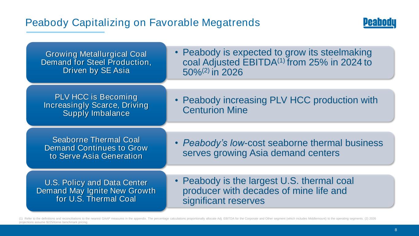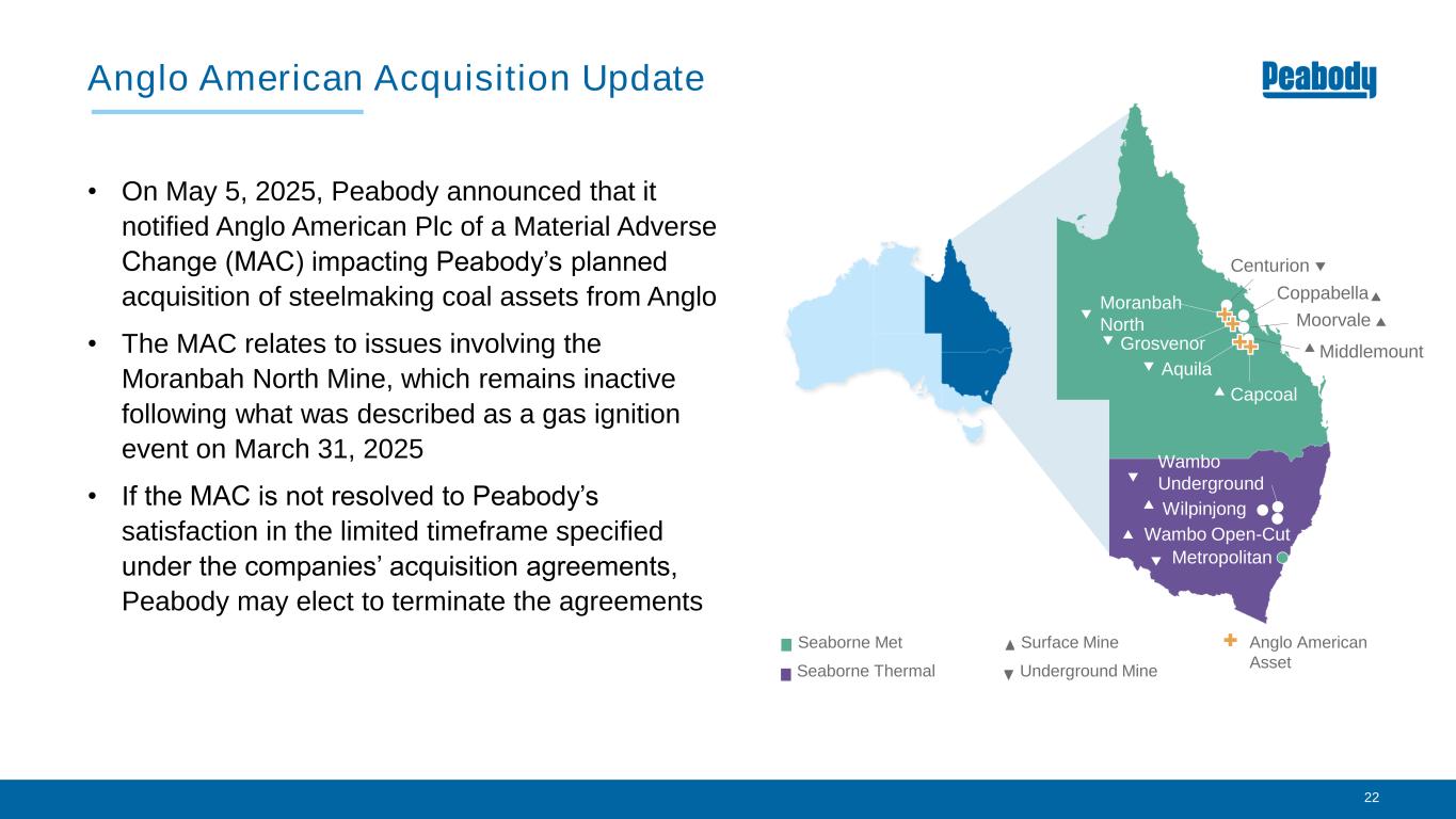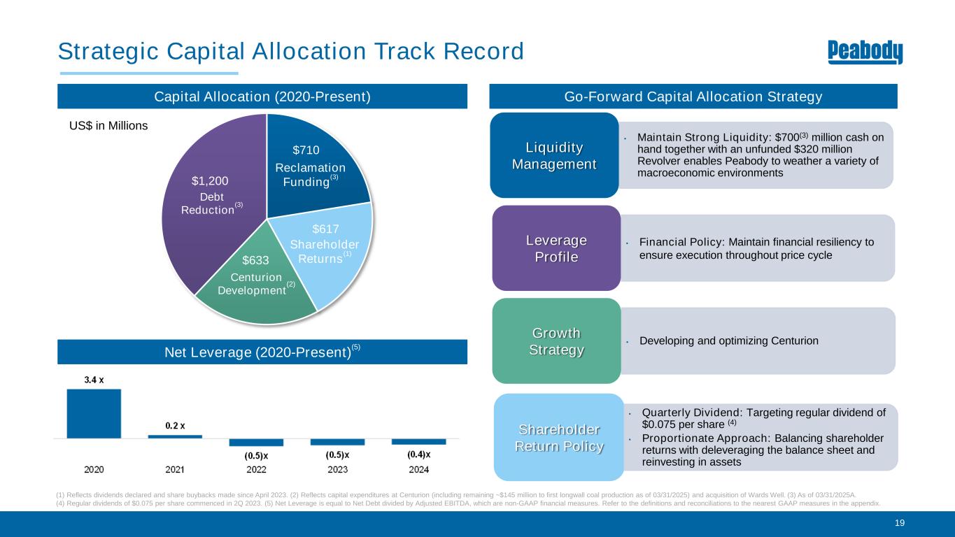 2 Important Information This presentation contains forward-looking statements within the meaning of the securities laws. Forward-looking statements can be identified by the fact that they do not relate strictly to historical or current facts. They often include words or variation of words such as "expects,” "anticipates," "intends," "plans," "believes," "seeks," "estimates," "projects," "forecasts," "targets," "would," "will," "should," "goal," "could" or "may" or other similar expressions. Forward-looking statements provide the Company’s current expectations or predictions of future conditions, events or results. All statements that address operating performance, events, or developments that may occur in the future are forward-looking statements, including statements regarding the status of the acquisition of assets and businesses associated with Anglo American’s metallurgical coal portfolio in Australia, Peabody’s shareholder return framework, execution of Peabody's operating plans, market conditions, reclamation obligations, financial outlook, and other acquisitions and strategic investments, and liquidity requirements. They may include estimates of sales and other operating performance targets, potential synergies cost savings, capital expenditures, other expense items, actions relating to strategic initiatives, demand for the company’s products, liquidity, capital structure, market share, industry volume, other financial items, descriptions of management’s plans or objectives for future operations and descriptions of assumptions underlying any of the above. All forward-looking statements speak only as of the date they are made and reflect Peabody’s good faith beliefs, assumptions and expectations, but they are not guarantees of future performance or events. Furthermore, Peabody disclaims any obligation to publicly update or revise any forward-looking statement, except as required by law. By their nature, forward-looking statements are subject to risks and uncertainties that could cause actual results to differ materially from those suggested by the forward-looking statements. Factors that might cause such differences include, but are not limited to, a variety of economic, competitive, and regulatory factors, many of which are beyond Peabody's control, that are described in Peabody's periodic reports filed with the SEC including its Annual Report on Form 10-K for the fiscal year ended Dec. 31, 2024 and Quarterly Report on Form 10-Q for the quarter ended March 31, 2025 and other factors that Peabody may describe from time to time in other filings with the SEC. You may get such filings for free at Peabody's website at www.peabodyenergy.com. You should understand that it is not possible to predict or identify all such factors and, consequently, you should not consider any such list to be a complete set of all potential risks or uncertainties. This presentation also contains non-GAAP financial measures. The Company has provided a reconciliation of such non-GAAP financial measures to the most directly comparable financial measures prepared in accordance with U.S. GAAP in the Appendix to this presentation.