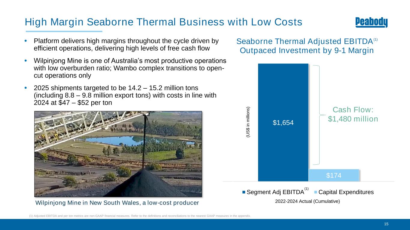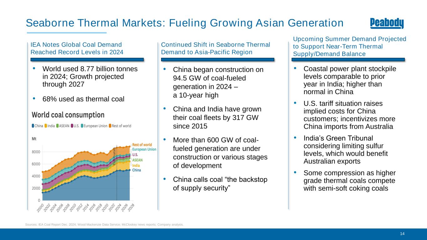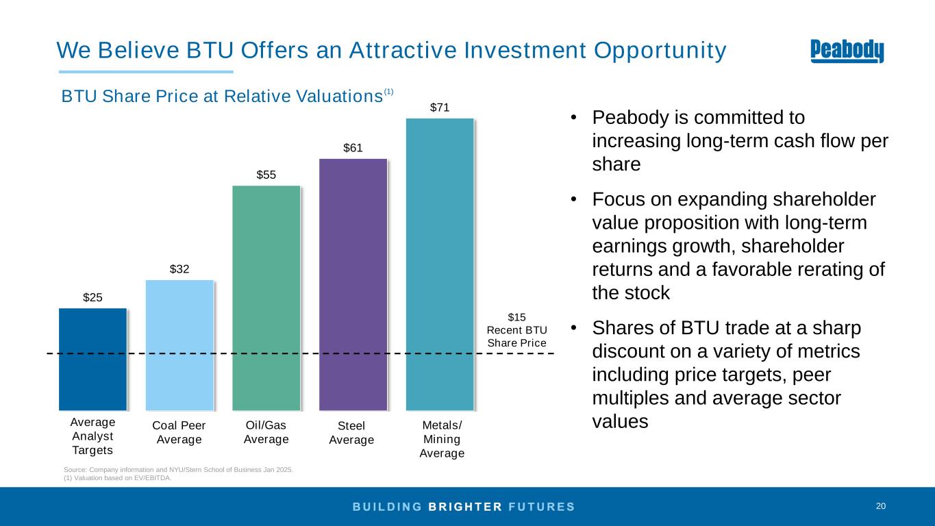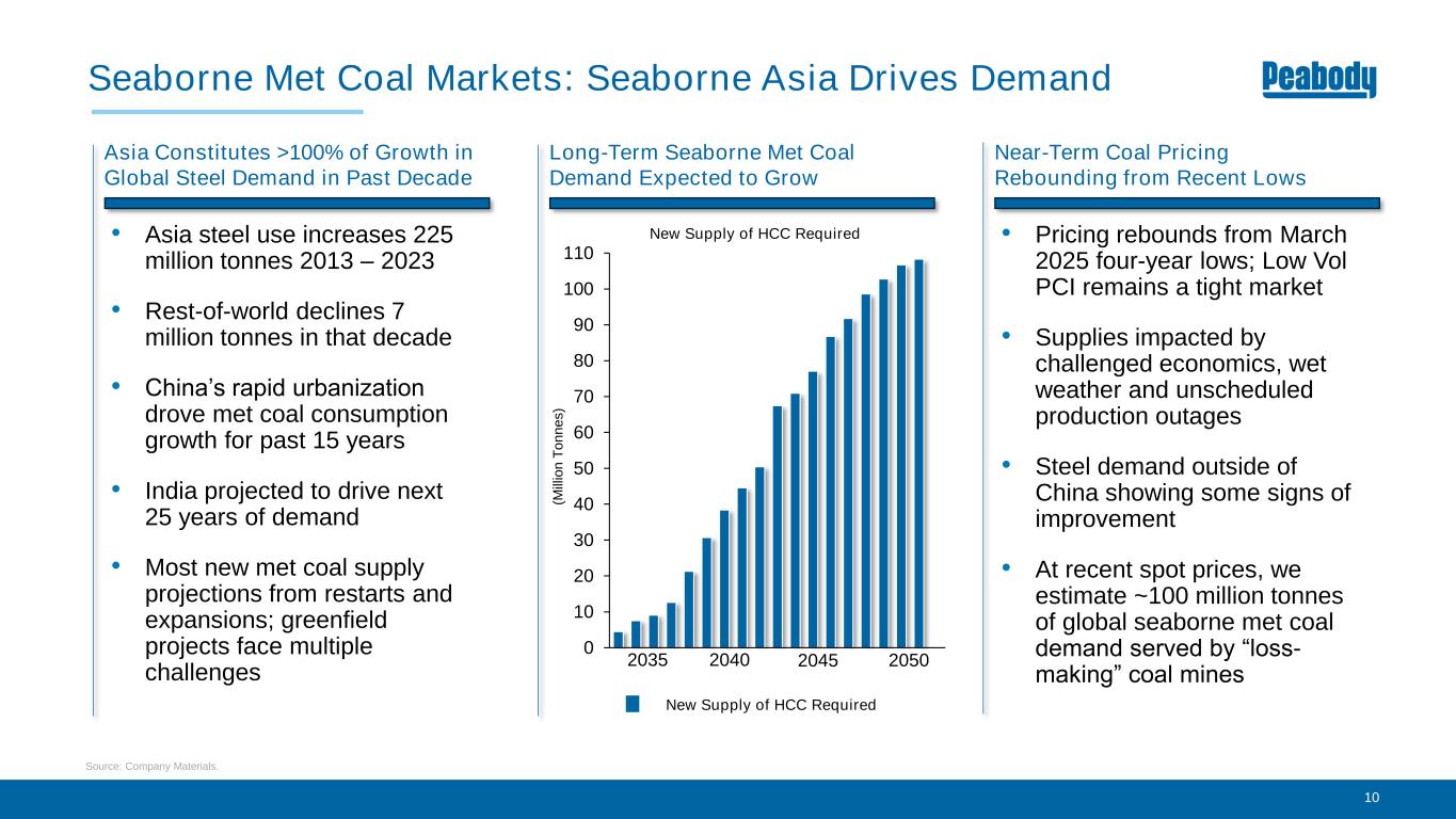 2 Important Information This presentation contains forward-looking statements within the meaning of the securities laws. Forward-looking statements can be identified by the fact that they do not relate strictly to historical or current facts. They often include words or variation of words such as "expects,” "anticipates," "intends," "plans," "believes," "seeks," "estimates," "projects," "forecasts," "targets," "would," "will," "should," "goal," "could" or "may" or other similar expressions. Forward-looking statements provide the Company’s current expectations or predictions of future conditions, events or results. All statements that address operating performance, events, or developments that may occur in the future are forward-looking statements, including statements regarding the status of the acquisition of assets and businesses associated with Anglo American’s metallurgical coal portfolio in Australia, Peabody’s shareholder return framework, execution of Peabody's operating plans, market conditions, reclamation obligations, financial outlook, and other acquisitions and strategic investments, and liquidity requirements. They may include estimates of sales and other operating performance targets, potential synergies cost savings, capital expenditures, other expense items, actions relating to strategic initiatives, demand for the company’s products, liquidity, capital structure, market share, industry volume, other financial items, descriptions of management’s plans or objectives for future operations and descriptions of assumptions underlying any of the above. All forward-looking statements speak only as of the date they are made and reflect Peabody’s good faith beliefs, assumptions and expectations, but they are not guarantees of future performance or events. Furthermore, Peabody disclaims any obligation to publicly update or revise any forward-looking statement, except as required by law. By their nature, forward-looking statements are subject to risks and uncertainties that could cause actual results to differ materially from those suggested by the forward-looking statements. Factors that might cause such differences include, but are not limited to, a variety of economic, competitive, and regulatory factors, many of which are beyond Peabody's control, that are described in Peabody's periodic reports filed with the SEC including its Annual Report on Form 10-K for the fiscal year ended Dec. 31, 2024 and Quarterly Report on Form 10-Q for the quarter ended March 31, 2025 and other factors that Peabody may describe from time to time in other filings with the SEC. You may get such filings for free at Peabody's website at www.peabodyenergy.com. You should understand that it is not possible to predict or identify all such factors and, consequently, you should not consider any such list to be a complete set of all potential risks or uncertainties. This presentation also contains non-GAAP financial measures. The Company has provided a reconciliation of such non-GAAP financial measures to the most directly comparable financial measures prepared in accordance with U.S. GAAP in the Appendix to this presentation.