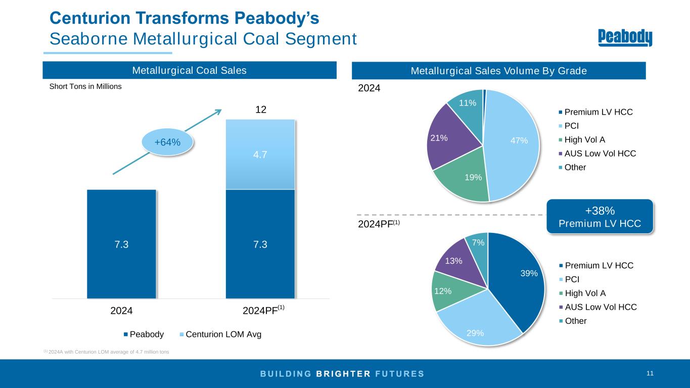 11 Centurion Transforms Peabody’s Seaborne Metallurgical Coal Segment Metallurgical Sales Volume By Grade Metallurgical Coal Sales 39% 29% 12% 13% 7% Premium LV HCC PCI High Vol A AUS Low Vol HCC Other 7.3 7.3 4.7 2024 2024PF Peabody Centurion LOM Avg 12 Short Tons in Millions (1) 2024A with Centurion LOM average of 4.7 million tons +64% (1) 47% 19% 21% 11% Premium LV HCC PCI High Vol A AUS Low Vol HCC Other +38% Premium LV HCC 2024 2024PF (1)