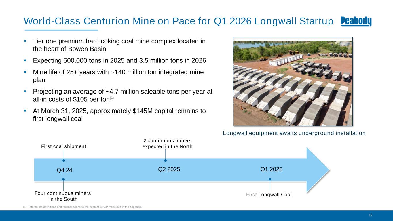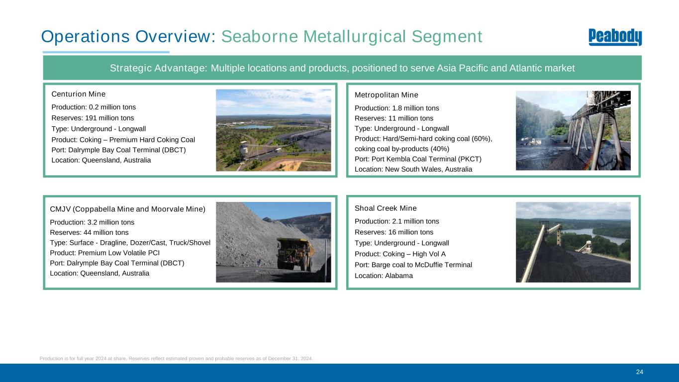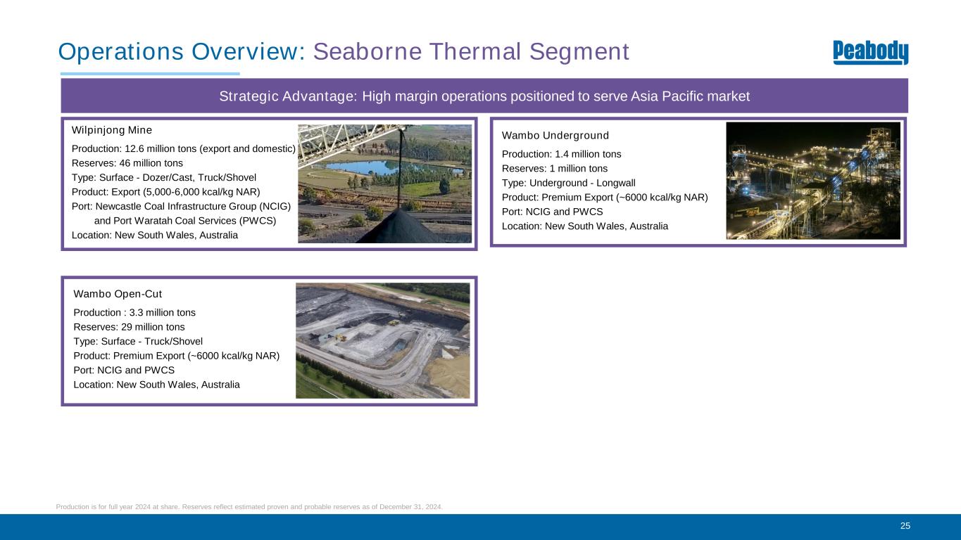 24 Operations Overview: Seaborne Metallurgical Segment Production is for full year 2024 at share. Reserves reflect estimated proven and probable reserves as of December 31, 2024. Strategic Advantage: Multiple locations and products, positioned to serve Asia Pacific and Atlantic market Metropolitan Mine Production: 1.8 million tons Reserves: 11 million tons Type: Underground - Longwall Product: Hard/Semi-hard coking coal (60%), coking coal by-products (40%) Port: Port Kembla Coal Terminal (PKCT) Location: New South Wales, Australia Shoal Creek Mine Production: 2.1 million tons Reserves: 16 million tons Type: Underground - Longwall Product: Coking – High Vol A Port: Barge coal to McDuffie Terminal Location: Alabama CMJV (Coppabella Mine and Moorvale Mine) Production: 3.2 million tons Reserves: 44 million tons Type: Surface - Dragline, Dozer/Cast, Truck/Shovel Product: Premium Low Volatile PCI Port: Dalrymple Bay Coal Terminal (DBCT) Location: Queensland, Australia Centurion Mine Production: 0.2 million tons Reserves: 191 million tons Type: Underground - Longwall Product: Coking – Premium Hard Coking Coal Port: Dalrymple Bay Coal Terminal (DBCT) Location: Queensland, Australia