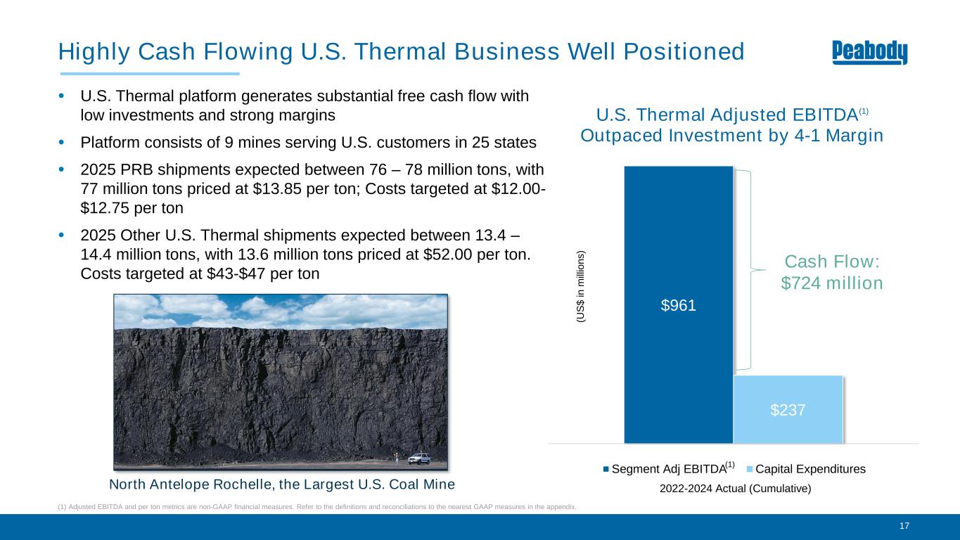16 U.S. Markets: Policy and Electricity Demand Landscape Creates Tailwinds for Domestic Coal • After 15 years of flat load growth, data centers now fuel projections for 2-3% CAGRs in U.S. power demand Analysts Project Strong Growth in U.S. Power Demand • President Trump authorized his administration to ramp up production of energy from coal • Deferrals in coal plant retirements constituting 35 GW of power • Existing coal plants at 42% utilization can run harder, driving increased U.S. thermal demand • Peabody being approached by potential new investors into power generation seeking secure supplies Need for Generation Creating Major Pause in Coal Plant Retirements Near-Term U.S. Coal Demand Tightening • U.S. EIA projects coal generation up 4% while coal production down 4% • Since first of the year, coal burn up 20% over prior year • Cold weather, strong power demand has drawn down stockpiles at mines and power plants • “Requirements” contracts running higher than prior year • Peabody customers confirming data-center-driven demand growth narrative (1) EIA, McKinsey & Company, Public Power, Bernstein, KPMG, Wood Mackenzie, Thomson Reuters. Data based on January reports for each period and available at: https://kpmg.com/au/en/home/insights/2021/02/coal-price-fx-market-forecasts.html. Data as of December 31, 2023. JP Morgan and Goldman Sachs analysis; America’s Power “Coal Plant Retirement Delays Jan. 2025”; U.S. EIA Monthly Energy Report; U.S. Short-Term Energy Outlook Mar. 6, 2025; Company analysis. Data Centers could Ignite a Surge in Power Demand1 U.S. Power Demand and 2024 Generation Capacity, TWh Non-data Centers Data Centers '24 Generation