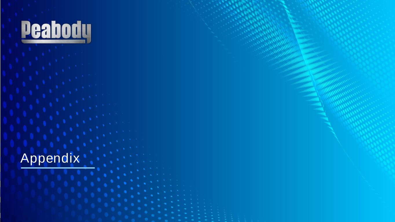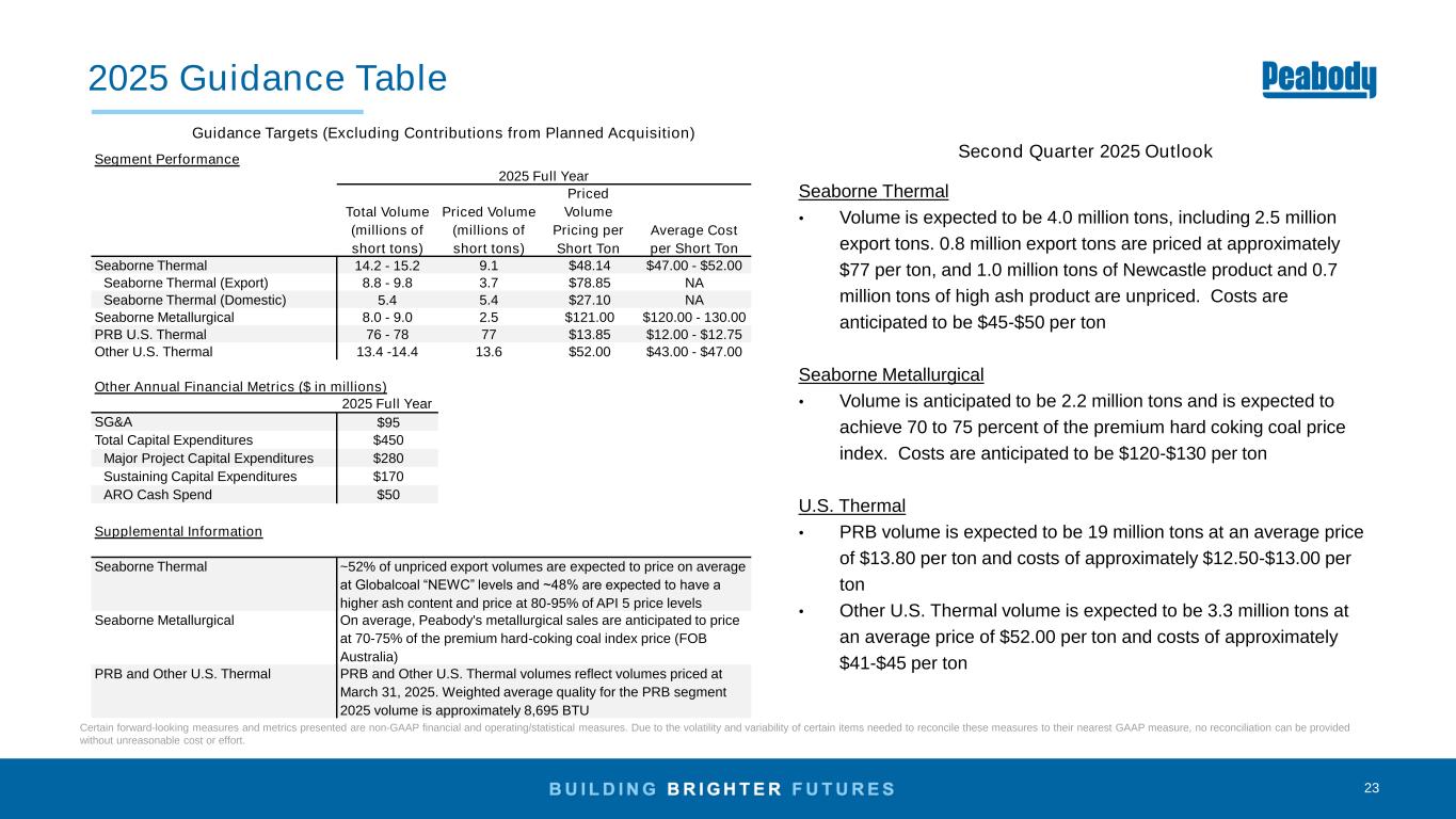 23 2025 Guidance Table Certain forward-looking measures and metrics presented are non-GAAP financial and operating/statistical measures. Due to the volatility and variability of certain items needed to reconcile these measures to their nearest GAAP measure, no reconciliation can be provided without unreasonable cost or effort. Guidance Targets (Excluding Contributions from Planned Acquisition) Second Quarter 2025 Outlook Seaborne Thermal • Volume is expected to be 4.0 million tons, including 2.5 million export tons. 0.8 million export tons are priced at approximately $77 per ton, and 1.0 million tons of Newcastle product and 0.7 million tons of high ash product are unpriced. Costs are anticipated to be $45-$50 per ton Seaborne Metallurgical • Volume is anticipated to be 2.2 million tons and is expected to achieve 70 to 75 percent of the premium hard coking coal price index. Costs are anticipated to be $120-$130 per ton U.S. Thermal • PRB volume is expected to be 19 million tons at an average price of $13.80 per ton and costs of approximately $12.50-$13.00 per ton • Other U.S. Thermal volume is expected to be 3.3 million tons at an average price of $52.00 per ton and costs of approximately $41-$45 per ton Segment Performance 2025 Full Year Total Volume (millions of short tons) Priced Volume (millions of short tons) Priced Volume Pricing per Short Ton Average Cost per Short Ton Seaborne Thermal 14.2 - 15.2 9.1 $48.14 $47.00 - $52.00 Seaborne Thermal (Export) 8.8 - 9.8 3.7 $78.85 NA Seaborne Thermal (Domestic) 5.4 5.4 $27.10 NA Seaborne Metallurgical 8.0 - 9.0 2.5 $121.00 $120.00 - 130.00 PRB U.S. Thermal 76 - 78 77 $13.85 $12.00 - $12.75 Other U.S. Thermal 13.4 -14.4 13.6 $52.00 $43.00 - $47.00 Other Annual Financial Metrics ($ in millions) 2025 Full Year SG&A $95 Total Capital Expenditures $450 Major Project Capital Expenditures $280 Sustaining Capital Expenditures $170 ARO Cash Spend $50 Supplemental Information Seaborne Thermal ~52% of unpriced export volumes are expected to price on average at Globalcoal “NEWC” levels and ~48% are expected to have a higher ash content and price at 80-95% of API 5 price levels Seaborne Metallurgical On average, Peabody's metallurgical sales are anticipated to price at 70-75% of the premium hard-coking coal index price (FOB Australia) PRB and Other U.S. Thermal PRB and Other U.S. Thermal volumes reflect volumes priced at March 31, 2025. Weighted average quality for the PRB segment 2025 volume is approximately 8,695 BTU