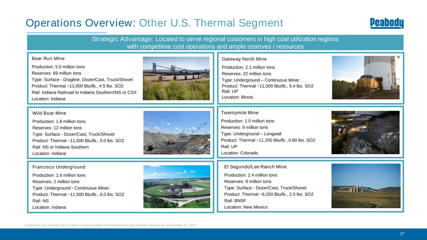 26 Operations Overview: PRB Segment Production is for full year 2024 at share. Reserves reflect estimated proven and probable reserves as of December 31, 2024. Strategic Advantage: Low-cost operations, largest producer, significant reserves, shared resources, technologies North Antelope Rochelle Mine (NARM) Production: 59.7 million tons Reserves: 1,300 million tons Type: Surface - Dragline, Dozer/Cast, Truck/Shovel Product: Sub-Bit Thermal (~8,800 BTU/lbs., <0.50 lbs. SO2) Rail: BNSF and UP Location: Wyoming Caballo Mine Production: 10.8 million tons Reserves: 168 million tons Type: Surface - Dozer/Cast, Truck/Shovel Product: Sub-Bit Thermal (~8,500 BTU/lb., 0.80 lbs. SO2) Rail: BNSF and UP Location: Wyoming Rawhide Mine Production: 9.1 million tons Reserves: 80 million tons Type: Surface - Dozer/Cast, Truck/Shovel Product: Sub-Bit Thermal (~8,300 BTU/lb., 0.85 lbs. SO2) Rail: BNSF Location: Wyoming