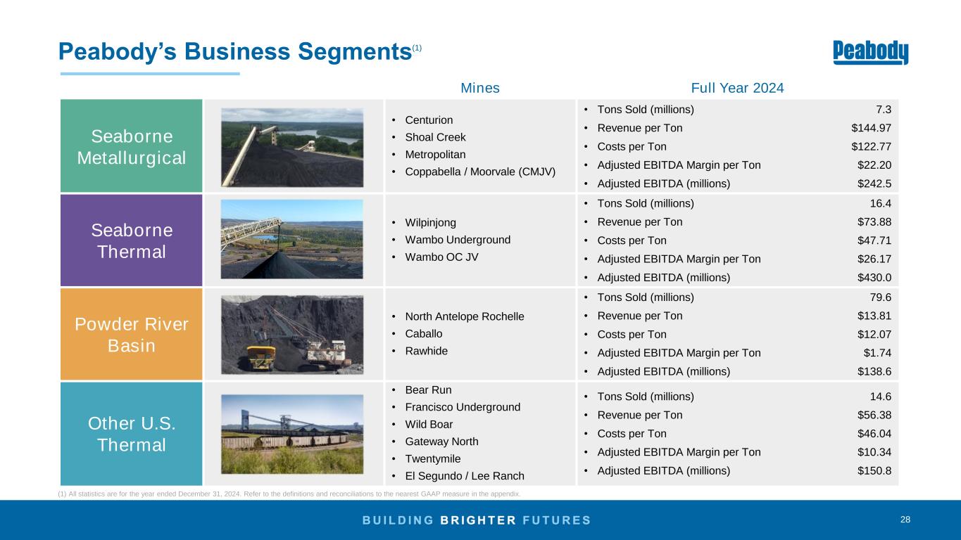 27 Operations Overview: Other U.S. Thermal Segment Production is for full year 2024 at share. Reserves reflect estimated proven and probable reserves as of December 31, 2024. Strategic Advantage: Located to serve regional customers in high coal utilization regions with competitive cost operations and ample reserves / resources Bear Run Mine Production: 5.0 million tons Reserves: 69 million tons Type: Surface - Dragline, Dozer/Cast, Truck/Shovel Product: Thermal ~11,000 Btu/lb., 4.5 lbs. SO2 Rail: Indiana Railroad to Indiana Southern/NS or CSX Location: Indiana Wild Boar Mine Production: 1.8 million tons Reserves: 12 million tons Type: Surface - Dozer/Cast, Truck/Shovel Product: Thermal ~11,000 Btu/lb., 5.0 lbs. SO2 Rail: NS or Indiana Southern Location: Indiana Francisco Underground Production: 1.6 million tons Reserves: 2 million tons Type: Underground - Continuous Miner Product: Thermal ~11,500 Btu/lb., 6.0 lbs. SO2 Rail: NS Location: Indiana Gateway North Mine Production: 2.1 million tons Reserves: 22 million tons Type: Underground – Continuous Miner Product: Thermal ~11,000 Btu/lb., 5.4 lbs. SO2 Rail: UP Location: Illinois Twentymile Mine Production: 1.0 million tons Reserves: 9 million tons Type: Underground – Longwall Product: Thermal ~11,200 Btu/lb., 0.80 lbs. SO2 Rail: UP Location: Colorado El Segundo/Lee Ranch Mine Production: 2.4 million tons Reserves: 8 million tons Type: Surface - Dozer/Cast, Truck/Shovel Product: Thermal ~9,250 Btu/lb., 2.0 lbs. SO2 Rail: BNSF Location: New Mexico