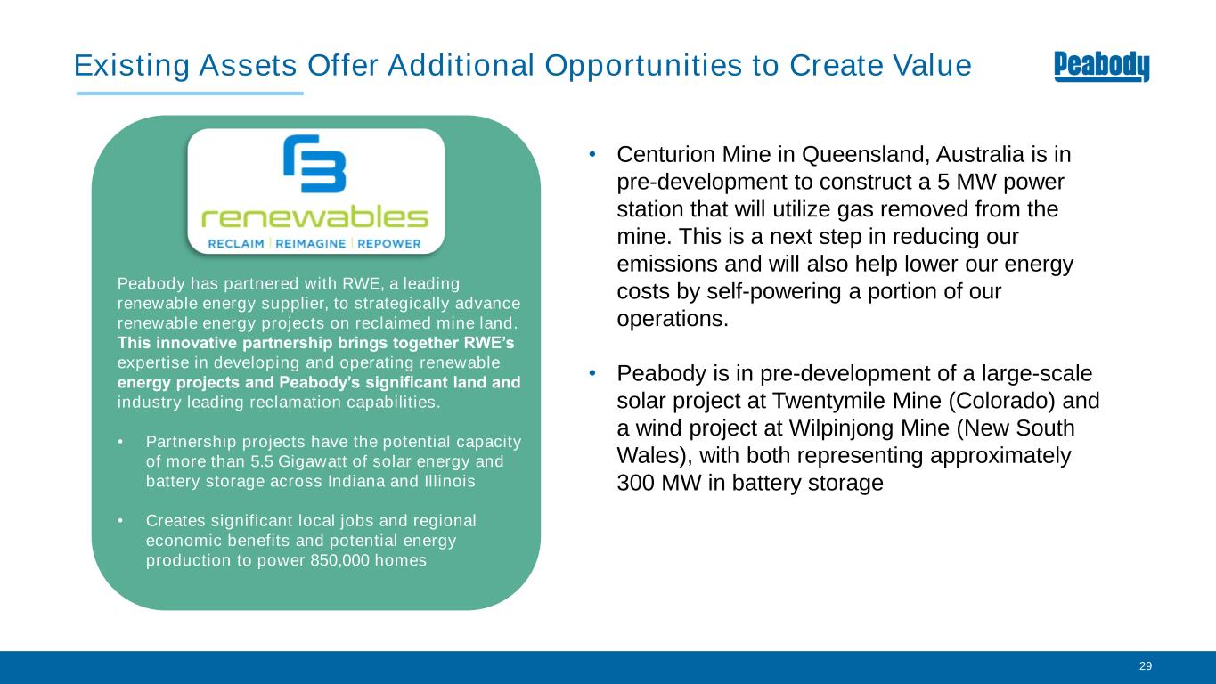 28 Peabody’s Business Segments(1) Mines Full Year 2024 Seaborne Metallurgical • Centurion • Shoal Creek • Metropolitan • Coppabella / Moorvale (CMJV) • Tons Sold (millions) • Revenue per Ton • Costs per Ton • Adjusted EBITDA Margin per Ton • Adjusted EBITDA (millions) 7.3 $144.97 $122.77 $22.20 $242.5 Seaborne Thermal • Wilpinjong • Wambo Underground • Wambo OC JV • Tons Sold (millions) • Revenue per Ton • Costs per Ton • Adjusted EBITDA Margin per Ton • Adjusted EBITDA (millions) 16.4 $73.88 $47.71 $26.17 $430.0 Powder River Basin • North Antelope Rochelle • Caballo • Rawhide • Tons Sold (millions) • Revenue per Ton • Costs per Ton • Adjusted EBITDA Margin per Ton • Adjusted EBITDA (millions) 79.6 $13.81 $12.07 $1.74 $138.6 Other U.S. Thermal • Bear Run • Francisco Underground • Wild Boar • Gateway North • Twentymile • El Segundo / Lee Ranch • Tons Sold (millions) • Revenue per Ton • Costs per Ton • Adjusted EBITDA Margin per Ton • Adjusted EBITDA (millions) 14.6 $56.38 $46.04 $10.34 $150.8 (1) All statistics are for the year ended December 31, 2024. Refer to the definitions and reconciliations to the nearest GAAP measure in the appendix.