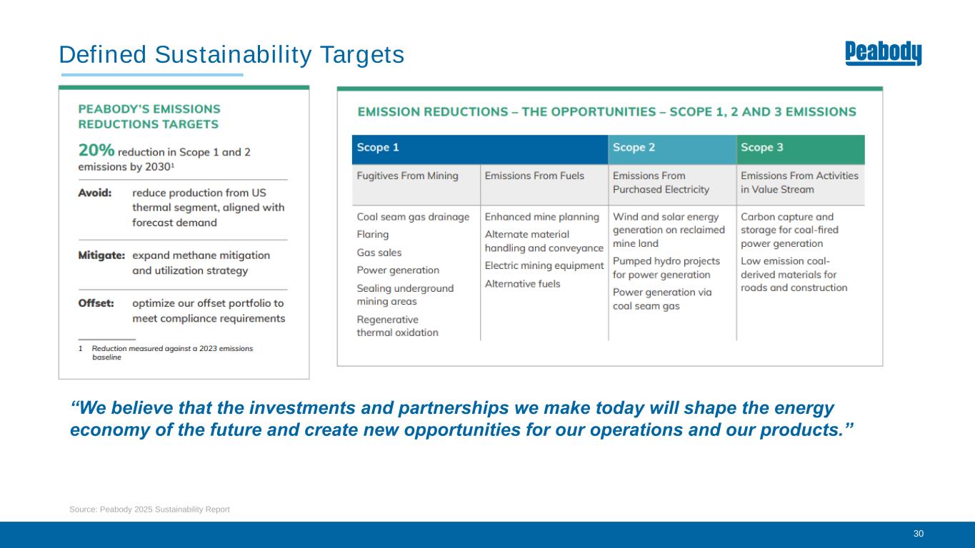 30 Defined Sustainability Targets “We believe that the investments and partnerships we make today will shape the energy economy of the future and create new opportunities for our operations and our products.” Source: Peabody 2025 Sustainability Report