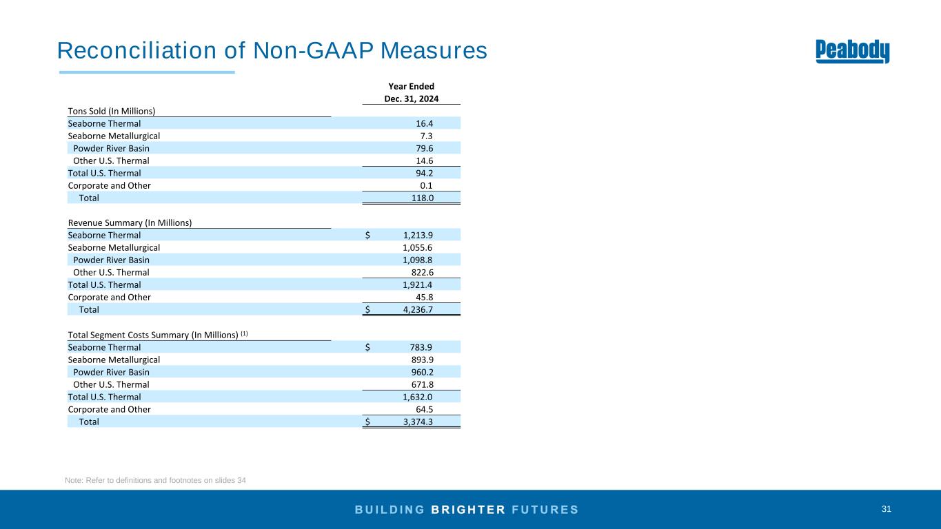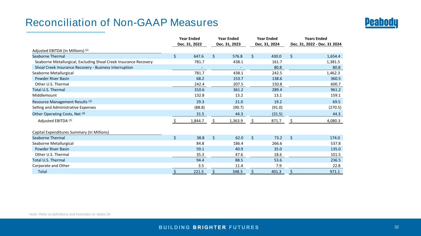 31 Reconciliation of Non-GAAP Measures Note: Refer to definitions and footnotes on slides 34 Year Ended Dec. 31, 2024 Tons Sold (In Millions) Seaborne Thermal 16.4 Seaborne Metallurgical 7.3 Powder River Basin 79.6 Other U.S. Thermal 14.6 Total U.S. Thermal 94.2 Corporate and Other 0.1 Total 118.0 Revenue Summary (In Millions) Seaborne Thermal $ 1,213.9 Seaborne Metallurgical 1,055.6 Powder River Basin 1,098.8 Other U.S. Thermal 822.6 Total U.S. Thermal 1,921.4 Corporate and Other 45.8 Total $ 4,236.7 Total Segment Costs Summary (In Millions) (1) Seaborne Thermal $ 783.9 Seaborne Metallurgical 893.9 Powder River Basin 960.2 Other U.S. Thermal 671.8 Total U.S. Thermal 1,632.0 Corporate and Other 64.5 Total $ 3,374.3
