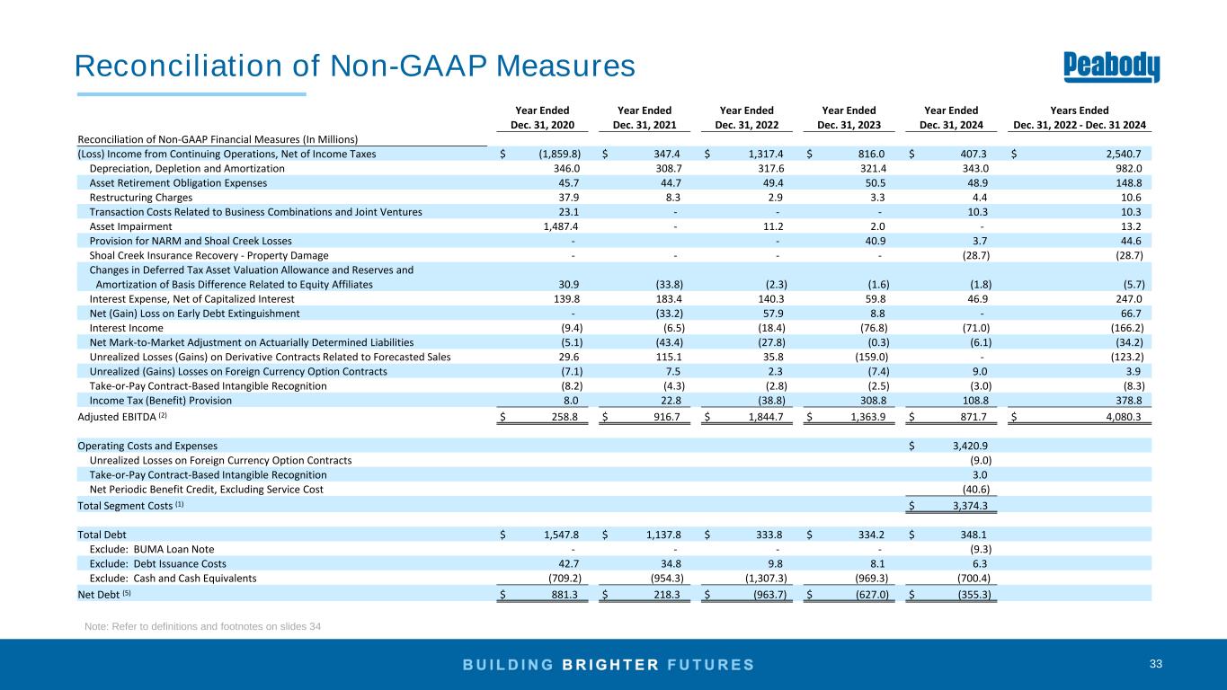 32 Reconciliation of Non-GAAP Measures Note: Refer to definitions and footnotes on slides 34 Year Ended Year Ended Year Ended Years Ended Dec. 31, 2022 Dec. 31, 2023 Dec. 31, 2024 Dec. 31, 2022 - Dec. 31 2024 Adjusted EBITDA (In Millions) (2) Seaborne Thermal $ 647.6 $ 576.8 $ 430.0 $ 1,654.4 Seaborne Metallurgical, Excluding Shoal Creek Insurance Recovery 781.7 438.1 161.7 1,381.5 Shoal Creek Insurance Recovery - Business Interruption - - 80.8 80.8 Seaborne Metallurgical 781.7 438.1 242.5 1,462.3 Powder River Basin 68.2 153.7 138.6 360.5 Other U.S. Thermal 242.4 207.5 150.8 600.7 Total U.S. Thermal 310.6 361.2 289.4 961.2 Middlemount 132.8 13.2 13.1 159.1 Resource Management Results (3) 29.3 21.0 19.2 69.5 Selling and Administrative Expenses (88.8) (90.7) (91.0) (270.5) Other Operating Costs, Net (4) 31.5 44.3 (31.5) 44.3 Adjusted EBITDA (2) $ 1,844.7 $ 1,363.9 $ 871.7 $ 4,080.3 Capital Expenditures Summary (In Millions) Seaborne Thermal $ 38.8 $ 62.0 $ 73.2 $ 174.0 Seaborne Metallurgical 84.8 186.4 266.6 537.8 Powder River Basin 59.1 40.9 35.0 135.0 Other U.S. Thermal 35.3 47.6 18.6 101.5 Total U.S. Thermal 94.4 88.5 53.6 236.5 Corporate and Other 3.5 11.4 7.9 22.8 Total $ 221.5 $ 348.3 $ 401.3 $ 971.1