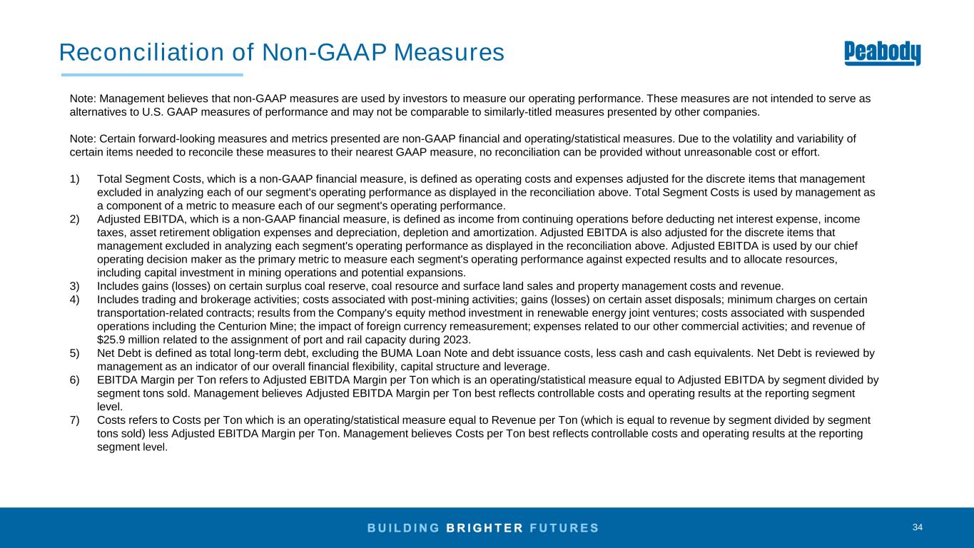 33 Reconciliation of Non-GAAP Measures Note: Refer to definitions and footnotes on slides 34 Year Ended Year Ended Year Ended Year Ended Year Ended Years Ended Dec. 31, 2020 Dec. 31, 2021 Dec. 31, 2022 Dec. 31, 2023 Dec. 31, 2024 Dec. 31, 2022 - Dec. 31 2024 Reconciliation of Non-GAAP Financial Measures (In Millions) (Loss) Income from Continuing Operations, Net of Income Taxes $ (1,859.8) $ 347.4 $ 1,317.4 $ 816.0 $ 407.3 $ 2,540.7 Depreciation, Depletion and Amortization 346.0 308.7 317.6 321.4 343.0 982.0 Asset Retirement Obligation Expenses 45.7 44.7 49.4 50.5 48.9 148.8 Restructuring Charges 37.9 8.3 2.9 3.3 4.4 10.6 Transaction Costs Related to Business Combinations and Joint Ventures 23.1 - - - 10.3 10.3 Asset Impairment 1,487.4 - 11.2 2.0 - 13.2 Provision for NARM and Shoal Creek Losses - - 40.9 3.7 44.6 Shoal Creek Insurance Recovery - Property Damage - - - - (28.7) (28.7) Changes in Deferred Tax Asset Valuation Allowance and Reserves and Amortization of Basis Difference Related to Equity Affiliates 30.9 (33.8) (2.3) (1.6) (1.8) (5.7) Interest Expense, Net of Capitalized Interest 139.8 183.4 140.3 59.8 46.9 247.0 Net (Gain) Loss on Early Debt Extinguishment - (33.2) 57.9 8.8 - 66.7 Interest Income (9.4) (6.5) (18.4) (76.8) (71.0) (166.2) Net Mark-to-Market Adjustment on Actuarially Determined Liabilities (5.1) (43.4) (27.8) (0.3) (6.1) (34.2) Unrealized Losses (Gains) on Derivative Contracts Related to Forecasted Sales 29.6 115.1 35.8 (159.0) - (123.2) Unrealized (Gains) Losses on Foreign Currency Option Contracts (7.1) 7.5 2.3 (7.4) 9.0 3.9 Take-or-Pay Contract-Based Intangible Recognition (8.2) (4.3) (2.8) (2.5) (3.0) (8.3) Income Tax (Benefit) Provision 8.0 22.8 (38.8) 308.8 108.8 378.8 Adjusted EBITDA (2) $ 258.8 $ 916.7 $ 1,844.7 $ 1,363.9 $ 871.7 $ 4,080.3 Operating Costs and Expenses $ 3,420.9 Unrealized Losses on Foreign Currency Option Contracts (9.0) Take-or-Pay Contract-Based Intangible Recognition 3.0 Net Periodic Benefit Credit, Excluding Service Cost (40.6) Total Segment Costs (1) $ 3,374.3 Total Debt $ 1,547.8 $ 1,137.8 $ 333.8 $ 334.2 $ 348.1 Exclude: BUMA Loan Note - - - - (9.3) Exclude: Debt Issuance Costs 42.7 34.8 9.8 8.1 6.3 Exclude: Cash and Cash Equivalents (709.2) (954.3) (1,307.3) (969.3) (700.4) Net Debt (5) $ 881.3 $ 218.3 $ (963.7) $ (627.0) $ (355.3)