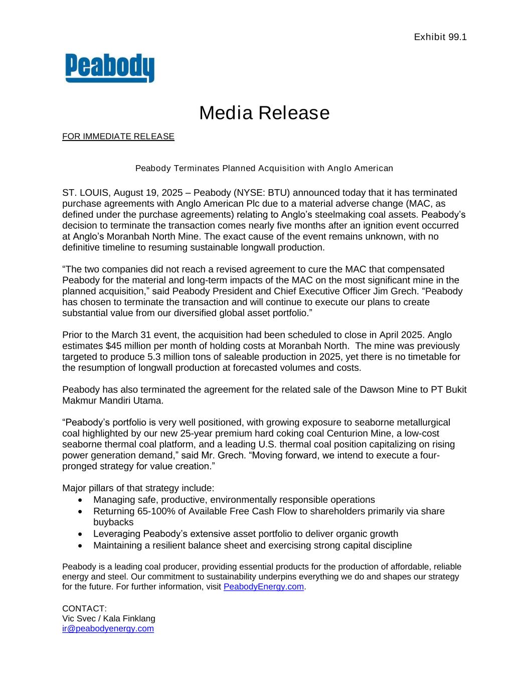 Media Release FOR IMMEDIATE RELEASE Peabody Terminates Planned Acquisition with Anglo American ST. LOUIS, August 19, 2025 – Peabody (NYSE: BTU) announced today that it has terminated purchase agreements with Anglo American Plc due to a material adverse change (MAC, as defined under the purchase agreements) relating to Anglo’s steelmaking coal assets. Peabody’s decision to terminate the transaction comes nearly five months after an ignition event occurred at Anglo’s Moranbah North Mine. The exact cause of the event remains unknown, with no definitive timeline to resuming sustainable longwall production. “The two companies did not reach a revised agreement to cure the MAC that compensated Peabody for the material and long-term impacts of the MAC on the most significant mine in the planned acquisition,” said Peabody President and Chief Executive Officer Jim Grech. “Peabody has chosen to terminate the transaction and will continue to execute our plans to create substantial value from our diversified global asset portfolio.” Prior to the March 31 event, the acquisition had been scheduled to close in April 2025. Anglo estimates $45 million per month of holding costs at Moranbah North. The mine was previously targeted to produce 5.3 million tons of saleable production in 2025, yet there is no timetable for the resumption of longwall production at forecasted volumes and costs. Peabody has also terminated the agreement for the related sale of the Dawson Mine to PT Bukit Makmur Mandiri Utama. “Peabody’s portfolio is very well positioned, with growing exposure to seaborne metallurgical coal highlighted by our new 25-year premium hard coking coal Centurion Mine, a low-cost seaborne thermal coal platform, and a leading U.S. thermal coal position capitalizing on rising power generation demand,” said Mr. Grech. “Moving forward, we intend to execute a four- pronged strategy for value creation.” Major pillars of that strategy include: • Managing safe, productive, environmentally responsible operations • Returning 65-100% of Available Free Cash Flow to shareholders primarily via share buybacks • Leveraging Peabody’s extensive asset portfolio to deliver organic growth • Maintaining a resilient balance sheet and exercising strong capital discipline Peabody is a leading coal producer, providing essential products for the production of affordable, reliable energy and steel. Our commitment to sustainability underpins everything we do and shapes our strategy for the future. For further information, visit PeabodyEnergy.com. CONTACT: Vic Svec / Kala Finklang ir@peabodyenergy.com