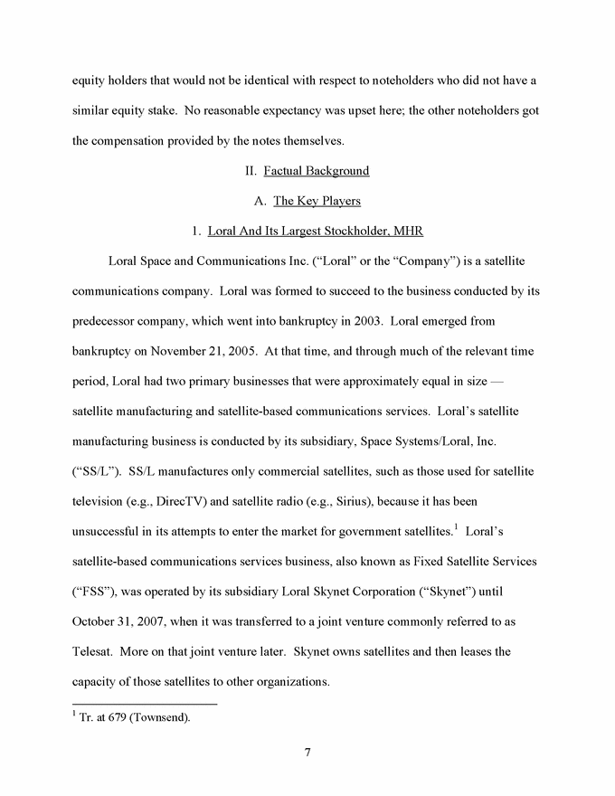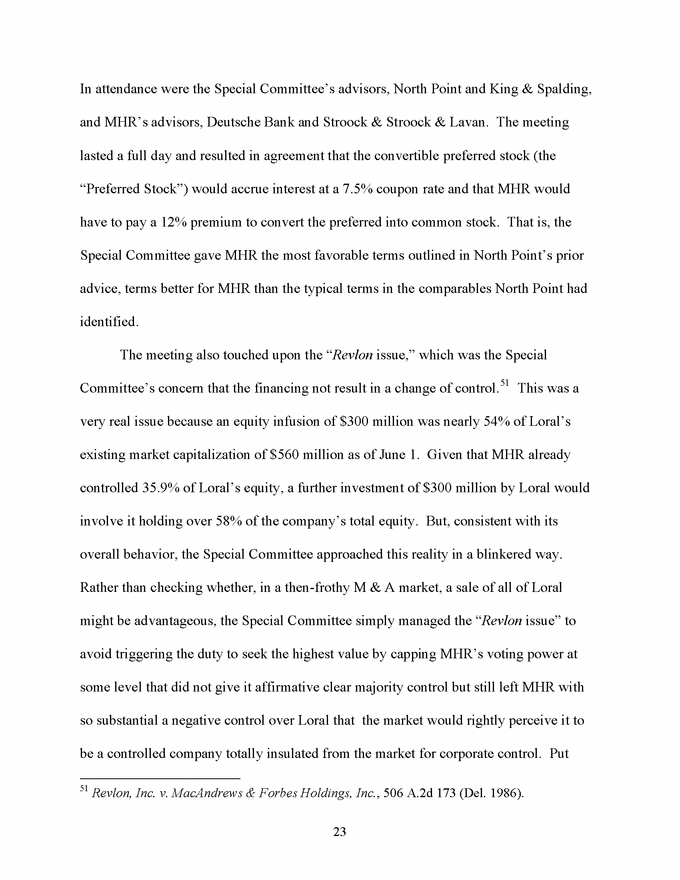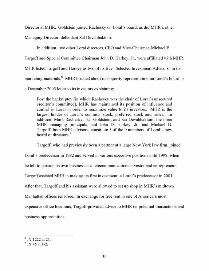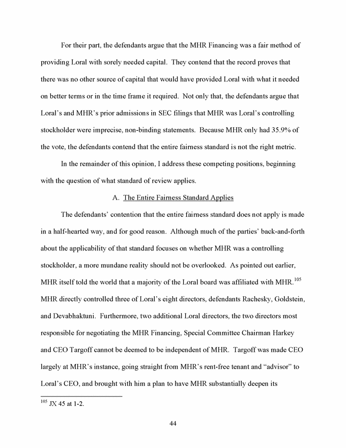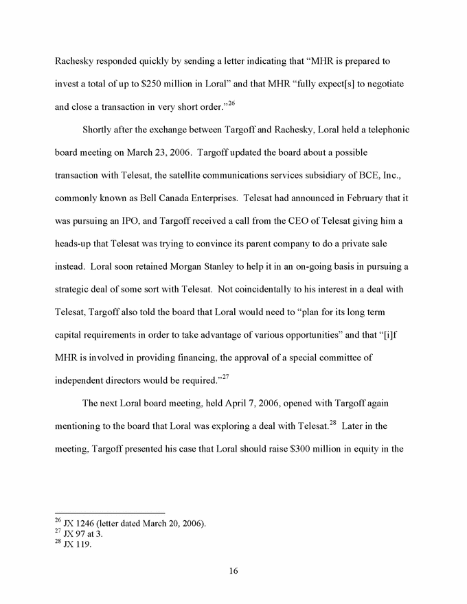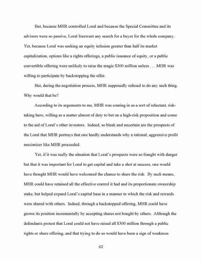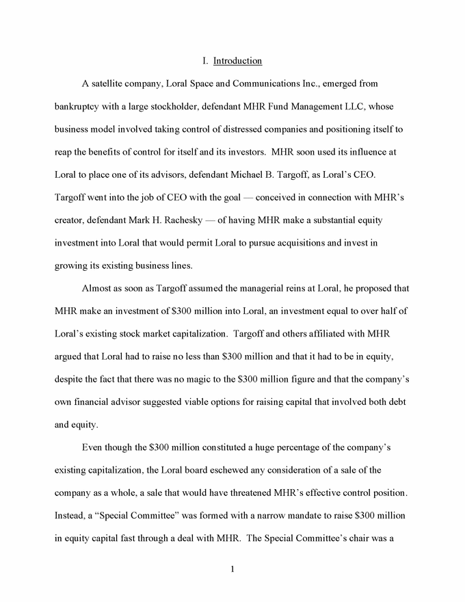 In the opinion, Chancellor Strine found that, “MHR soon used its influence at Loral to place one of its advisors, defendant Michael B. Targoff, as Loral’s CEO. Targoff went into the job of CEO with the goal — conceived in connection with MHR’s creator, defendant Mark. H. Rachesky — of having MHR make a substantial equity investment into Loral.” (opinion p. 1) “Almost as soon as Targoff assumed the managerial reins at Loral, he proposed that MHR make an investment of $300 million into Loral, an investment equal to over half of Loral’s existing stock market capitalization. Targoff and others affiliated with MHR argued that Loral had to raise no less than $300 million and that it had to be in equity, despite the fact that there was no magic to the $300 million figure and that the company’s own financial advisors suggested viable options for raising capital that involved both debt and equity.” (opinion p. 1)