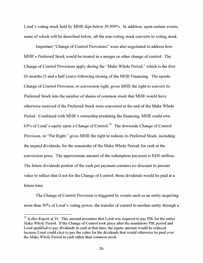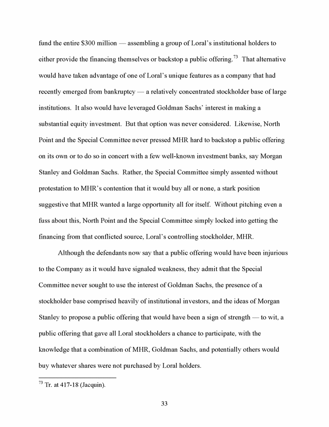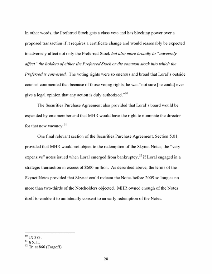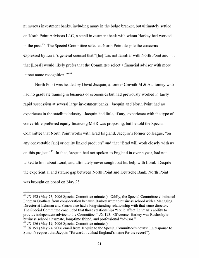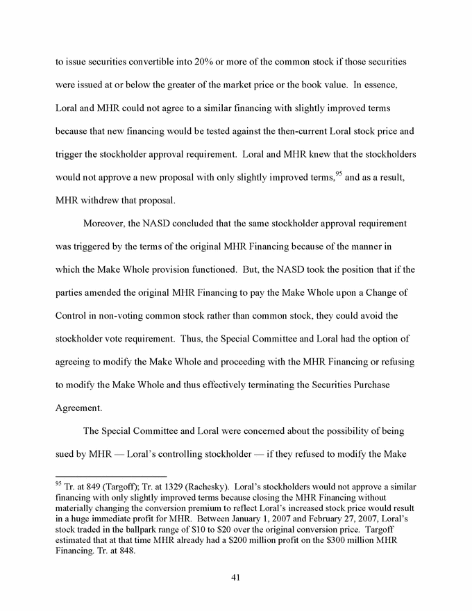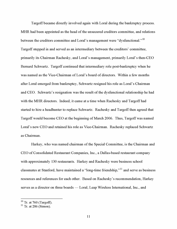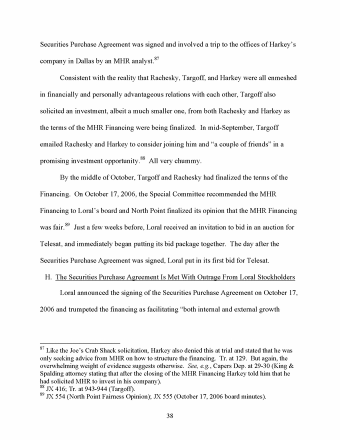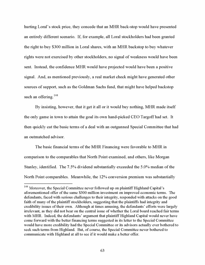 In the opinion, Chancellor Strine found that, “MHR soon used its influence at Loral to place one of its advisors, defendant Michael B. Targoff, as Loral’s CEO. Targoff went into the job of CEO with the goal — conceived in connection with MHR’s creator, defendant Mark. H. Rachesky — of having MHR make a substantial equity investment into Loral.” (opinion p. 1) “Almost as soon as Targoff assumed the managerial reins at Loral, he proposed that MHR make an investment of $300 million into Loral, an investment equal to over half of Loral’s existing stock market capitalization. Targoff and others affiliated with MHR argued that Loral had to raise no less than $300 million and that it had to be in equity, despite the fact that there was no magic to the $300 million figure and that the company’s own financial advisors suggested viable options for raising capital that involved both debt and equity.” (opinion p. 1)