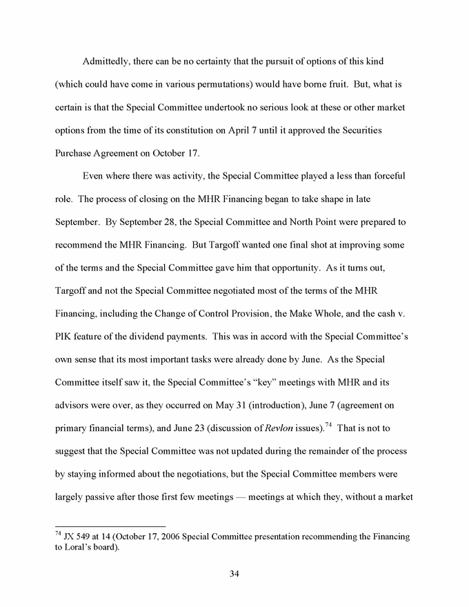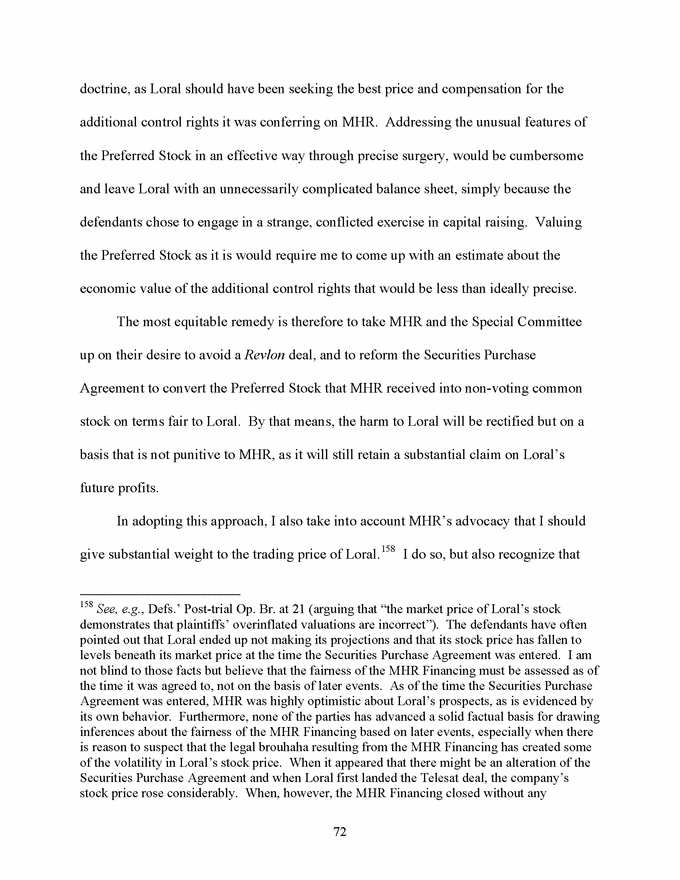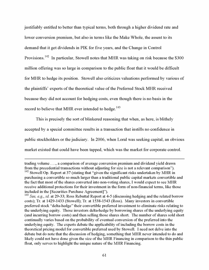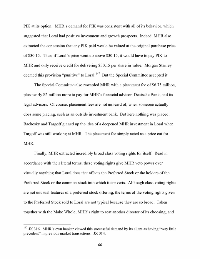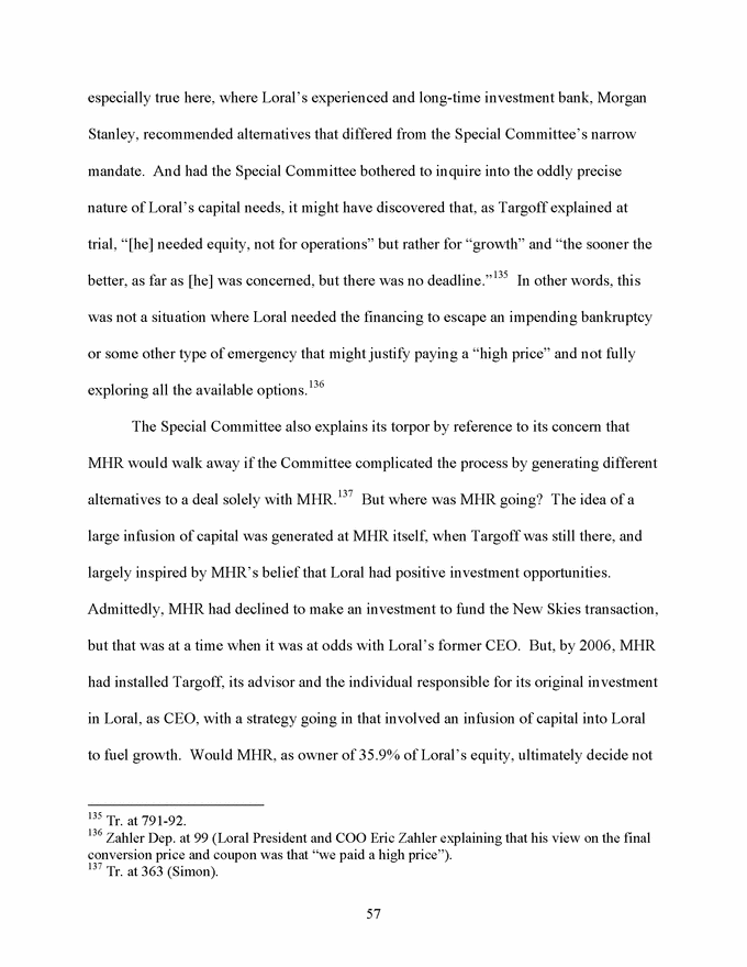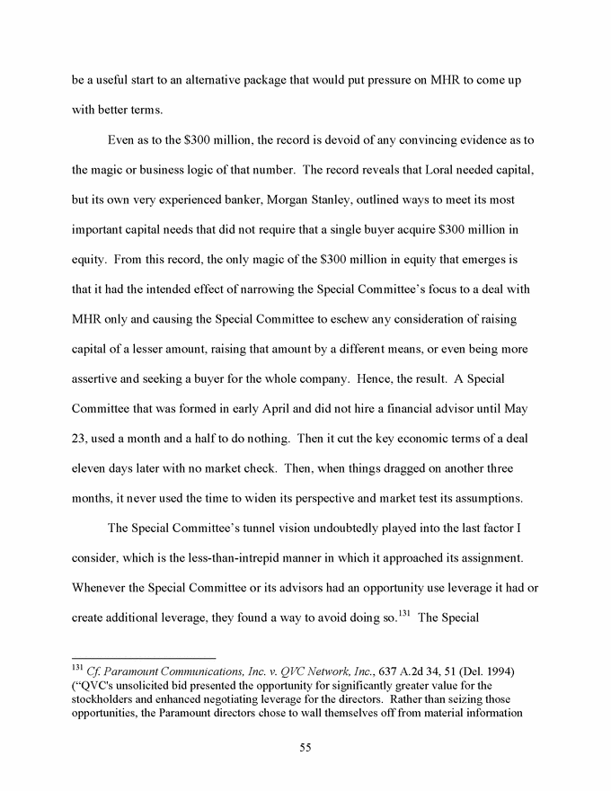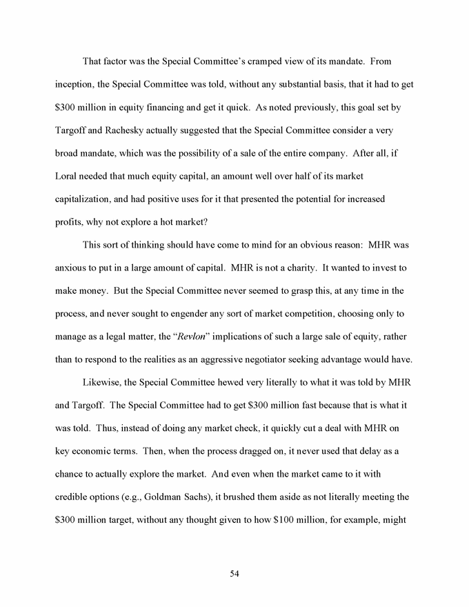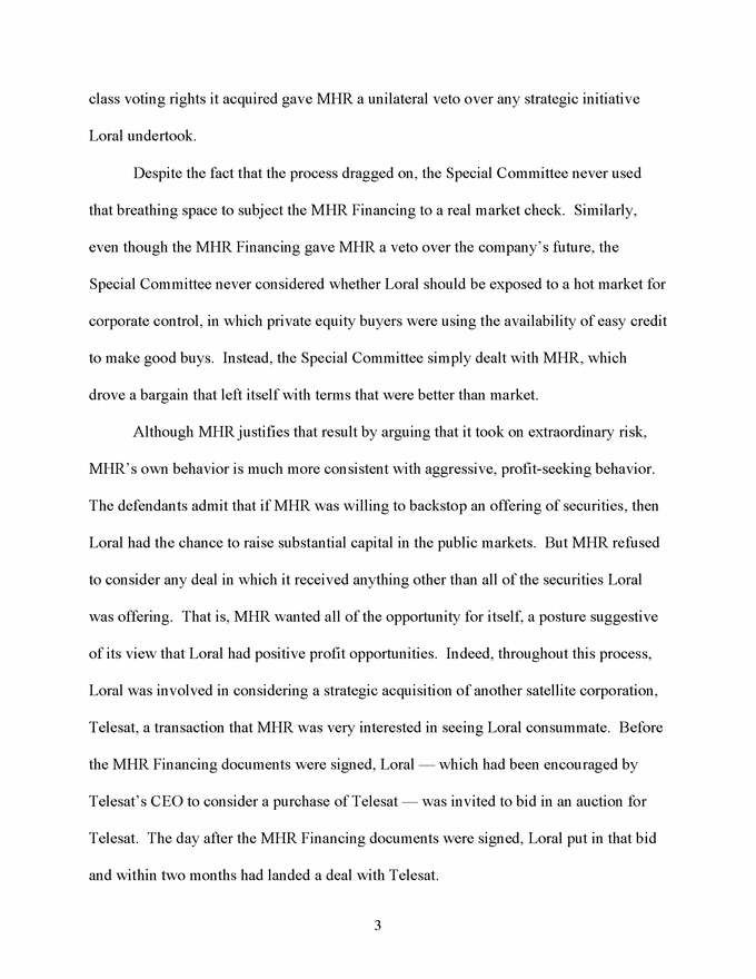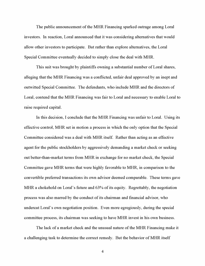 whether Loral should be exposed to a hot market for corporate control, in which private equity buyers were using the availability of easy credit to make good buys. Instead, the Special Committee simply dealt with MHR, which drove a bargain that left itself with terms that were better than market.” (opinion p. 3)