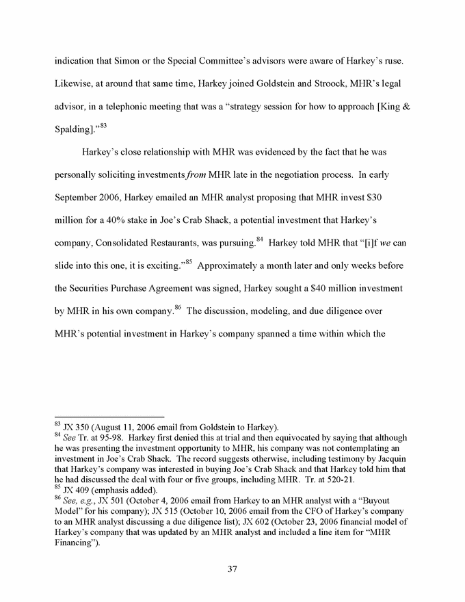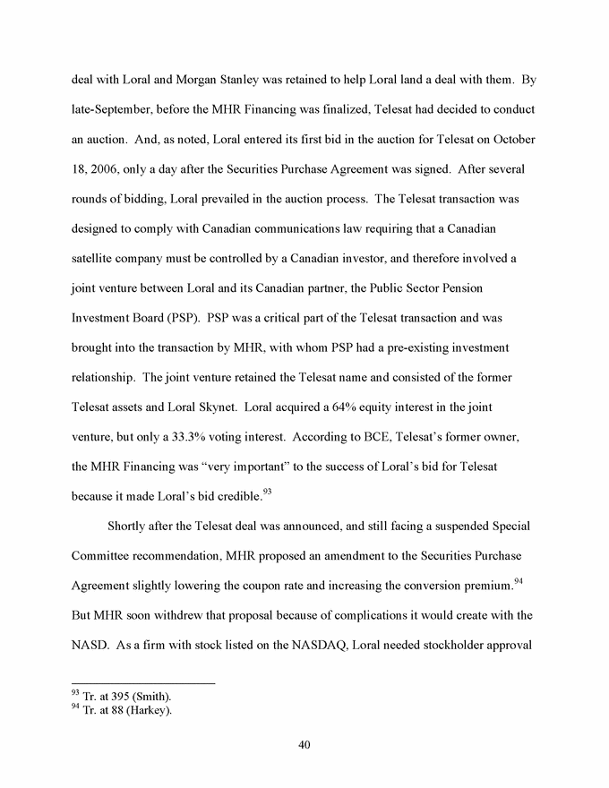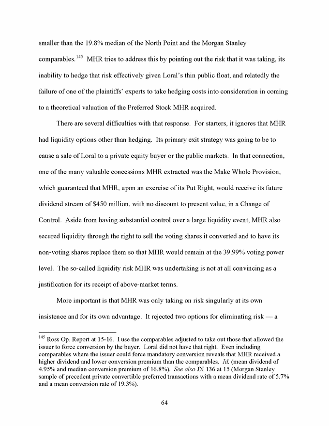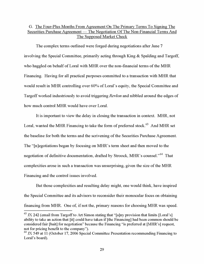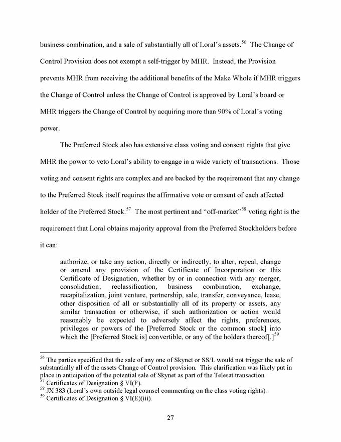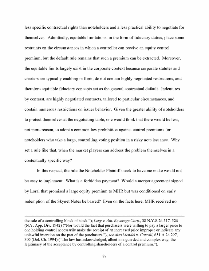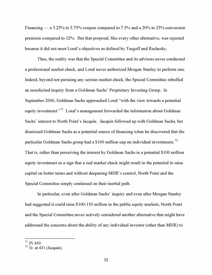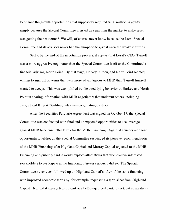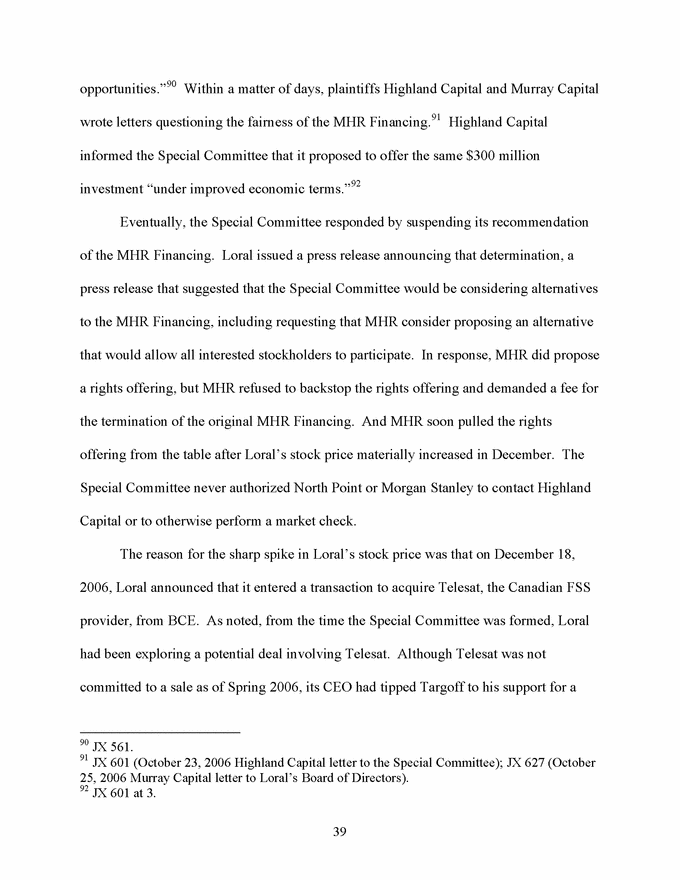 whether Loral should be exposed to a hot market for corporate control, in which private equity buyers were using the availability of easy credit to make good buys. Instead, the Special Committee simply dealt with MHR, which drove a bargain that left itself with terms that were better than market.” (opinion p. 3)
