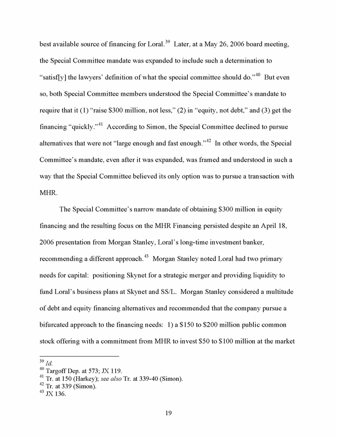 · “The Special Committee’s narrow mandate of obtaining $300 million in equity financing and the resulting focus on the MHR Financing persisted despite an April 18, 2006 presentation from Morgan Stanley, Loral’s long-time investment banker, recommending a different approach.” (opinion p. 19)