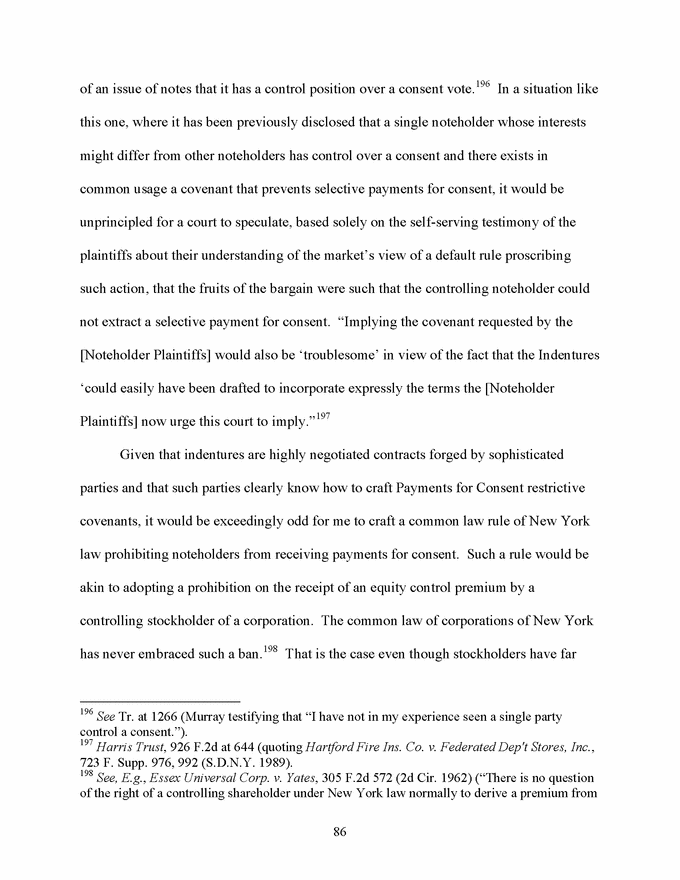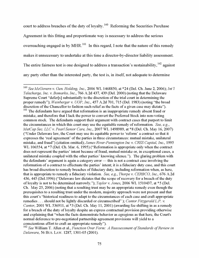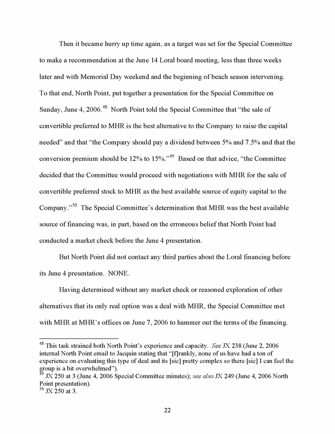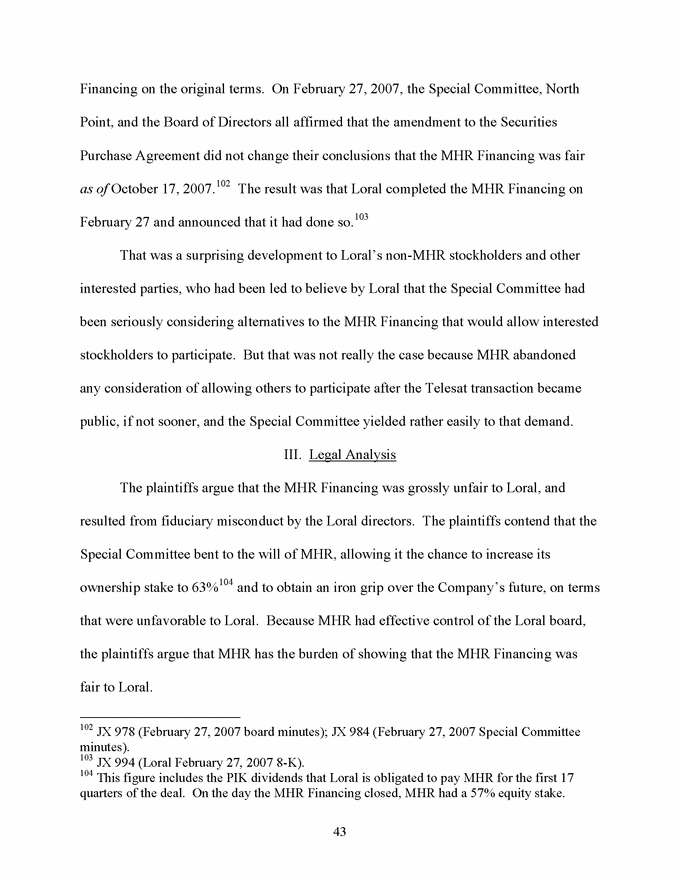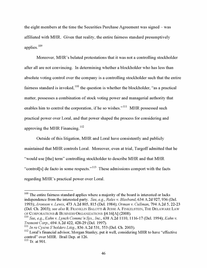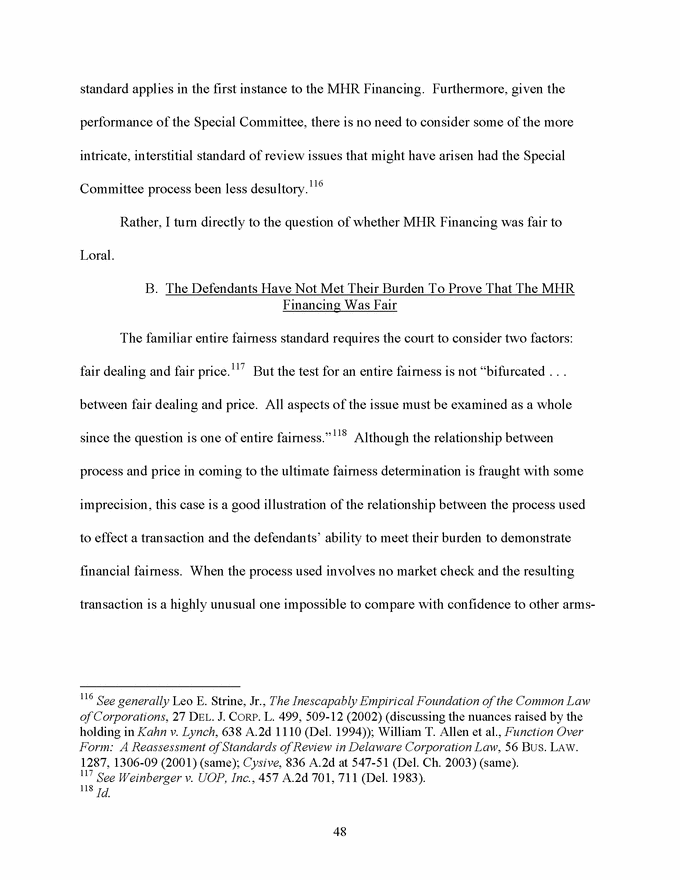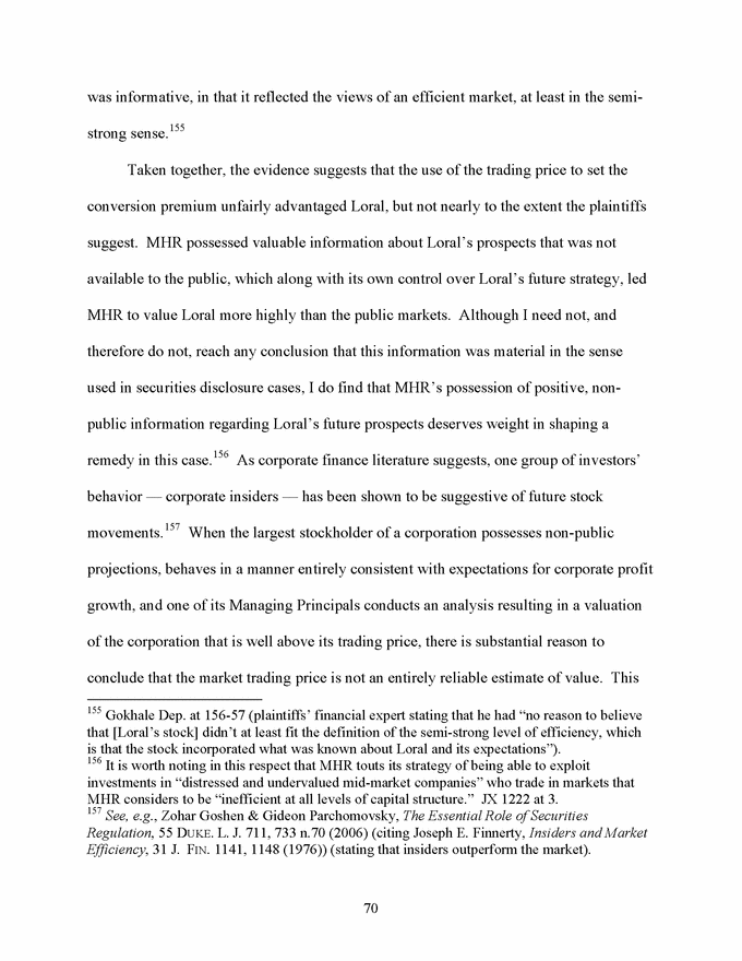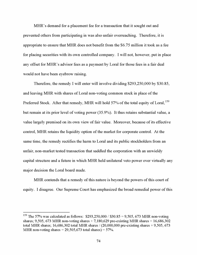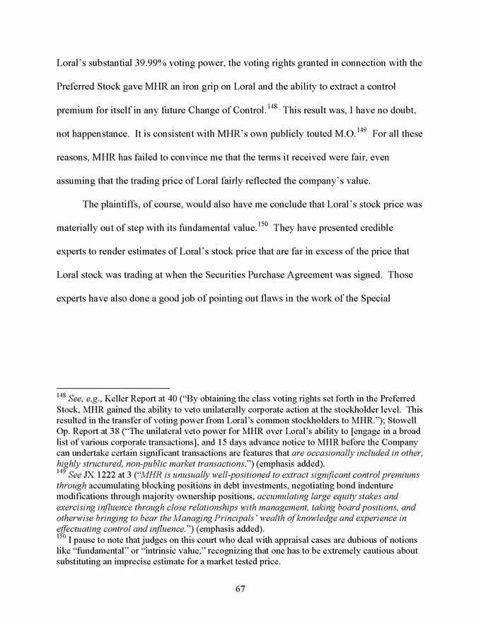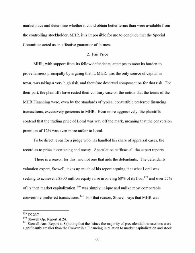 Chancellor Strine concluded that “the MHR Financing was unfair to Loral. Using its effective control, MHR set in motion a process in which the only option that the Special Committee considered was a deal with MHR itself. Rather than acting as an effective agent for the public stockholders by aggressively demanding a market check or seeking out better-than-market terms from MHR in exchange for no market check, the Special Committee gave MHR terms that were highly favorable to MHR, in comparison to the convertible preferred transactions its own advisor deemed comparable. These terms gave MHR a chokehold on Loral’s future and 63% of its equity. Regrettably, the negotiation process was also marred by the conduct of its chairman and financial advisor, who undercut Loral’s own negotiation position. Even more egregiously, during the special committee process, its chairman was seeking to have MHR invest in his own business.” “The behavior of MHR itself suggests that Loral had positive growth prospects that MHR wanted to capture solely for itself; growth prospects that MHR was uniquely positioned to know about and that were not known by the public markets.” (opinion pp. 4-5)
