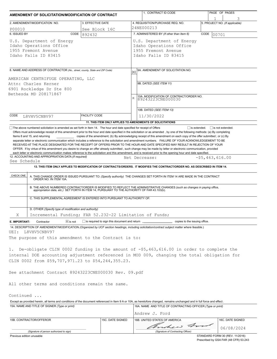 ___________ (x) x 89243223CNE000030 copies of the amendment; (b) By acknowledging receipt of this amendment on each copy of the offer submitted ; or (c) By separate letter or electronic communication which includes a reference to the solicitation and amendment numbers. FAILURE OF YOUR ACKNOWLEDGEMENT TO BE RECEIVED AT THE PLACE DESIGNATED FOR THE RECEIPT OF OFFERS PRIOR TO THE HOUR AND DATE SPECIFIED MAY RESULT IN REJECTION OF YOUR OFFER. If by virtue of this amendment you desire to change an offer already submitted , such change may be made by letter or electronic communication, provided each letter or electronic communication makes reference to the solicitation and this amendment, and is received prior to the opening hour and date specified. See Schedule L8VHV5CNBV97 AMERICAN CENTRIFUGE OPERATING, LLC 00701 Idaho Falls ID 83415 1955 Fremont Avenue Idaho Operations Office U.S. Department of Energy 892432 Idaho Falls ID 83415 1955 Fremont Avenue Idaho Operations Office U.S. Department of Energy 24NE000213See Block 16CP00010 31 13. THIS ITEM ONLY APPLIES TO MODIFICATION OF CONTRACTS/ORDERS. IT MODIFIES THE CONTRACT/ORDER NO. AS DESCRIBED IN ITEM 14. 12. ACCOUNTING AND APPROPRIATION DATA (If required) is not extended.is extended, Items 8 and 15, and returning Offers must acknowledge receipt of this amendment prior to the hour and date specified in the solicitation or as amended , by one of the following methods: (a) By completing The above numbered solicitation is amended as set forth in Item 14. The hour and date specified for receipt of Offers 11. THIS ITEM ONLY APPLIES TO AMENDMENTS OF SOLICITATIONS FACILITY CODE CODE 10B. DATED (SEE ITEM 13) 10A. MODIFICATION OF CONTRACT/ORDER NO. 9B. DATED (SEE ITEM 11) 9A. AMENDMENT OF SOLICITATION NO. CODE 8. NAME AND ADDRESS OF CONTRACTOR (No., street, county, State and ZIP Code) 7. ADMINISTERED BY (If other than Item 6)CODE 6. ISSUED BY PAGE OF PAGES 4. REQUISITION/PURCHASE REQ. NO.3. EFFECTIVE DATE2. AMENDMENT/MODIFICATION NO. 5. PROJECT NO. (If applicable) 1. CONTRACT ID CODE AMENDMENT OF SOLICITATION/MODIFICATION OF CONTRACT 11/30/2022 Attn: Charles Kerner 6901 Rockledge Dr Ste 800 Bethesda MD 208171867 Net Decrease: -$5,463,616.00 CHECK ONE A. THIS CHANGE ORDER IS ISSUED PURSUANT TO: (Specify authority) THE CHANGES SET FORTH IN ITEM 14 ARE MADE IN THE CONTRACT B. THE ABOVE NUMBERED CONTRACT/ORDER IS MODIFIED TO REFLECT THE ADMINISTRATIVE CHANGES (such as changes in paying office, C. THIS SUPPLEMENTAL AGREEMENT IS ENTERED INTO PURSUANT TO AUTHORITY OF: D. OTHER (Specify type of modification and authority) appropriation data, etc.) SET FORTH IN ITEM 14, PURSUANT TO THE AUTHORITY OF FAR 43.103(b). E. IMPORTANT: Contractor is not is required to sign this document and return __________________ copies to the issuing office. ORDER NO. IN ITEM 10A. Incremental Funding; FAR 52.232-22 Limitation of Funds; x 14. DESCRIPTION OF AMENDMENT/MODIFICATION (Organized by UCF section headings, including solicitation/contract subject matter where feasible.) X UEI: L8VHV5CNBV97 The purpose of this amendment to the Contract is to: 1. De-obligate CLIN 0002 funding in the amount of -$5,463,616.00 in order to complete the internal DOE accounting adjustment referenced in MOD 009, changing the total obligation for CLIN 0002 from $59,707,971.23 to $54,244,355.23. See attachment Contract 89243223CNE000030 Rev. 09.pdf All other terms and conditions remain the same. Continued ... 16A. NAME AND TITLE OF CONTRACTING OFFICER (Type or print)15A. NAME AND TITLE OF SIGNER (Type or print) 15C. DATE SIGNED 16B. UNITED STATES OF AMERICA 15B. CONTRACTOR/OFFEROR 16C. DATE SIGNED (Signature of person authorized to sign) (Signature of Contracting Officer) Andrew J. Ford STANDARD FORM 30 (REV. 11/2016) Prescribed by GSA FAR (48 CFR) 53.243 Previous edition unusable Except as provided herein, all terms and conditions of the document referenced in Item 9 A or 10A, as heretofore changed, remains unchanged and in full force and effect . 06/08/2024