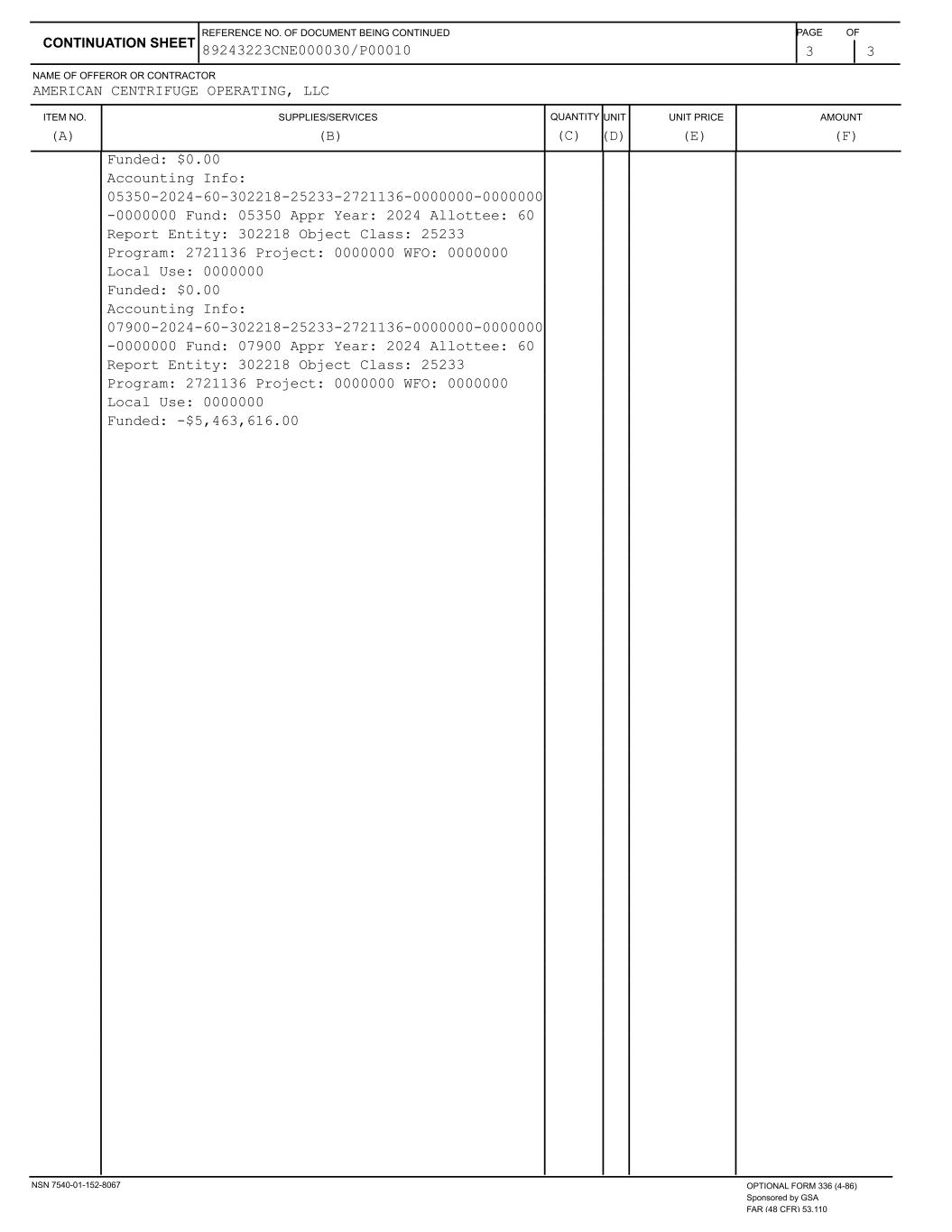 ITEM NO. SUPPLIES/SERVICES QUANTITY UNIT UNIT PRICE AMOUNT NAME OF OFFEROR OR CONTRACTOR 3 3 CONTINUATION SHEET REFERENCE NO. OF DOCUMENT BEING CONTINUED PAGE OF AMERICAN CENTRIFUGE OPERATING, LLC (A) (B) (C) (D) (E) (F) 89243223CNE000030/P00010 Funded: $0.00 Accounting Info: 05350-2024-60-302218-25233-2721136-0000000-0000000 -0000000 Fund: 05350 Appr Year: 2024 Allottee: 60 Report Entity: 302218 Object Class: 25233 Program: 2721136 Project: 0000000 WFO: 0000000 Local Use: 0000000 Funded: $0.00 Accounting Info: 07900-2024-60-302218-25233-2721136-0000000-0000000 -0000000 Fund: 07900 Appr Year: 2024 Allottee: 60 Report Entity: 302218 Object Class: 25233 Program: 2721136 Project: 0000000 WFO: 0000000 Local Use: 0000000 Funded: -$5,463,616.00 NSN 7540-01-152-8067 OPTIONAL FORM 336 (4-86) Sponsored by GSA FAR (48 CFR) 53.110