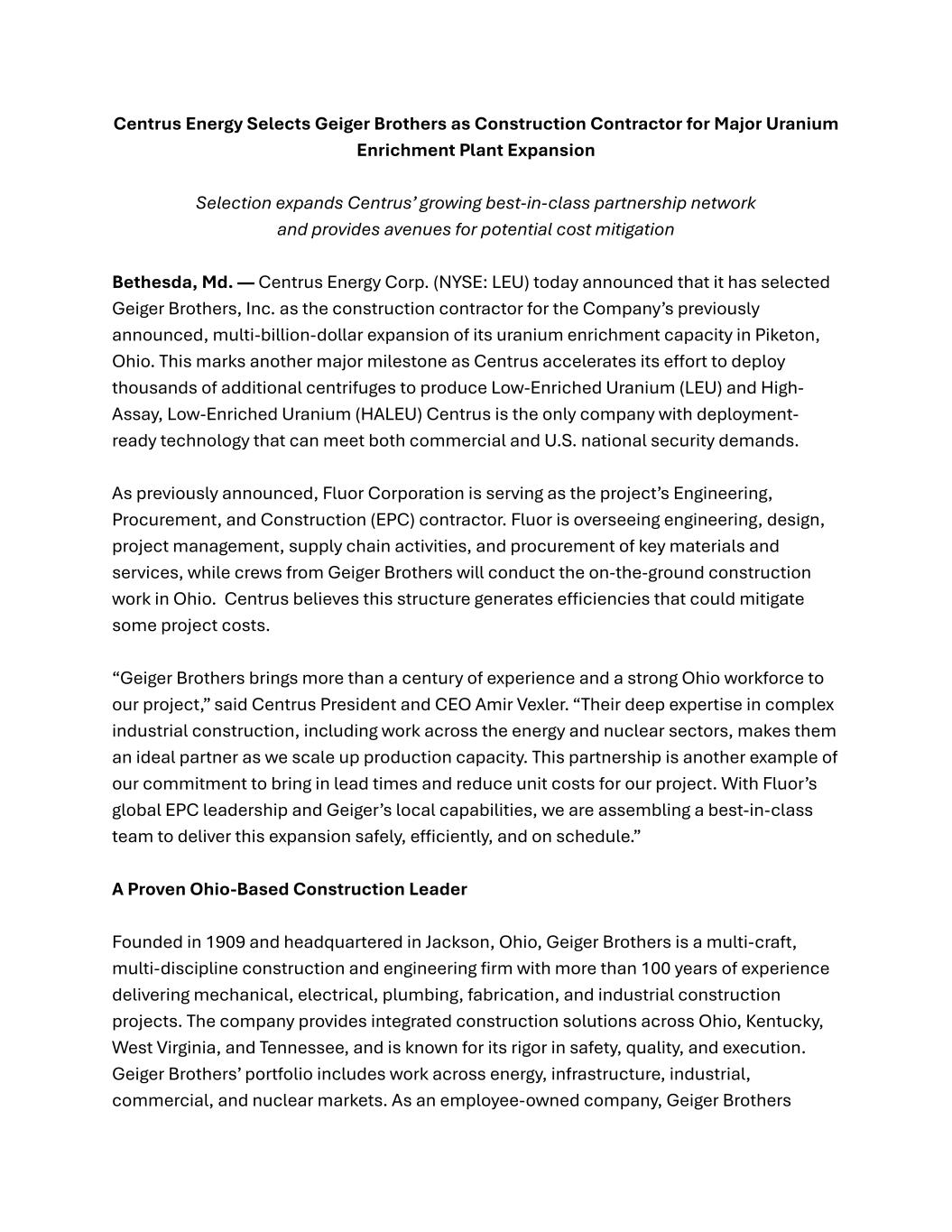 Centrus Energy Selects Geiger Brothers as Construction Contractor for Major Uranium Enrichment Plant Expansion Selection expands Centrus’ growing best-in-class partnership network and provides avenues for potential cost mitigation Bethesda, Md. — Centrus Energy Corp. (NYSE: LEU) today announced that it has selected Geiger Brothers, Inc. as the construction contractor for the Company’s previously announced, multi-billion-dollar expansion of its uranium enrichment capacity in Piketon, Ohio. This marks another major milestone as Centrus accelerates its effort to deploy thousands of additional centrifuges to produce Low-Enriched Uranium (LEU) and High- Assay, Low-Enriched Uranium (HALEU) Centrus is the only company with deployment- ready technology that can meet both commercial and U.S. national security demands. As previously announced, Fluor Corporation is serving as the project’s Engineering, Procurement, and Construction (EPC) contractor. Fluor is overseeing engineering, design, project management, supply chain activities, and procurement of key materials and services, while crews from Geiger Brothers will conduct the on-the-ground construction work in Ohio. Centrus believes this structure generates efficiencies that could mitigate some project costs. “Geiger Brothers brings more than a century of experience and a strong Ohio workforce to our project,” said Centrus President and CEO Amir Vexler. “Their deep expertise in complex industrial construction, including work across the energy and nuclear sectors, makes them an ideal partner as we scale up production capacity. This partnership is another example of our commitment to bring in lead times and reduce unit costs for our project. With Fluor’s global EPC leadership and Geiger’s local capabilities, we are assembling a best-in-class team to deliver this expansion safely, efficiently, and on schedule.” A Proven Ohio-Based Construction Leader Founded in 1909 and headquartered in Jackson, Ohio, Geiger Brothers is a multi-craft, multi-discipline construction and engineering firm with more than 100 years of experience delivering mechanical, electrical, plumbing, fabrication, and industrial construction projects. The company provides integrated construction solutions across Ohio, Kentucky, West Virginia, and Tennessee, and is known for its rigor in safety, quality, and execution. Geiger Brothers’ portfolio includes work across energy, infrastructure, industrial, commercial, and nuclear markets. As an employee-owned company, Geiger Brothers
