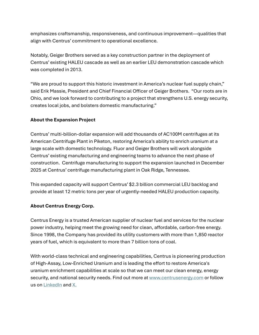 emphasizes craftsmanship, responsiveness, and continuous improvement—qualities that align with Centrus’ commitment to operational excellence. Notably, Geiger Brothers served as a key construction partner in the deployment of Centrus’ existing HALEU cascade as well as an earlier LEU demonstration cascade which was completed in 2013. “We are proud to support this historic investment in America’s nuclear fuel supply chain,” said Erik Massie, President and Chief Financial Officer of Geiger Brothers. “Our roots are in Ohio, and we look forward to contributing to a project that strengthens U.S. energy security, creates local jobs, and bolsters domestic manufacturing.” About the Expansion Project Centrus’ multi-billion-dollar expansion will add thousands of AC100M centrifuges at its American Centrifuge Plant in Piketon, restoring America’s ability to enrich uranium at a large scale with domestic technology. Fluor and Geiger Brothers will work alongside Centrus’ existing manufacturing and engineering teams to advance the next phase of construction. Centrifuge manufacturing to support the expansion launched in December 2025 at Centrus’ centrifuge manufacturing plant in Oak Ridge, Tennessee. This expanded capacity will support Centrus’ $2.3 billion commercial LEU backlog and provide at least 12 metric tons per year of urgently-needed HALEU production capacity. About Centrus Energy Corp. Centrus Energy is a trusted American supplier of nuclear fuel and services for the nuclear power industry, helping meet the growing need for clean, affordable, carbon-free energy. Since 1998, the Company has provided its utility customers with more than 1,850 reactor years of fuel, which is equivalent to more than 7 billion tons of coal. With world-class technical and engineering capabilities, Centrus is pioneering production of High-Assay, Low-Enriched Uranium and is leading the effort to restore America's uranium enrichment capabilities at scale so that we can meet our clean energy, energy security, and national security needs. Find out more at www.centrusenergy.com or follow us on LinkedIn and X.