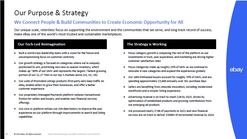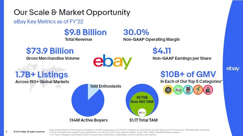 © 2023 eBay. All rights reserved. 4 Our Purpose & Strategy We Connect People & Build Communities to Create Economic Opportunity for All Our unique scale, relentless focus on supporting the environment and the communities that we serve, and long track record of suc cess, make eBay one of the world’s most trusted and sustainable marketplaces. Built a world - class leadership team with a vision for the future and uncompromising focus on customer centricity Our growth strategy is focused on categories where we’re uniquely positioned to win, prioritizing non - new - in - season inventory, which makes up ~90% of our GMV and represents the largest / fastest - growing portion of our $1.1T TAM in our top 3 markets alone (US, UK, DE) Our suite of Promoted Listings products (first - party ads) keep traffic on eBay, enable sellers to grow their businesses, and offer a better customer experience Our proprietary Managed Payments platform reduces transactional friction for sellers and buyers, and enables new financial services offerings Our core AI platform utilizes our rich data history to improve the user experience on our platform through improvements in search and listing capabilities Focus Category growth is outpacing the rest of the platform as our investments in trust, user experience, and marketing are driving higher customer satisfaction rates Focus Categories make up roughly 25% of GMV as we continue to innovate in new categories and expand the experiences globally Our 16M Enthusiast buyers account for roughly 70% of GMV, and are spending approximately $3,000 annually over 30+ purchase days Sellers are benefiting from sitewide innovation, including modernized storefronts and a simpler listing experience Advertising revenue is on track to reach $2B by 2025, driven by optimization of established products and growing contributions from our emerging ad products We processed nearly $74B of payments in 2022 and new financial services are on track to deliver $300M of incremental revenue by 2024 Our Tech - Led Reimagination The Strategy is Working Note: Enthusiast Buyers and GMV contribution as of 12/31/22.