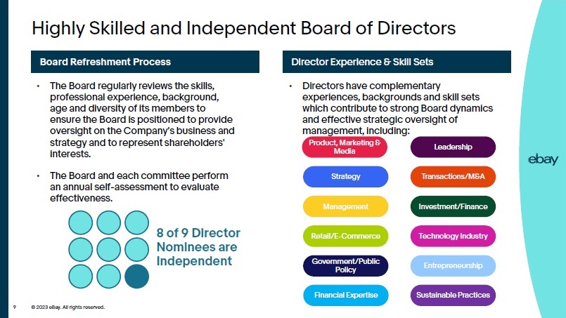 © 2023 eBay. All rights reserved. 9 Director Experience & Skill Sets Board Refreshment Process Highly Skilled and Independent Board of Directors • The Board regularly reviews the skills, professional experience, background, age and diversity of its members to ensure the Board is positioned to provide oversight on the Company's business and strategy and to represent shareholders' interests. • The Board and each committee perform an annual self - assessment to evaluate effectiveness. • Directors have complementary experiences, backgrounds and skill sets which contribute to strong Board dynamics and effective strategic oversight of management, including: 8 of 9 Director Nominees are Independent Product, Marketing & Media Leadership Strategy Transactions/M&A Management Investment/Finance Retail/E - Commerce Technology Industry Government/Public Policy Entrepreneurship Sustainable Practices Financial Expertise