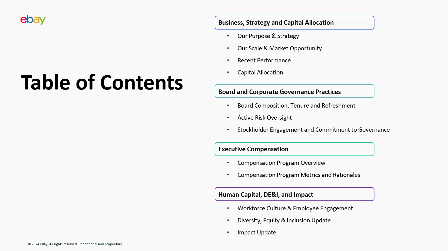 Table of Contents © 2024 eBay. All rights reserved. Confidential and proprietary. Business, Strategy and Capital Allocation Our Purpose & Strategy Our Scale & Market Opportunity Recent Performance Capital Allocation Board and Corporate Governance Practices Board Composition, Tenure and Refreshment Active Risk Oversight Stockholder Engagement and Commitment to Governance Executive Compensation Compensation Program Overview Compensation Program Metrics and Rationales Human Capital, DE&I, and Impact Workforce Culture & Employee Engagement Diversity, Equity & Inclusion Update Impact Update
