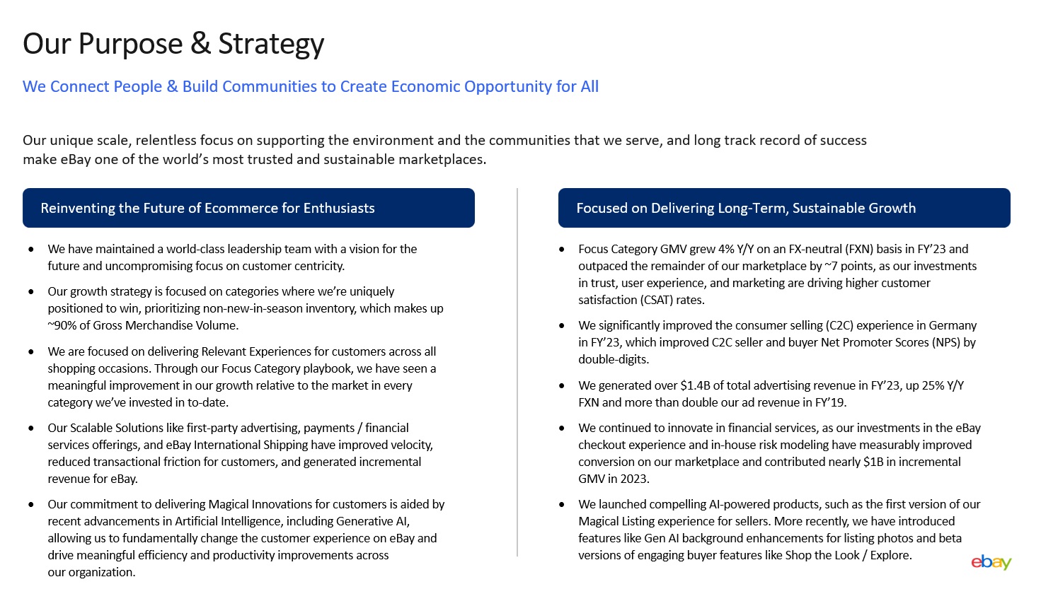 Our Purpose & Strategy We Connect People & Build Communities to Create Economic Opportunity for All Our unique scale, relentless focus on supporting the environment and the communities that we serve, and long track record of success make eBay one of the world’s most trusted and sustainable marketplaces. Reinventing the Future of Ecommerce for Enthusiasts We have maintained a world-class leadership team with a vision for the future and uncompromising focus on customer centricity. Our growth strategy is focused on categories where we’re uniquely positioned to win, prioritizing non-new-in-season inventory, which makes up ~90% of Gross Merchandise Volume. We are focused on delivering Relevant Experiences for customers across all shopping occasions. Through our Focus Category playbook, we have seen a meaningful improvement in our growth relative to the market in every category we’ve invested in to-date. Our Scalable Solutions like first-party advertising, payments / financial services offerings, and eBay International Shipping have improved velocity, reduced transactional friction for customers, and generated incremental revenue for eBay. Our commitment to delivering Magical Innovations for customers is aided by recent advancements in Artificial Intelligence, including Generative AI, allowing us to fundamentally change the customer experience on eBay and drive meaningful efficiency and productivity improvements across our organization. Focused on Delivering Long-Term, Sustainable Growth Focus Category GMV grew 4% Y/Y on an FX-neutral (FXN) basis in FY’23 and outpaced the remainder of our marketplace by ~7 points, as our investments in trust, user experience, and marketing are driving higher customer satisfaction (CSAT) rates. We significantly improved the consumer selling (C2C) experience in Germany in FY’23, which improved C2C seller and buyer Net Promoter Scores (NPS) by double-digits. We generated over $1.4B of total advertising revenue in FY’23, up 25% Y/Y FXN and more than double our ad revenue in FY’19. We continued to innovate in financial services, as our investments in the eBay checkout experience and in-house risk modeling have measurably improved conversion on our marketplace and contributed nearly $1B in incremental GMV in 2023. We launched compelling AI-powered products, such as the first version of our Magical Listing experience for sellers. More recently, we have introduced features like Gen AI background enhancements for listing photos and beta versions of engaging buyer features like Shop the Look / Explore.