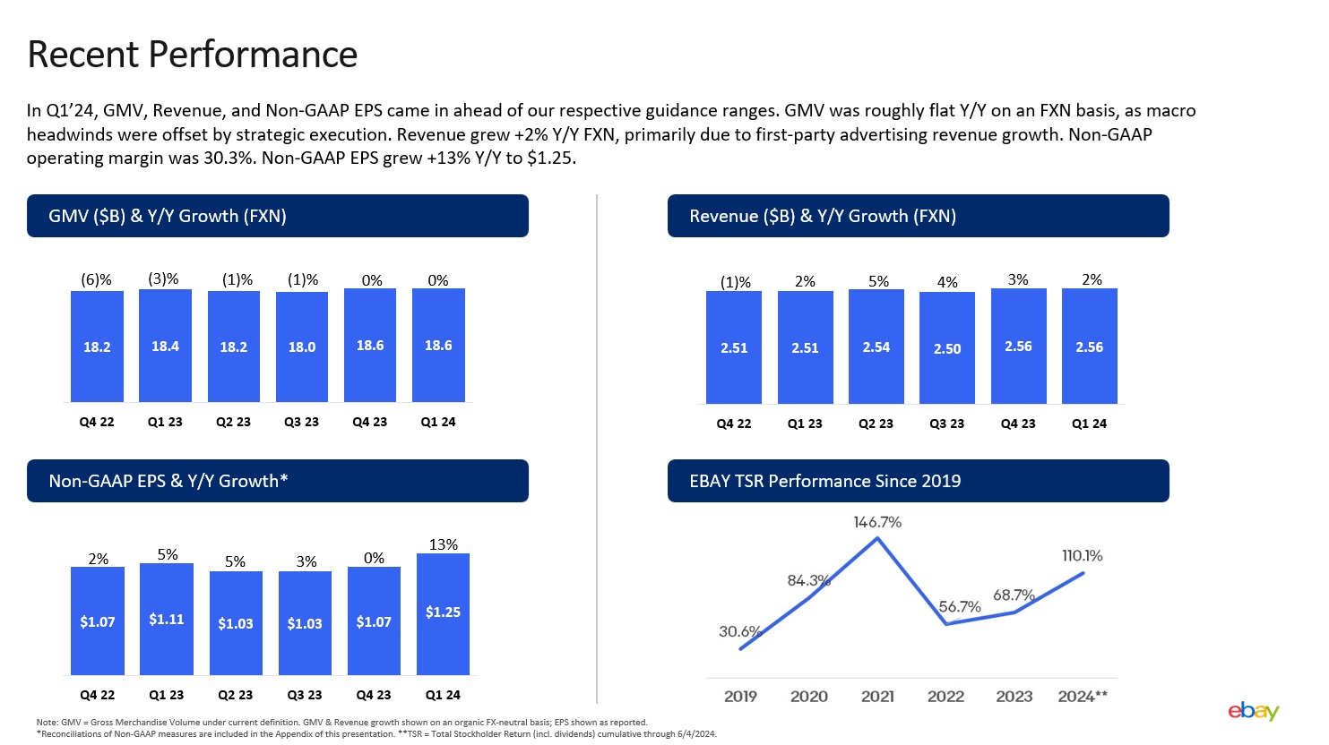 Recent Performance GMV ( $ B) & Y/Y Growth (FXN ) Revenue ($B) & Y/Y Growth (FXN) In Q1’24, GMV, Revenue, and Non - GAAP EPS came in ahead of our respective guidance ranges . GMV was roughly flat Y/Y on an FXN basis, as macro headwinds were offset by strategic execution. Revenue grew +2% Y/Y FXN, primarily due to first - party advertising revenue growth. Non - GAAP operating margin was 30.3%. Non - GAAP EPS grew +13% Y/Y to $1.25. Non - GAAP EPS & Y/Y Growth* EBAY TSR Performance Since 2019 $1.07 $1.11 $1.03 $1.03 $1.07 $1.25 Q4 22 Q1 23 Q2 23 Q3 23 Q4 23 Q1 24 0% 3% 2 % 5% 5% 2.51 2.51 2.54 2.50 2.56 2.56 Q4 22 Q1 23 Q2 23 Q3 23 Q4 23 Q1 24 2 % 5% 4% 3% 2% (1)% 18.2 18.4 18.2 18.0 18.6 18.6 Q4 22 Q1 23 Q2 23 Q3 23 Q4 23 Q1 24 (3) % (1)% (1)% 0 % 0 % ( 6 )% Note: GMV = Gross Merchandise Volume under current definition. GMV & Revenue growth shown on an organic FX - neutral basis; EPS sh own as reported. * Reconciliations of Non - GAAP measures are included in the Appendix of this presentation. **TSR = Total Stockholder Return (incl. dividends) cumulative till 6/4/2024. 13%