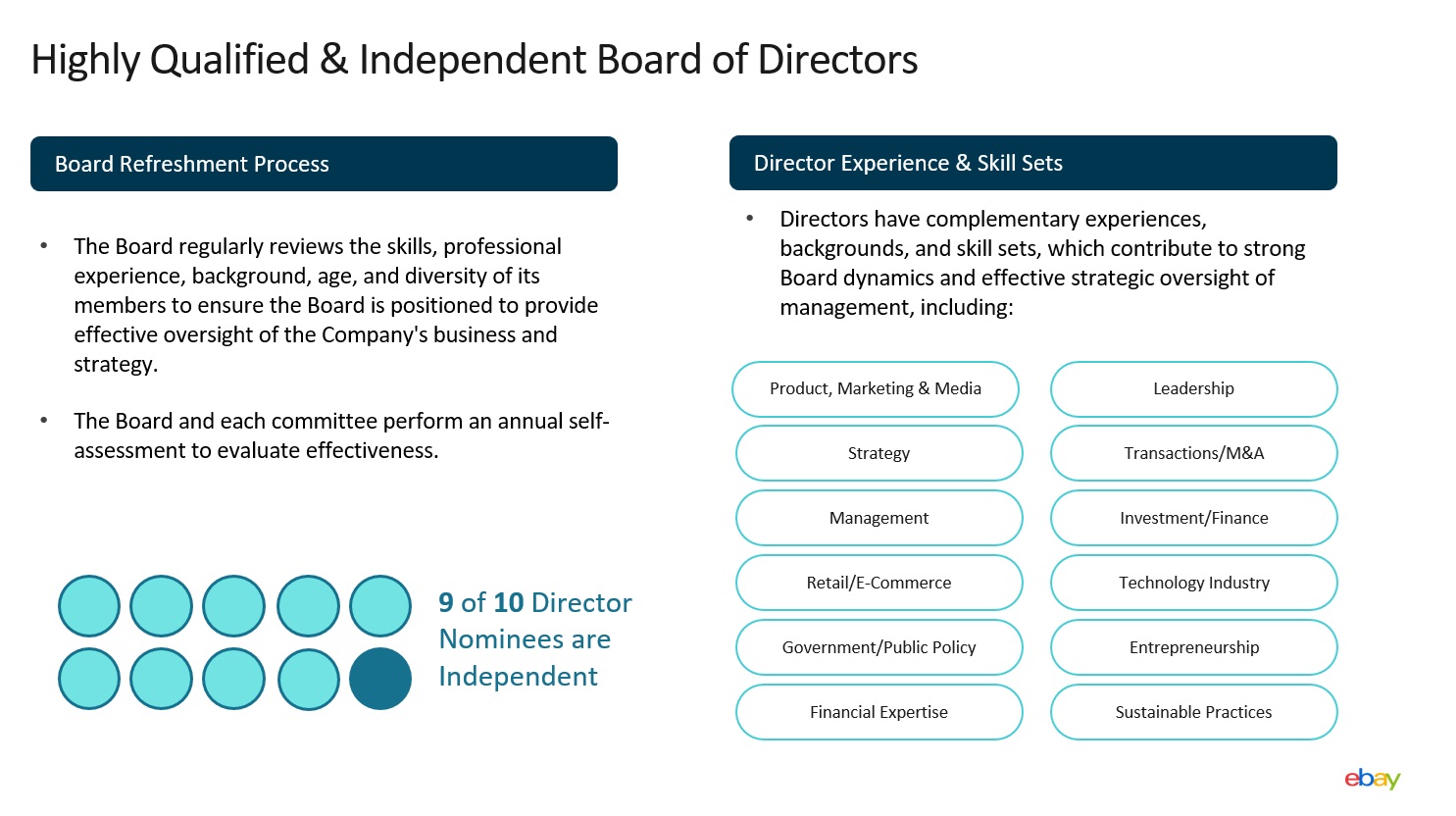 Separate Chair and CEO roles Independent Chair with robust responsibilities Simple majority vote standard for bylaw/charter amendments and transactions Clawback policy Stock ownership requirements for our executive officers and directors Anti - hedging and anti - pledging policies Strong Board independence (9 of 10 director nominees are independent) Annually elected Board with all members standing for election each year Majority vote standard for uncontested director elections with a director resignation policy Stockholder right to request eBay to call a special meeting Proxy access bylaws Strong stockholder engagement practices Stockholder Engagement and Commitment to Governance • We maintain a robust dialogue with stockholders and routinely engage with stockholders to seek feedback, which is thoughtfull y c onsidered and in recent years has led management and our Board to make modifications to our governance, executive compensation, and disclosure practices. • Since January 2023, we have offered to meet on sustainability, governance, compensation, capital allocation, and other matter s w ith approximately 53 investors representing approximately 68% of our outstanding shares, which resulted in approximately 18 conference calls with investors rep resenting more than 36% of our outstanding shares. • We are committed to being responsive to stockholders to promote strong governance and compensation practices.