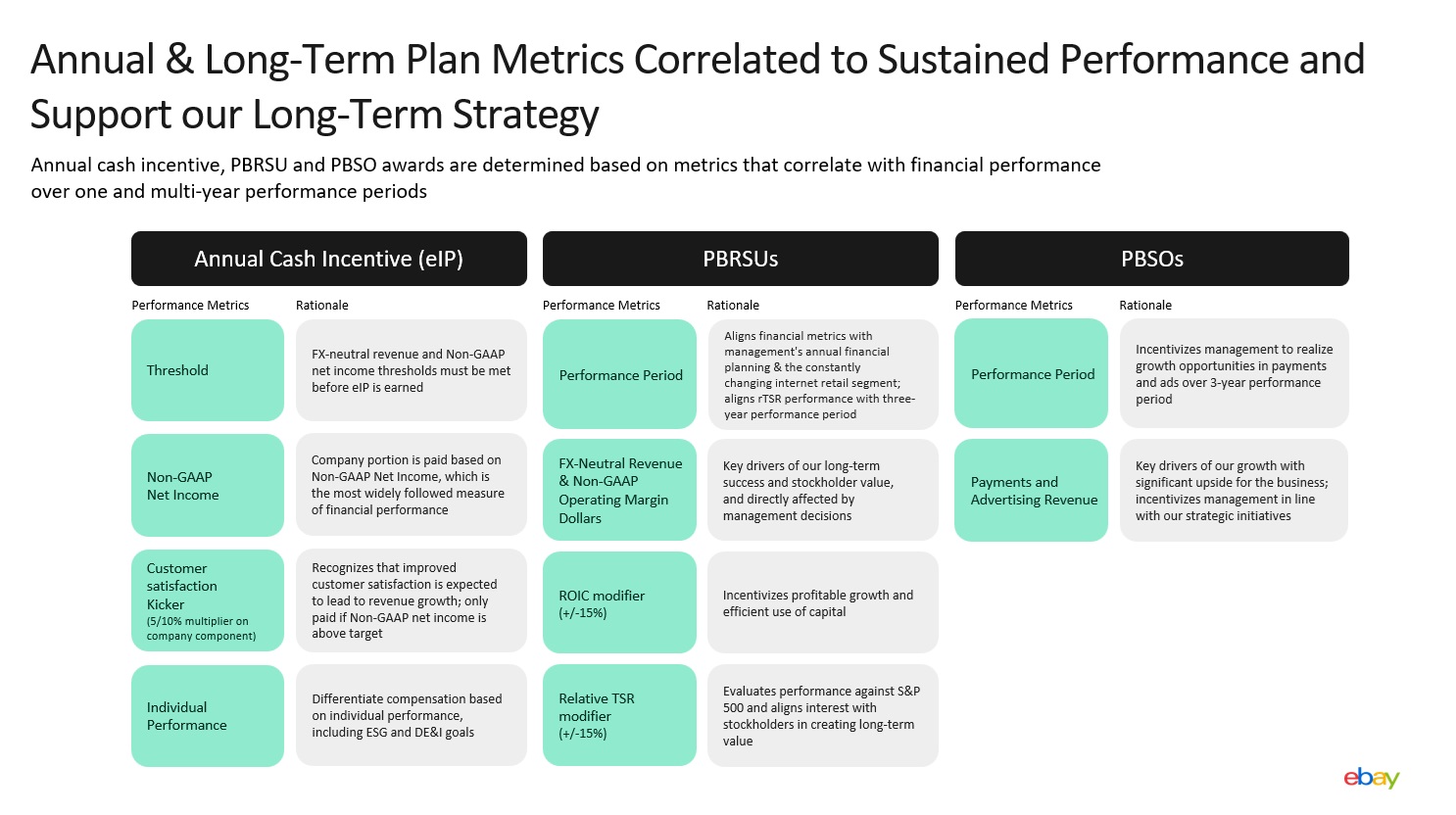 Performance - Based Compensation Program Drives Long - Term Stockholder Returns Rigorous Goal and Target Setting Process • In the first quarter of the year, the Compensation and Human Capital Committee approves Company performance measures based on business criteria and target levels of performance for the annual bonus program ( eIP ), performance - based restricted stock unit awards (PBRSUs), and performance - based stock option awards (PBSOs). • For eIP and PBRSUs, targets are set based primarily on the Company’s Board - approved budget for the year. For PBSOs granted in 2023, targets were set based on achievable goals with strong management performance that delivers on our Payments and Ads Revenue G oal s. • For 2023, we selected financial metrics and targets that the Compensation and Human Capital Committee believes incentivize ou r management team to achieve our strategic objectives and drive eBay’s financial performance and long - term stock performance. • 2023 financial metrics included FX - neutral revenue, non - GAAP operating margin dollars, return on invested capital, non - GAAP net income, relative total shareholder return (S&P 500), and revenue from Payments and Advertising. EJ0
