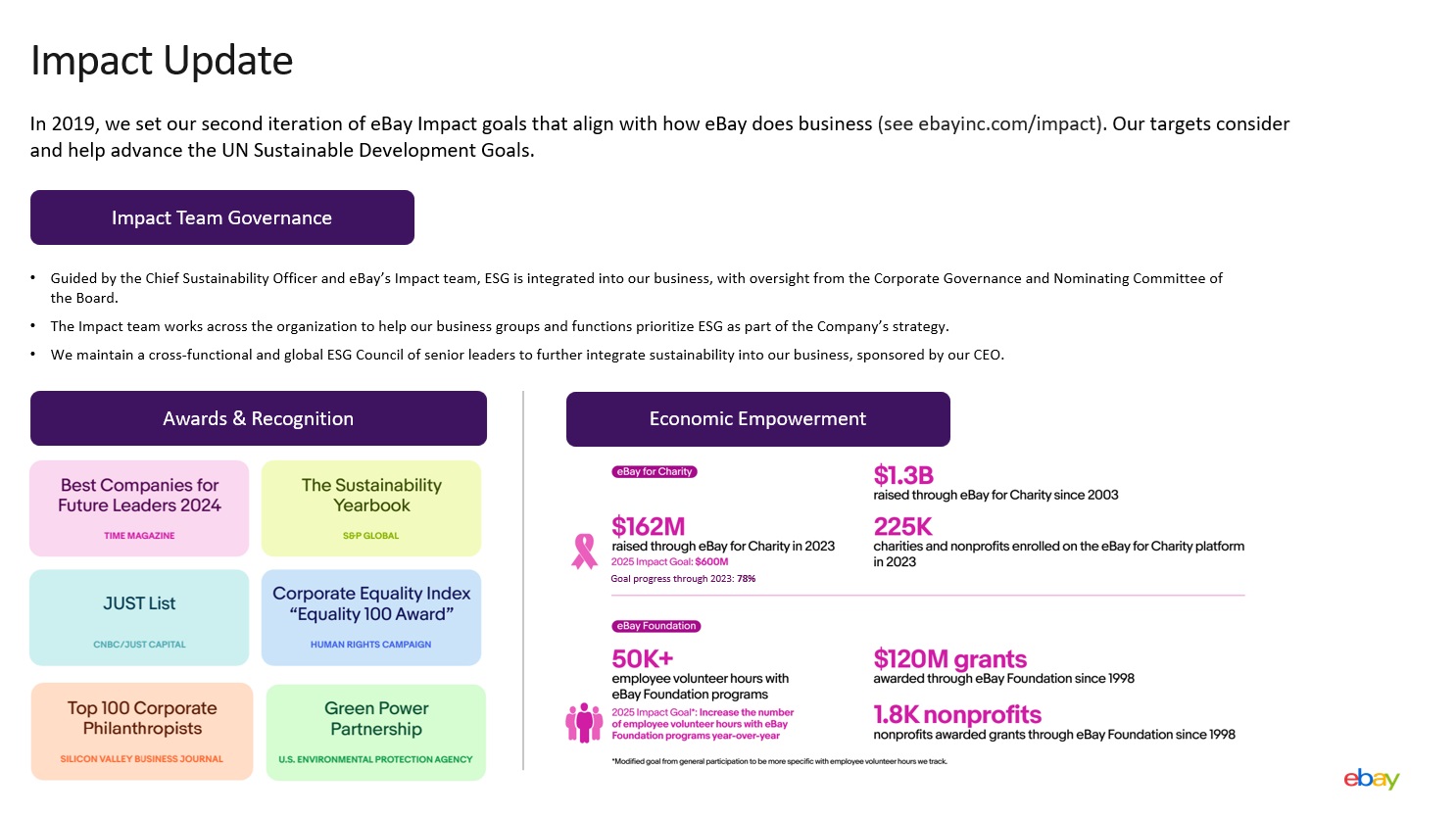 Impact Update • Guided by the Chief Sustainability Officer and eBay’s Impact team, ESG is integrated into our business, with oversight from t he Corporate Governance and Nominating Committee of the Board. • The Impact team works across the organization to help our business groups and functions prioritize ESG as part of the Company ’s strategy. • We maintain a cross - functional and global ESG Council of senior leaders to further integrate sustainability into our business, s ponsored by our CEO. In 2019, we set our second iteration of eBay Impact goals that align with how eBay does business ( see ebayinc.com/impact ). Our targets consider and help advance the UN Sustainable Development Goals. Impact Team Governance Awards & Recognition Economic Empowerment Goal progress through 2023 : 78%