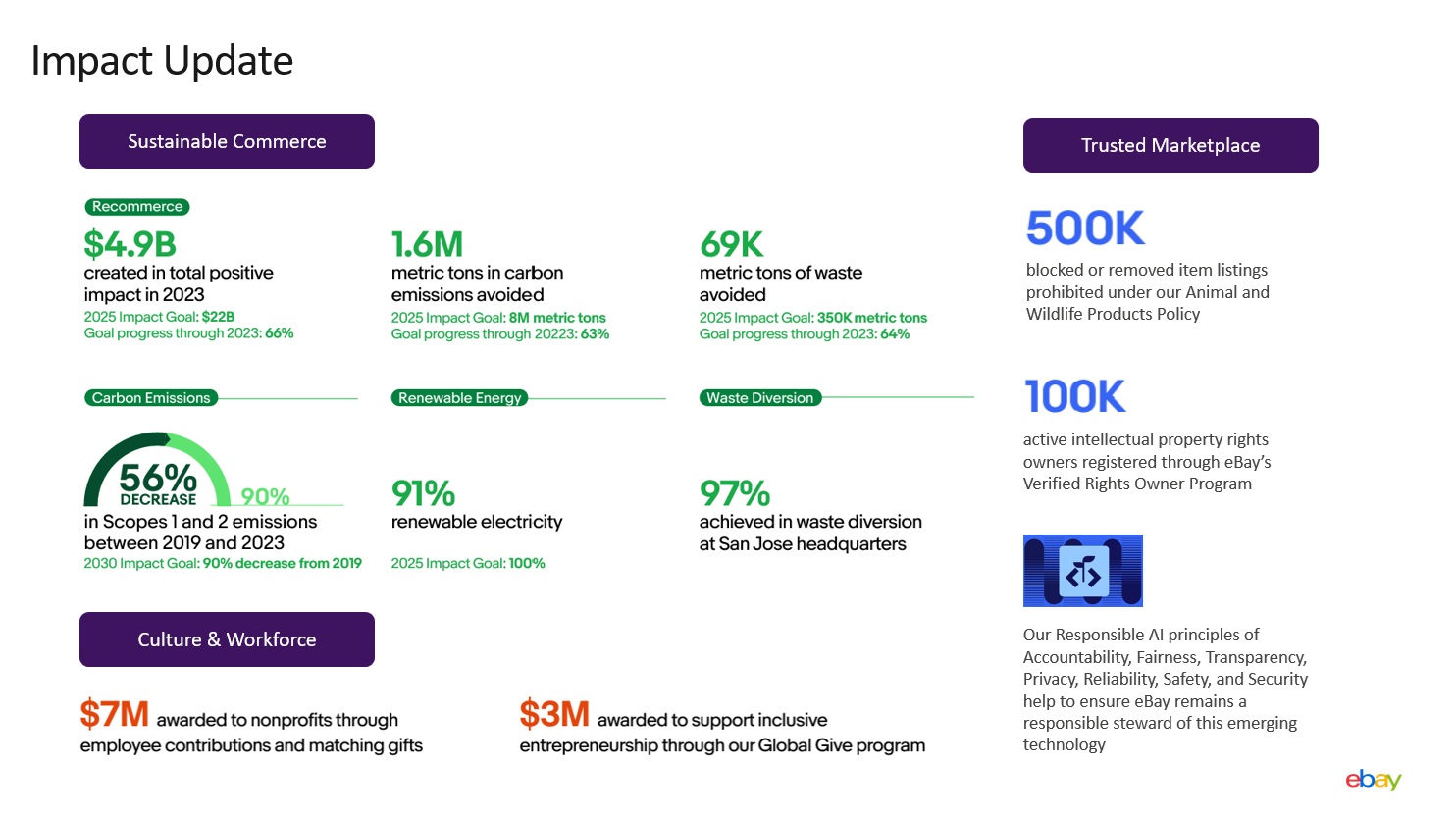 Impact Update Sustainable Commerce Trusted Marketplace blocked or removed item listings prohibited under our Animal and Wildlife Products Policy active intellectual property rights owners registered through eBay’s Verified Rights Owner Program Culture & Workforce Our Responsible AI principles of Accountability, Fairness, Transparency, Privacy, Reliability, Safety, and Security help to ensure eBay remains a responsible steward of this emerging technology