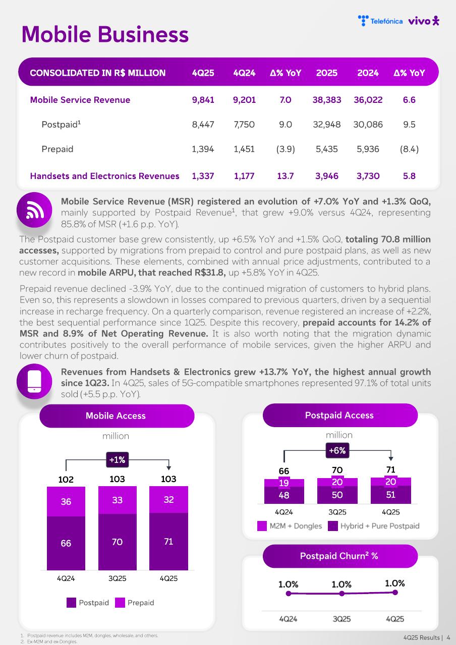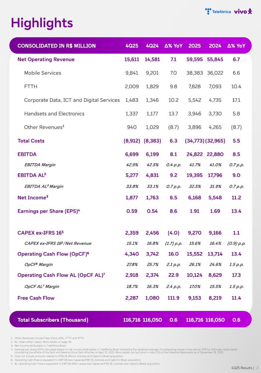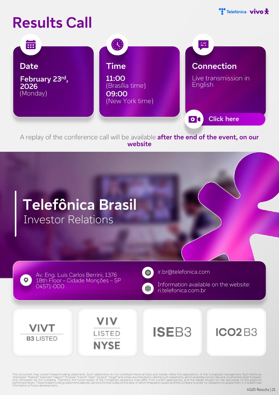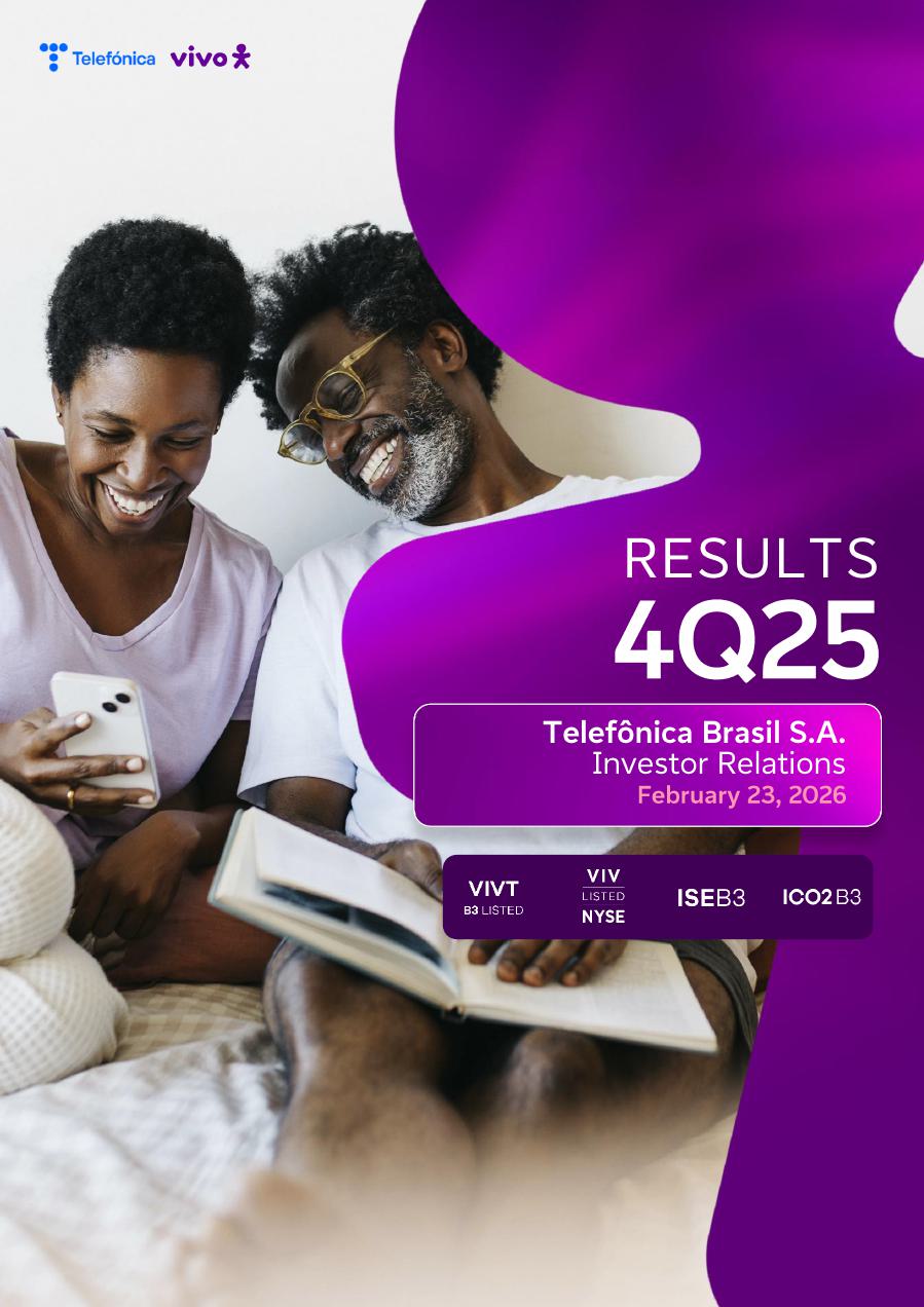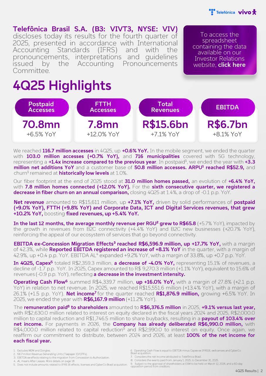 RESULTS 4Q25 Telefônica Brasil S.A.Investor Relations February 23, 2026 4Q25 Results | Telefônica Brasil S.A. (B3: VIVT 3, NYSE : VIV) discloses today its results for the fourth quarter of 2025, presented in accordance with International Accounting Standards (IFRS) and with the pronouncements, interpretations and guidelines issued by the Accounting Pronouncements Committee . Background Pattern AI-generated content may be incorrect. To access the spreadsheet containing the data available on our Investor Relations website, click here 4Q25 Highlights Postpaid Accesses 70.8mn +6.5% YoY FTTH Accesses 7.8mn +12.0% YoY Total Revenues R$15.6bn +7.1% YoY EBITDA R$6.7bn +8.1% YoY 1. Excludes M2M and Dongles. 2. 56.7 million Revenue Generating Units (Taxpayer ID/CPFs). 3. EBITDA ex -effects relating to the migration from Concession to Authorization. 4. AL means After Leases. More details on page 18. 5. Does not include amounts related to IFRS 16 effects, licenses and CyberCo Brasil acquisition. We reached 116.7 million accesses in 4Q25, up +0 .6% YoY . In the mobile segment, we ended the quarter with 103 .0 million accesses (+0 .7% YoY), and 716 municipalities covered with 5G technology, representing a +1.4x increase compared to the previous year . In postpaid¹, we ended the year with +3.3 million net additions YoY and a customer base of 50 .8 million accesses . ARPU¹ reached R$52.9, and churn¹ remained at historically low levels at 1.0%. Our fiber footprint at the end of 2025 stood at 31.0 million homes passed, an evolution of +6.4% YoY, with 7.8 million homes connected (+12.0% YoY) . For the sixth consecutive quarter, we registered a decrease in fiber churn on an annual comparison, closing 4Q25 at 1.4%, a drop of -0 .1 p.p. YoY . Net revenue amounted to R$15,611 million, up +7.1% YoY, driven by solid performances of postpaid (+9.0% YoY), FTTH (+9.8% YoY) and Corporate Data, ICT and Digital Services revenues, that grew +10.2% YoY, boosting fixed revenues, up +5.4% YoY . In the last 12 months, the average monthly revenue per RGU² grew to R$65.8 (+5.7% YoY), impacted by the growth in revenues from B2C connectivity (+4.4% YoY) and B2C new businesses (+20.7% YoY), reinforcing the appeal of our ecosystem of services that go beyond connectivity . EBITDA ex-Concession Migration Effects³ reached R$6,596 .9 million, up +17.7% YoY, with a margin of 42.3%, while Reported EBITDA registered an increase of +8.1% YoY in the quarter, with a margin of 42.9%, up +0.4 p.p. YoY . EBITDA AL 4 expanded +9.2% YoY, with a margin of 33.8%, up +0.7 p.p. YoY . In 4Q25, Capex 5 totaled R$2,359.3 million, a decrease of -4.0% YoY, representing 15.1% of revenues, a decline of -1.7 p.p. YoY . In 2025, Capex amounted to R$ 9,270.3 million (+1.1% YoY), equivalent to 15.6% of revenues (-0 .9 p.p. YoY), reflecting a decrease in the investment intensity . Operating Cash Flow 6 summed R$4,339 .7 million, up +16.0% YoY, with a margin of 27.8% (+2.1 p.p. YoY) in relation to net revenue . In 2025, we reached R$15,551.6 million (+13.4% YoY), with a margin of 26.1% (+1.5 p.p. YoY) . Net income 7 for the quarter reached R$1,876 .9 million, growing +6.5% YoY . In 2025, we ended the year with R$6,167.9 million (+11.2% YoY) . The remuneration paid 8 to shareholders amounted to R$6,376.5 million in 2025, +9.1% versus last year, with R$2,630 .0 million related to interest on equity declared in the fiscal years 2024 and 2025, R$2,000 .0 million to capital reduction and R$1,746.5 million to share buybacks, resulting in a payout of 103 .4% over net income . For payments in 2026, the Company has already deliberated R$6,990 .0 million, with R$4,000 .0 million related to capital reduction 9 and R$2,990 .0 to interest on equity . Once again, we reaffirm our commitment to distribute, between 2024 and 2026, at least 100 % of the net income for each fiscal year . 2 6. Operating Cash Flow is equal to EBITDA minus Capex ex -IFRS16, ex -licenses and CyberCo Brasil acquisition. 7. Considers the net income attributed to Telefônica Brasil. 8. Considers the events paid from January 1, 2025, to December 31, 2025. 9. Subject to the approval of shareholders at ESM to be held on March 12, 2026, and a 60 -day opposition period from creditors. 4Q25 Results | 1. Other Revenues include Fixed Voice, xDSL , FTTC and IPTV. 2. AL means After Leases. More details on page 18. 3. Net Income attributable to Telefônica Brasil. 4. Earnings per share (EPS) calculated based on net income attributable to Telefônica Brasil divided by the weighted average of outstanding shares in the period, EPS for 2024 was recalculated considering the effects of the Split and Reverse Stock Split effective on April 15, 2025. More details can be found in note 2 3.i) of the Financial Statements as of December 31, 2025. 5. Does not include amounts related to IFRS 16 effects, licenses and CyberCo Brasil acquisition. 6. Operating Cash Flow is equivalent to EBITDA less Capex ex -IFRS 16, licenses and CyberCo Brasil acquisition. 7. AL Operating Cash Flow is equivalent to EBITDA After Leases less Capex ex -IFRS 16, licenses and CyberCo Brasil acquisition . Highlights 3 4Q25 Results | Mobile Business Mobile Service Revenue (MSR) registered an evolution of +7.0% YoY and +1.3% QoQ, mainly supported by Postpaid Revenue¹, that grew +9.0% versus 4Q24, representing 85.8% of MSR (+1.6 p.p. YoY) . Prepaid revenue declined -3.9% YoY, due to the continued migration of customers to hybrid plans . Even so, this represents a slowdown in losses compared to previous quarters, driven by a sequential increase in recharge frequency . On a quarterly comparison, revenue registered an increase of +2.2%, the best sequential performance since 1Q25. Despite this recovery, prepaid accounts for 14.2% of MSR and 8.9% of Net Operating Revenue . It is also worth noting that the migration dynamic contributes positively to the overall performance of mobile services, given the higher ARPU and lower churn of postpaid . Revenues fr