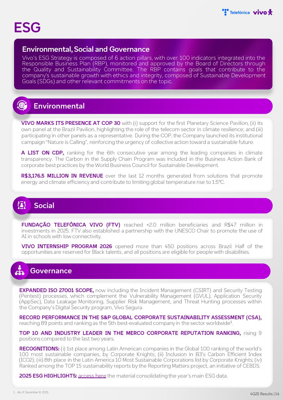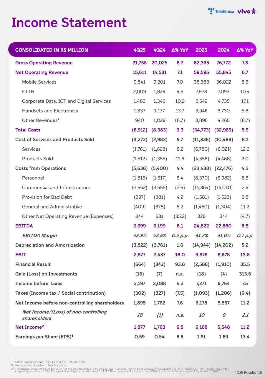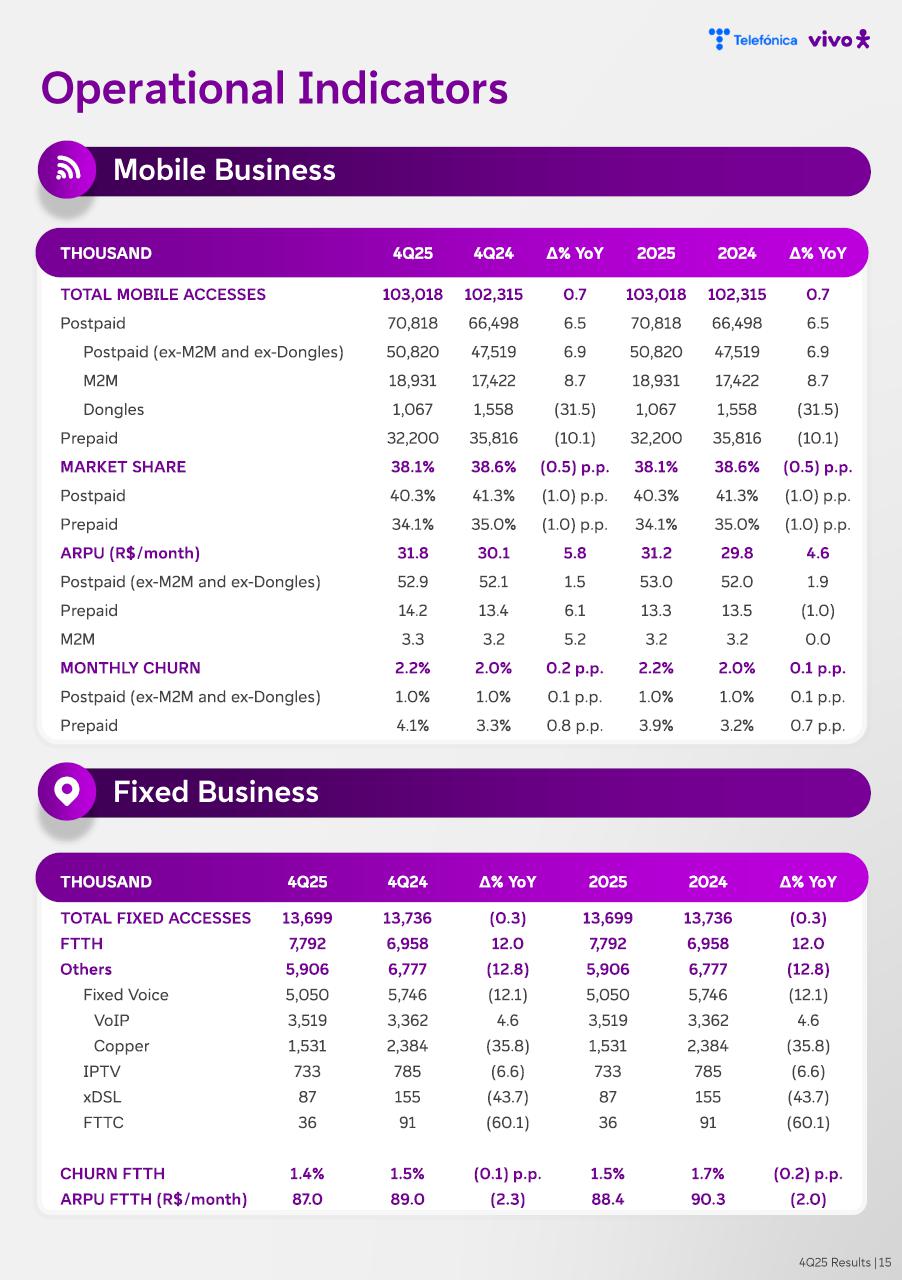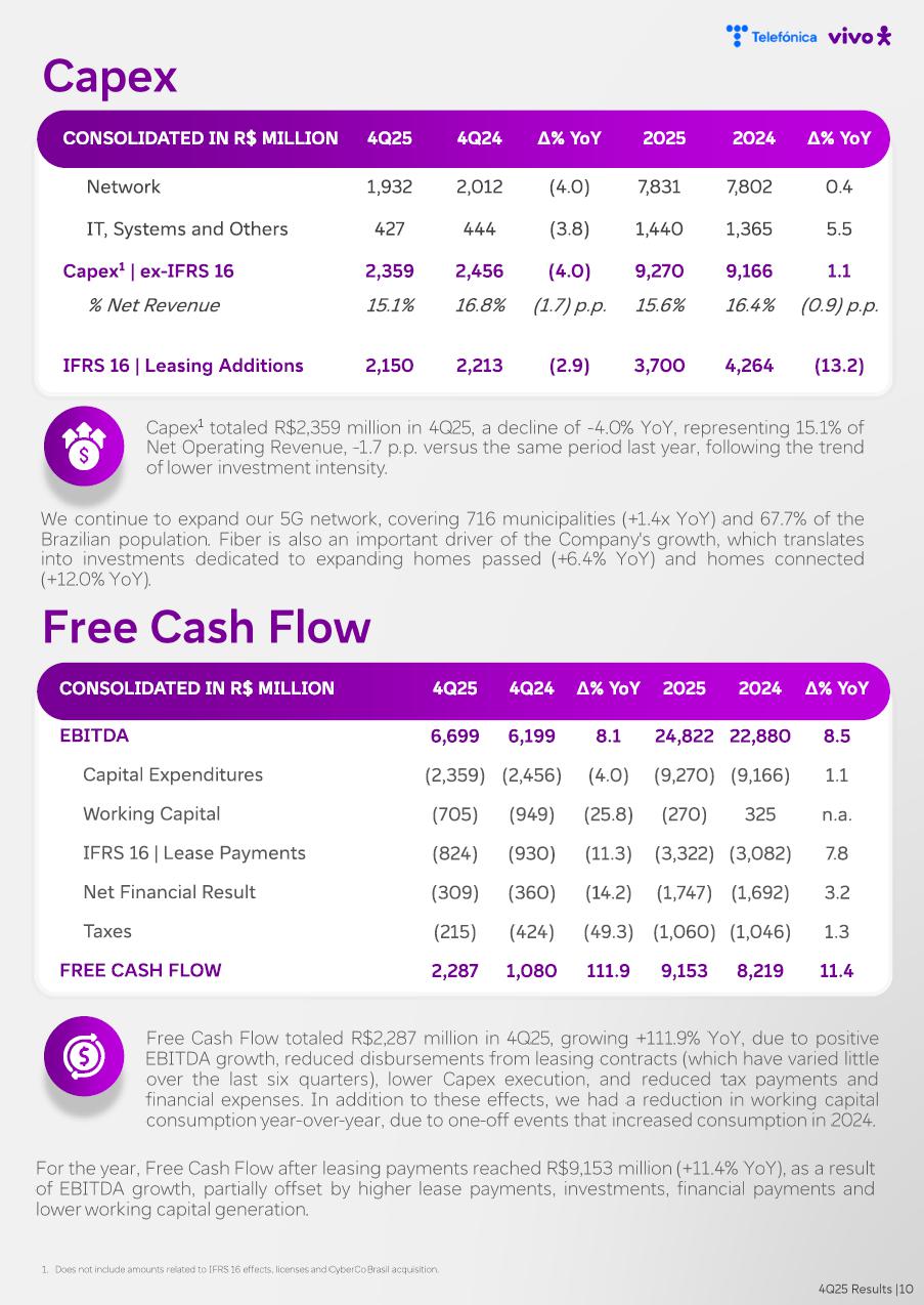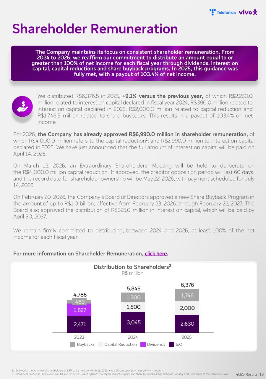 RESULTS 4Q25 Telefônica Brasil S.A.Investor Relations February 23, 2026 4Q25 Results | Telefônica Brasil S.A. (B3: VIVT 3, NYSE : VIV) discloses today its results for the fourth quarter of 2025, presented in accordance with International Accounting Standards (IFRS) and with the pronouncements, interpretations and guidelines issued by the Accounting Pronouncements Committee . Background Pattern AI-generated content may be incorrect. To access the spreadsheet containing the data available on our Investor Relations website, click here 4Q25 Highlights Postpaid Accesses 70.8mn +6.5% YoY FTTH Accesses 7.8mn +12.0% YoY Total Revenues R$15.6bn +7.1% YoY EBITDA R$6.7bn +8.1% YoY 1. Excludes M2M and Dongles. 2. 56.7 million Revenue Generating Units (Taxpayer ID/CPFs). 3. EBITDA ex -effects relating to the migration from Concession to Authorization. 4. AL means After Leases. More details on page 18. 5. Does not include amounts related to IFRS 16 effects, licenses and CyberCo Brasil acquisition. We reached 116.7 million accesses in 4Q25, up +0 .6% YoY . In the mobile segment, we ended the quarter with 103 .0 million accesses (+0 .7% YoY), and 716 municipalities covered with 5G technology, representing a +1.4x increase compared to the previous year . In postpaid¹, we ended the year with +3.3 million net additions YoY and a customer base of 50 .8 million accesses . ARPU¹ reached R$52.9, and churn¹ remained at historically low levels at 1.0%. Our fiber footprint at the end of 2025 stood at 31.0 million homes passed, an evolution of +6.4% YoY, with 7.8 million homes connected (+12.0% YoY) . For the sixth consecutive quarter, we registered a decrease in fiber churn on an annual comparison, closing 4Q25 at 1.4%, a drop of -0 .1 p.p. YoY . Net revenue amounted to R$15,611 million, up +7.1% YoY, driven by solid performances of postpaid (+9.0% YoY), FTTH (+9.8% YoY) and Corporate Data, ICT and Digital Services revenues, that grew +10.2% YoY, boosting fixed revenues, up +5.4% YoY . In the last 12 months, the average monthly revenue per RGU² grew to R$65.8 (+5.7% YoY), impacted by the growth in revenues from B2C connectivity (+4.4% YoY) and B2C new businesses (+20.7% YoY), reinforcing the appeal of our ecosystem of services that go beyond connectivity . EBITDA ex-Concession Migration Effects³ reached R$6,596 .9 million, up +17.7% YoY, with a margin of 42.3%, while Reported EBITDA registered an increase of +8.1% YoY in the quarter, with a margin of 42.9%, up +0.4 p.p. YoY . EBITDA AL 4 expanded +9.2% YoY, with a margin of 33.8%, up +0.7 p.p. YoY . In 4Q25, Capex 5 totaled R$2,359.3 million, a decrease of -4.0% YoY, representing 15.1% of revenues, a decline of -1.7 p.p. YoY . In 2025, Capex amounted to R$ 9,270.3 million (+1.1% YoY), equivalent to 15.6% of revenues (-0 .9 p.p. YoY), reflecting a decrease in the investment intensity . Operating Cash Flow 6 summed R$4,339 .7 million, up +16.0% YoY, with a margin of 27.8% (+2.1 p.p. YoY) in relation to net revenue . In 2025, we reached R$15,551.6 million (+13.4% YoY), with a margin of 26.1% (+1.5 p.p. YoY) . Net income 7 for the quarter reached R$1,876 .9 million, growing +6.5% YoY . In 2025, we ended the year with R$6,167.9 million (+11.2% YoY) . The remuneration paid 8 to shareholders amounted to R$6,376.5 million in 2025, +9.1% versus last year, with R$2,630 .0 million related to interest on equity declared in the fiscal years 2024 and 2025, R$2,000 .0 million to capital reduction and R$1,746.5 million to share buybacks, resulting in a payout of 103 .4% over net income . For payments in 2026, the Company has already deliberated R$6,990 .0 million, with R$4,000 .0 million related to capital reduction 9 and R$2,990 .0 to interest on equity . Once again, we reaffirm our commitment to distribute, between 2024 and 2026, at least 100 % of the net income for each fiscal year . 2 6. Operating Cash Flow is equal to EBITDA minus Capex ex -IFRS16, ex -licenses and CyberCo Brasil acquisition. 7. Considers the net income attributed to Telefônica Brasil. 8. Considers the events paid from January 1, 2025, to December 31, 2025. 9. Subject to the approval of shareholders at ESM to be held on March 12, 2026, and a 60 -day opposition period from creditors. 4Q25 Results | 1. Other Revenues include Fixed Voice, xDSL , FTTC and IPTV. 2. AL means After Leases. More details on page 18. 3. Net Income attributable to Telefônica Brasil. 4. Earnings per share (EPS) calculated based on net income attributable to Telefônica Brasil divided by the weighted average of outstanding shares in the period, EPS for 2024 was recalculated considering the effects of the Split and Reverse Stock Split effective on April 15, 2025. More details can be found in note 2 3.i) of the Financial Statements as of December 31, 2025. 5. Does not include amounts related to IFRS 16 effects, licenses and CyberCo Brasil acquisition. 6. Operating Cash Flow is equivalent to EBITDA less Capex ex -IFRS 16, licenses and CyberCo Brasil acquisition. 7. AL Operating Cash Flow is equivalent to EBITDA After Leases less Capex ex -IFRS 16, licenses and CyberCo Brasil acquisition . Highlights 3 4Q25 Results | Mobile Business Mobile Service Revenue (MSR) registered an evolution of +7.0% YoY and +1.3% QoQ, mainly supported by Postpaid Revenue¹, that grew +9.0% versus 4Q24, representing 85.8% of MSR (+1.6 p.p. YoY) . Prepaid revenue declined -3.9% YoY, due to the continued migration of customers to hybrid plans . Even so, this represents a slowdown in losses compared to previous quarters, driven by a sequential increase in recharge frequency . On a quarterly comparison, revenue registered an increase of +2.2%, the best sequential performance since 1Q25. Despite this recovery, prepaid accounts for 14.2% of MSR and 8.9% of Net Operating Revenue . It is also worth noting that the migration dynamic contributes positively to the overall performance of mobile services, given the higher ARPU and lower churn of postpaid . Revenues fr