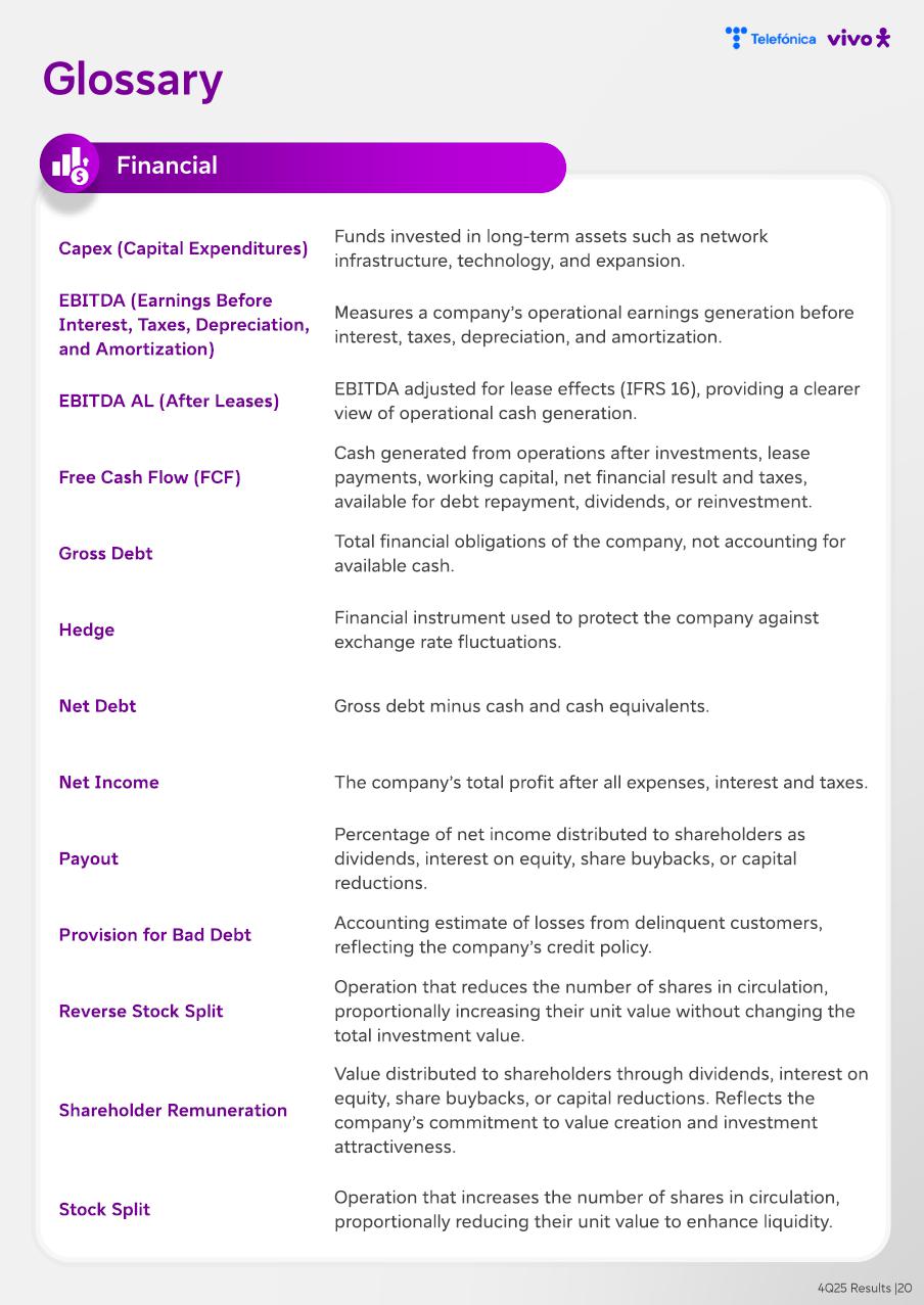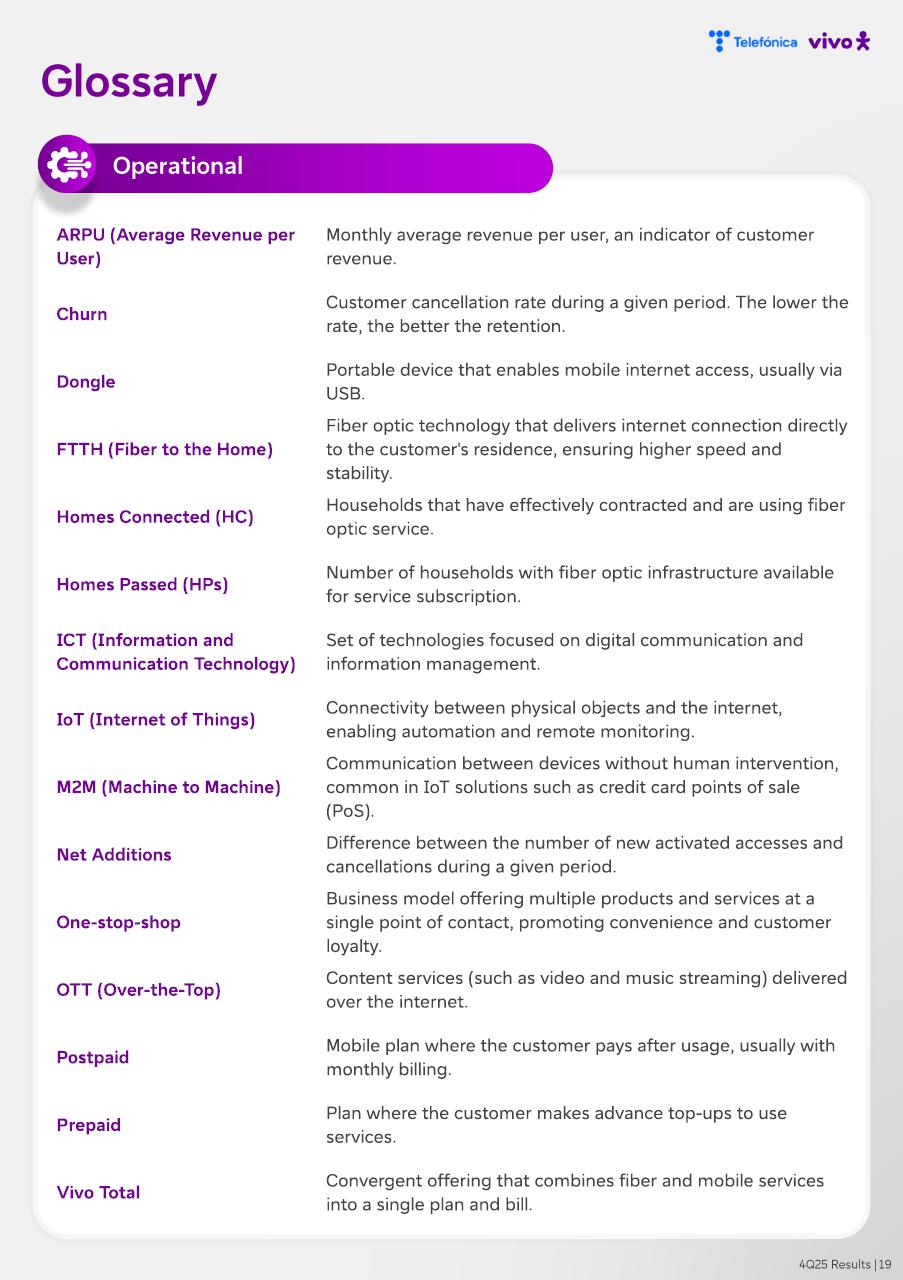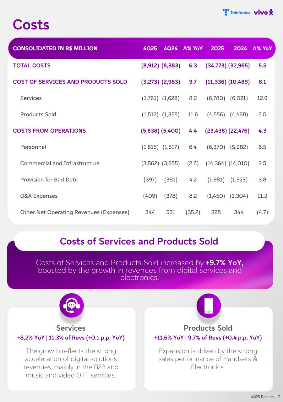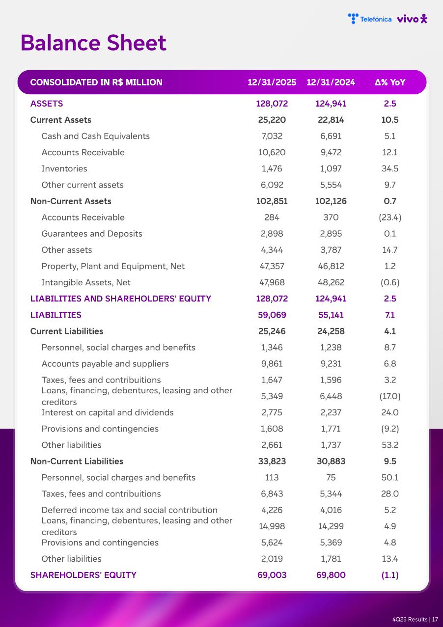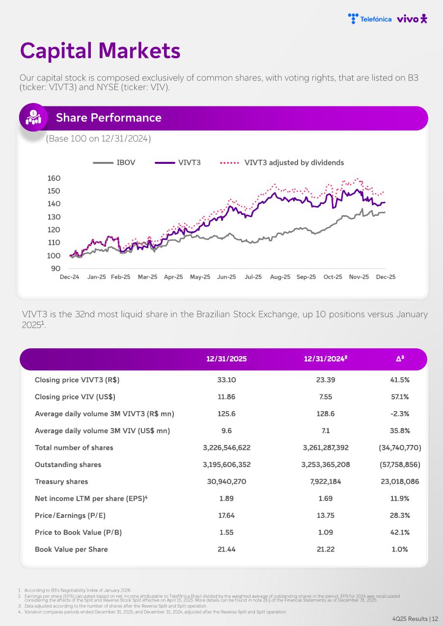 RESULTS 4Q25 Telefônica Brasil S.A.Investor Relations February 23, 2026 4Q25 Results | Telefônica Brasil S.A. (B3: VIVT 3, NYSE : VIV) discloses today its results for the fourth quarter of 2025, presented in accordance with International Accounting Standards (IFRS) and with the pronouncements, interpretations and guidelines issued by the Accounting Pronouncements Committee . Background Pattern AI-generated content may be incorrect. To access the spreadsheet containing the data available on our Investor Relations website, click here 4Q25 Highlights Postpaid Accesses 70.8mn +6.5% YoY FTTH Accesses 7.8mn +12.0% YoY Total Revenues R$15.6bn +7.1% YoY EBITDA R$6.7bn +8.1% YoY 1. Excludes M2M and Dongles. 2. 56.7 million Revenue Generating Units (Taxpayer ID/CPFs). 3. EBITDA ex -effects relating to the migration from Concession to Authorization. 4. AL means After Leases. More details on page 18. 5. Does not include amounts related to IFRS 16 effects, licenses and CyberCo Brasil acquisition. We reached 116.7 million accesses in 4Q25, up +0 .6% YoY . In the mobile segment, we ended the quarter with 103 .0 million accesses (+0 .7% YoY), and 716 municipalities covered with 5G technology, representing a +1.4x increase compared to the previous year . In postpaid¹, we ended the year with +3.3 million net additions YoY and a customer base of 50 .8 million accesses . ARPU¹ reached R$52.9, and churn¹ remained at historically low levels at 1.0%. Our fiber footprint at the end of 2025 stood at 31.0 million homes passed, an evolution of +6.4% YoY, with 7.8 million homes connected (+12.0% YoY) . For the sixth consecutive quarter, we registered a decrease in fiber churn on an annual comparison, closing 4Q25 at 1.4%, a drop of -0 .1 p.p. YoY . Net revenue amounted to R$15,611 million, up +7.1% YoY, driven by solid performances of postpaid (+9.0% YoY), FTTH (+9.8% YoY) and Corporate Data, ICT and Digital Services revenues, that grew +10.2% YoY, boosting fixed revenues, up +5.4% YoY . In the last 12 months, the average monthly revenue per RGU² grew to R$65.8 (+5.7% YoY), impacted by the growth in revenues from B2C connectivity (+4.4% YoY) and B2C new businesses (+20.7% YoY), reinforcing the appeal of our ecosystem of services that go beyond connectivity . EBITDA ex-Concession Migration Effects³ reached R$6,596 .9 million, up +17.7% YoY, with a margin of 42.3%, while Reported EBITDA registered an increase of +8.1% YoY in the quarter, with a margin of 42.9%, up +0.4 p.p. YoY . EBITDA AL 4 expanded +9.2% YoY, with a margin of 33.8%, up +0.7 p.p. YoY . In 4Q25, Capex 5 totaled R$2,359.3 million, a decrease of -4.0% YoY, representing 15.1% of revenues, a decline of -1.7 p.p. YoY . In 2025, Capex amounted to R$ 9,270.3 million (+1.1% YoY), equivalent to 15.6% of revenues (-0 .9 p.p. YoY), reflecting a decrease in the investment intensity . Operating Cash Flow 6 summed R$4,339 .7 million, up +16.0% YoY, with a margin of 27.8% (+2.1 p.p. YoY) in relation to net revenue . In 2025, we reached R$15,551.6 million (+13.4% YoY), with a margin of 26.1% (+1.5 p.p. YoY) . Net income 7 for the quarter reached R$1,876 .9 million, growing +6.5% YoY . In 2025, we ended the year with R$6,167.9 million (+11.2% YoY) . The remuneration paid 8 to shareholders amounted to R$6,376.5 million in 2025, +9.1% versus last year, with R$2,630 .0 million related to interest on equity declared in the fiscal years 2024 and 2025, R$2,000 .0 million to capital reduction and R$1,746.5 million to share buybacks, resulting in a payout of 103 .4% over net income . For payments in 2026, the Company has already deliberated R$6,990 .0 million, with R$4,000 .0 million related to capital reduction 9 and R$2,990 .0 to interest on equity . Once again, we reaffirm our commitment to distribute, between 2024 and 2026, at least 100 % of the net income for each fiscal year . 2 6. Operating Cash Flow is equal to EBITDA minus Capex ex -IFRS16, ex -licenses and CyberCo Brasil acquisition. 7. Considers the net income attributed to Telefônica Brasil. 8. Considers the events paid from January 1, 2025, to December 31, 2025. 9. Subject to the approval of shareholders at ESM to be held on March 12, 2026, and a 60 -day opposition period from creditors. 4Q25 Results | 1. Other Revenues include Fixed Voice, xDSL , FTTC and IPTV. 2. AL means After Leases. More details on page 18. 3. Net Income attributable to Telefônica Brasil. 4. Earnings per share (EPS) calculated based on net income attributable to Telefônica Brasil divided by the weighted average of outstanding shares in the period, EPS for 2024 was recalculated considering the effects of the Split and Reverse Stock Split effective on April 15, 2025. More details can be found in note 2 3.i) of the Financial Statements as of December 31, 2025. 5. Does not include amounts related to IFRS 16 effects, licenses and CyberCo Brasil acquisition. 6. Operating Cash Flow is equivalent to EBITDA less Capex ex -IFRS 16, licenses and CyberCo Brasil acquisition. 7. AL Operating Cash Flow is equivalent to EBITDA After Leases less Capex ex -IFRS 16, licenses and CyberCo Brasil acquisition . Highlights 3 4Q25 Results | Mobile Business Mobile Service Revenue (MSR) registered an evolution of +7.0% YoY and +1.3% QoQ, mainly supported by Postpaid Revenue¹, that grew +9.0% versus 4Q24, representing 85.8% of MSR (+1.6 p.p. YoY) . Prepaid revenue declined -3.9% YoY, due to the continued migration of customers to hybrid plans . Even so, this represents a slowdown in losses compared to previous quarters, driven by a sequential increase in recharge frequency . On a quarterly comparison, revenue registered an increase of +2.2%, the best sequential performance since 1Q25. Despite this recovery, prepaid accounts for 14.2% of MSR and 8.9% of Net Operating Revenue . It is also worth noting that the migration dynamic contributes positively to the overall performance of mobile services, given the higher ARPU and lower churn of postpaid . Revenues fr