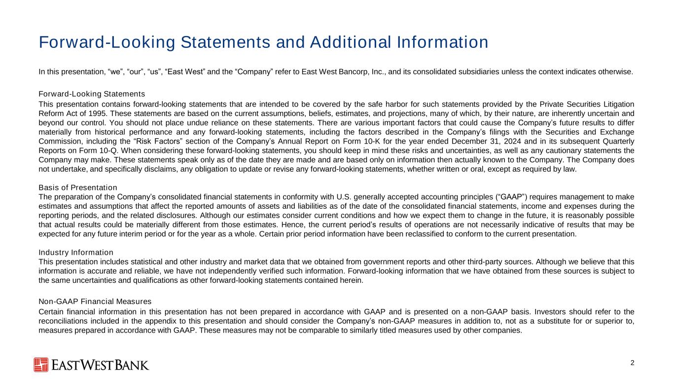 Forward-Looking Statements and Additional Information In this presentation, “we”, “our”, “us”, “East West” and the “Company” refer to East West Bancorp, Inc., and its consolidated subsidiaries unless the context indicates otherwise. Forward-Looking Statements This presentation contains forward-looking statements that are intended to be covered by the safe harbor for such statements provided by the Private Securities Litigation Reform Act of 1995. These statements are based on the current assumptions, beliefs, estimates, and projections, many of which, by their nature, are inherently uncertain and beyond our control. You should not place undue reliance on these statements. There are various important factors that could cause the Company’s future results to differ materially from historical performance and any forward-looking statements, including the factors described in the Company’s filings with the Securities and Exchange Commission, including the “Risk Factors” section of the Company’s Annual Report on Form 10-K for the year ended December 31, 2024 and in its subsequent Quarterly Reports on Form 10-Q. When considering these forward-looking statements, you should keep in mind these risks and uncertainties, as well as any cautionary statements the Company may make. These statements speak only as of the date they are made and are based only on information then actually known to the Company. The Company does not undertake, and specifically disclaims, any obligation to update or revise any forward-looking statements, whether written or oral, except as required by law. Basis of Presentation The preparation of the Company’s consolidated financial statements in conformity with U.S. generally accepted accounting principles (“GAAP”) requires management to make estimates and assumptions that affect the reported amounts of assets and liabilities as of the date of the consolidated financial statements, income and expenses during the reporting periods, and the related disclosures. Although our estimates consider current conditions and how we expect them to change in the future, it is reasonably possible that actual results could be materially different from those estimates. Hence, the current period’s results of operations are not necessarily indicative of results that may be expected for any future interim period or for the year as a whole. Certain prior period information have been reclassified to conform to the current presentation. Industry Information This presentation includes statistical and other industry and market data that we obtained from government reports and other third-party sources. Although we believe that this information is accurate and reliable, we have not independently verified such information. Forward-looking information that we have obtained from these sources is subject to the same uncertainties and qualifications as other forward-looking statements contained herein. Non-GAAP Financial Measures Certain financial information in this presentation has not been prepared in accordance with GAAP and is presented on a non-GAAP basis. Investors should refer to the reconciliations included in the appendix to this presentation and should consider the Company’s non-GAAP measures in addition to, not as a substitute for or superior to, measures prepared in accordance with GAAP. These measures may not be comparable to similarly titled measures used by other companies. 2