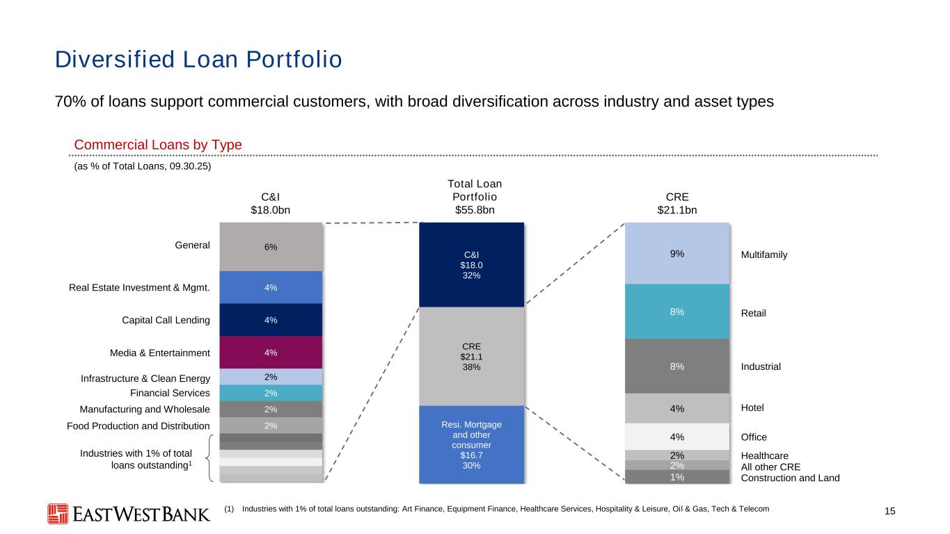 East West at a Glance 14 (1) See reconciliation of GAAP to non-GAAP financial measures in the appendix and in the Company’s earnings press release ~$15B Market Cap $80B Assets $67B Deposits 18% ROTCE1 09.30.25 09.30.25 09.30.25 3Q25 ▪ Headquartered in Pasadena, California ▪ Over 25 years on Nasdaq ▪ Founded in 1973 - over 50 years in operation Roots in the U.S. Asian-American immigrant community, expanded to bridge businesses across the Pacific Award-winning Company #1 Top Performing Bank in 2025, $50+ Billion (Bank Director), marking our 3rd consecutive year Top 3 Performing Banks in 2025, $50+ Billion (American Banker) A Leading Regional Bank with Cross-Border Capabilities... …Well Positioned in Dense, Attractive Markets… TX NY NV CA WA MA GA Key Markets IL