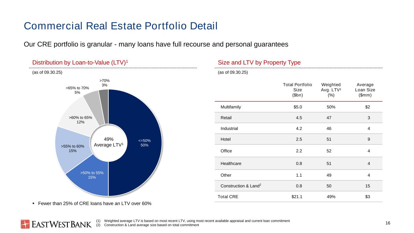 1% 2% 2% 4% 4% 8% 8% 9% 2% 2% 2% 2% 4% 4% 4% 6% Resi. Mortgage and other consumer $16.7 30% CRE $21.1 38% C&I $18.0 32% (as % of Total Loans, 09.30.25) Commercial Loans by Type Diversified Loan Portfolio 15 70% of loans support commercial customers, with broad diversification across industry and asset types (1) Industries with 1% of total loans outstanding: Art Finance, Equipment Finance, Healthcare Services, Hospitality & Leisure, Oil & Gas, Tech & Telecom Industries with 1% of total loans outstanding1 CRE $21.1bn C&I $18.0bn Total Loan Portfolio $55.8bn Media & Entertainment Capital Call Lending Real Estate Investment & Mgmt. Infrastructure & Clean Energy General Industrial Multifamily Retail Hotel Office All other CRE Healthcare Construction and Land Manufacturing and Wholesale Financial Services Food Production and Distribution