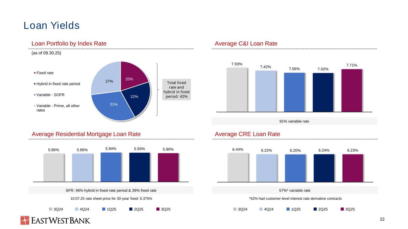$12.3 $13.8 $14.7 $15.4 $15.5 $5.4 $5.0 $4.5 $4.1 $5.3 $17.7 $18.8 $19.2 $19.5 $20.8 4.03% 3.98% 4.08% 4.02% 4.05% 2.00% 2.50% 3.00% 3.50% 4.00% 4.50% 5.00% 5.50% 6.00% 6.50% 7.00% $(3.0) $2.0 $7.0 $12.0 $17.0 $22.0 3Q24 4Q24 1Q25 2Q25 3Q25 Total Securities Cash, Equivalent & Resale Agreements Total Securities Average Yield $0.5 $0.1 $4.3 $10.7 100% RWA 50% RWA 20% RWA 0% RWA Average Total Securities Portfolio and Cash Cash and Securities 21 Incrementally bolstered on balance sheet liquidity with cash and high-quality liquid assets (HQLA) ($ in billions) ▪ Securities portfolio well-positioned as a source of liquidity, interest rate risk management, and earnings support − Total securities average yield up 3bps Q-o-Q − 96% of investment portfolio 0% - 20% risk-weighted (HQLA) − 60% fixed-rate securities, 40% floating Highlights Securities Portfolio Composition by Risk-Weighted Asset (RWA) Distribution ($ in billions, as of 09.30.25) $15.6bn Securities Portfolio