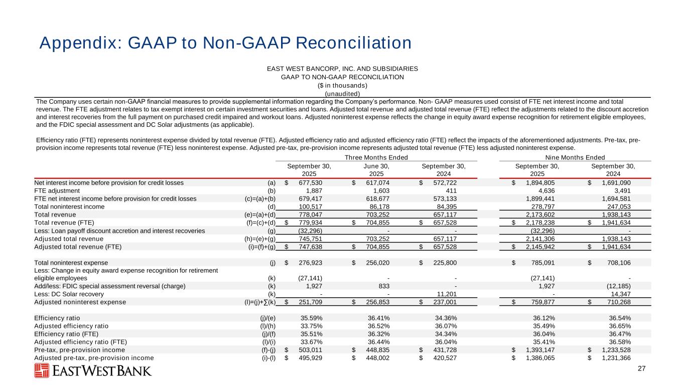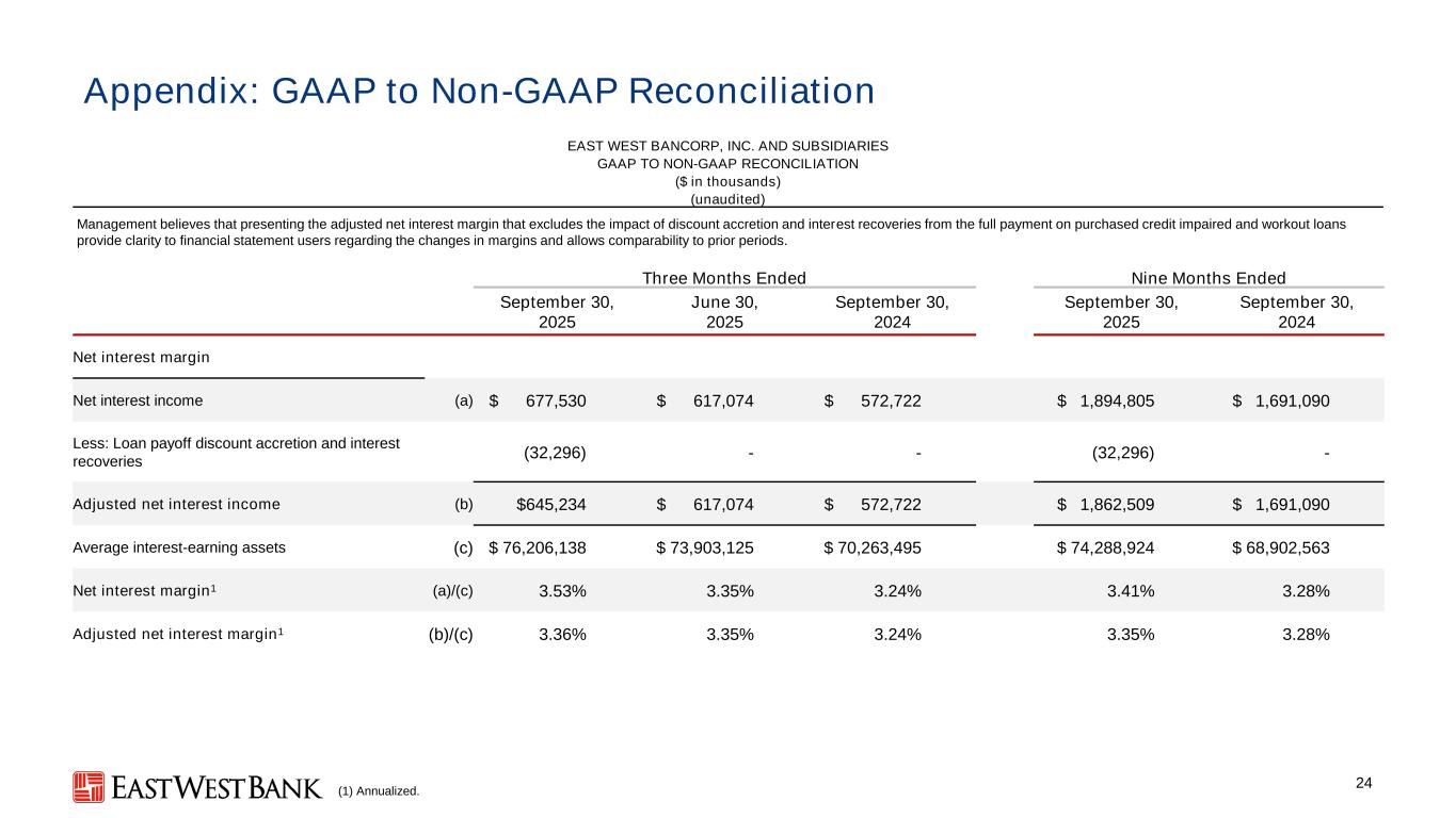 Appendix: GAAP to Non-GAAP Reconciliation 24 EAST WEST BANCORP, INC. AND SUBSIDIARIES GAAP TO NON-GAAP RECONCILIATION ($ in thousands) (unaudited) Management believes that presenting the adjusted net interest margin that excludes the impact of discount accretion and interest recoveries from the full payment on purchased credit impaired and workout loans provide clarity to financial statement users regarding the changes in margins and allows comparability to prior periods. Three Months Ended Nine Months Ended September 30, 2025 June 30, 2025 September 30, 2024 September 30, 2025 September 30, 2024 Net interest margin Net interest income (a) $ 677,530 $ 617,074 $ 572,722 $ 1,894,805 $ 1,691,090 Less: Loan payoff discount accretion and interest recoveries (32,296) - - (32,296) - Adjusted net interest income (b) $645,234 $ 617,074 $ 572,722 $ 1,862,509 $ 1,691,090 Average interest-earning assets (c) $ 76,206,138 $ 73,903,125 $ 70,263,495 $ 74,288,924 $ 68,902,563 Net interest margin1 (a)/(c) 3.53% 3.35% 3.24% 3.41% 3.28% Adjusted net interest margin1 (b)/(c) 3.36% 3.35% 3.24% 3.35% 3.28% (1) Annualized.